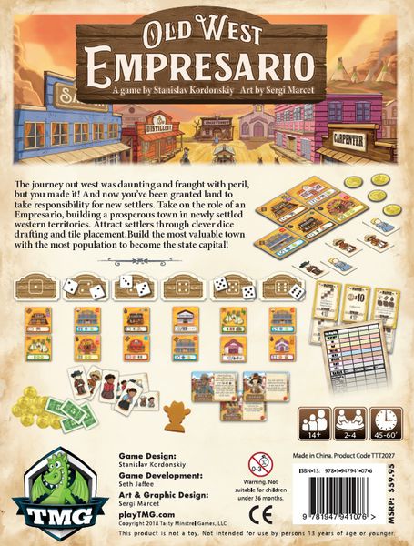 In Old West Empresario, you take on the role of an empresario, building a prosperous town in newly settled western territories. Attract settlers through clever dice drafting and tile placement. Build the most valuable town with the most population to become the state capital!
