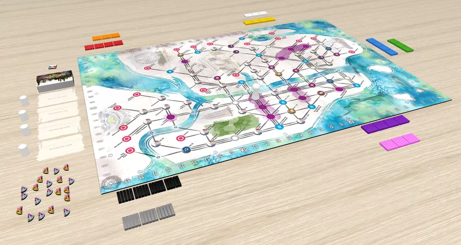 Paris is a thoughtful map offering many options. To win, you need to strike the right balance between collecting sets of tokens, connecting secret destinations, blocking other players while not being blocked yourself, and of course carrying the passenger. Paris is the refined elder sister of the original On the Underground: London map and is recommended for experienced players.