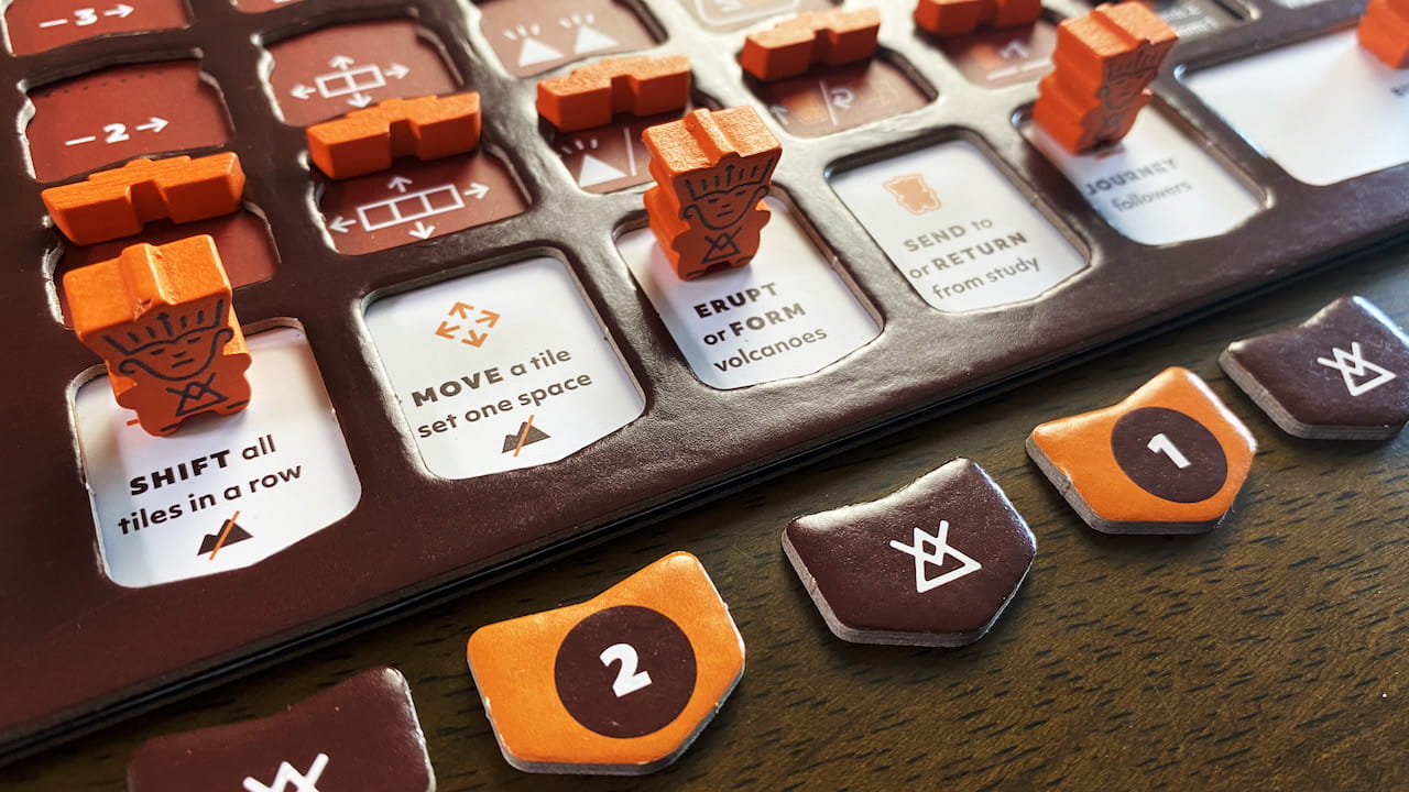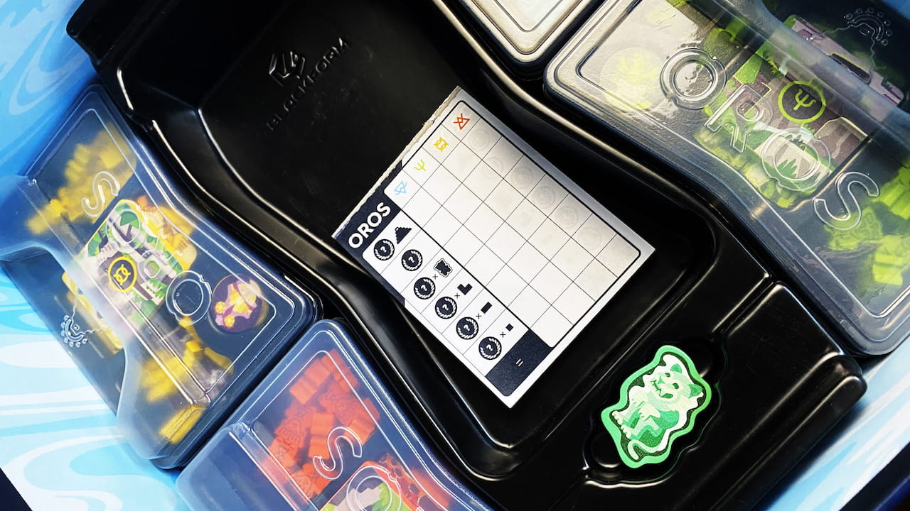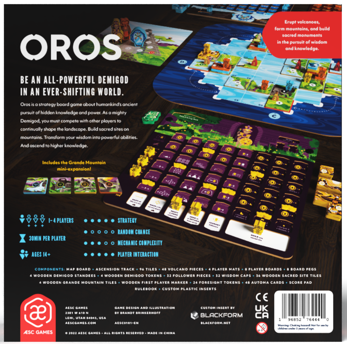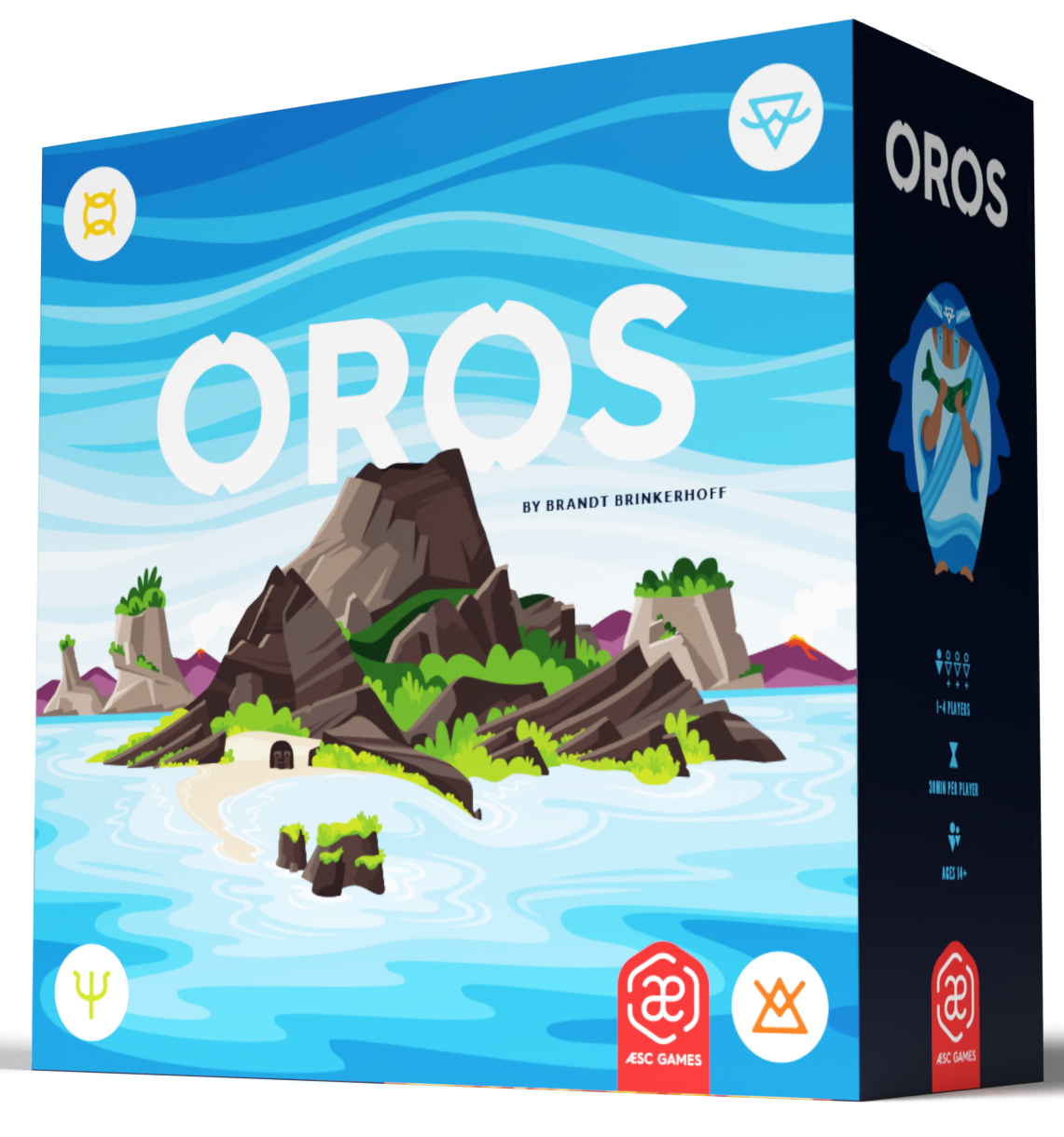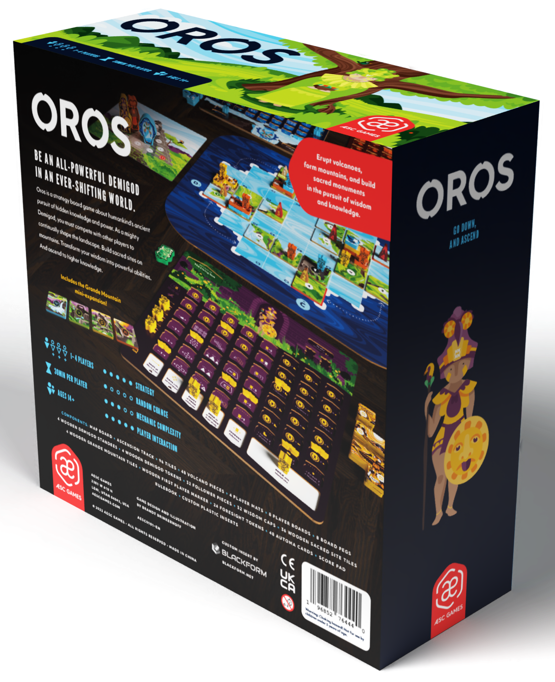 Oros is a tile-colliding, volcano erupting, mountain-making, wisdom-gathering, action-economy strategy game. On individual player mats, players move their Followers between action spaces, allowing them to manipulate a shared environment like a giant puzzle of plate tectonics. Action spaces allow players to shift rows of land, move and collide land tiles, form and erupt volcanoes, worship to gain wisdom, journey their Followers around the ever-shifting landscape, and build sacred places of study and worship on mountains.