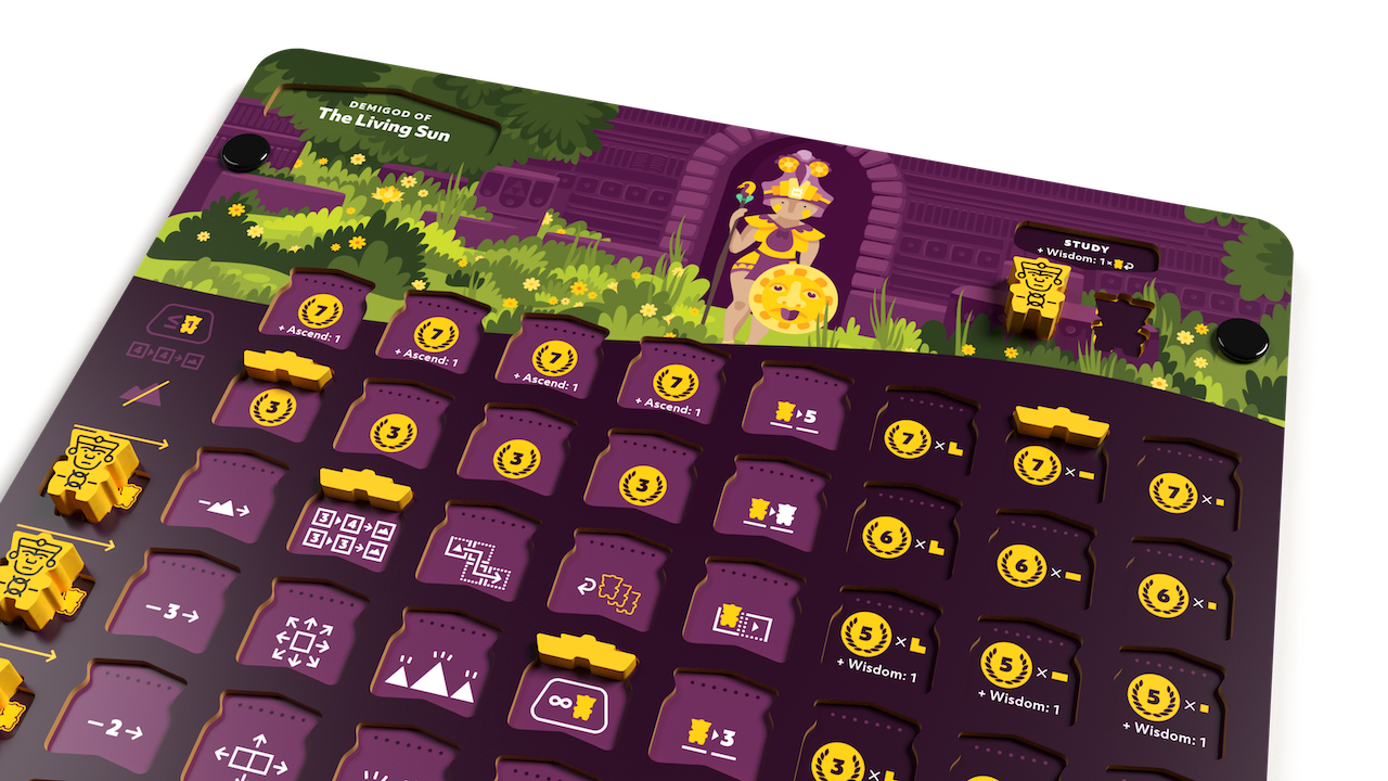 When building sacred places, the Demigods of the Wise One ascend a ziggurat which acts as a timer toward the end of the game. When one reaches the top, players finish the round and then tally a final score.