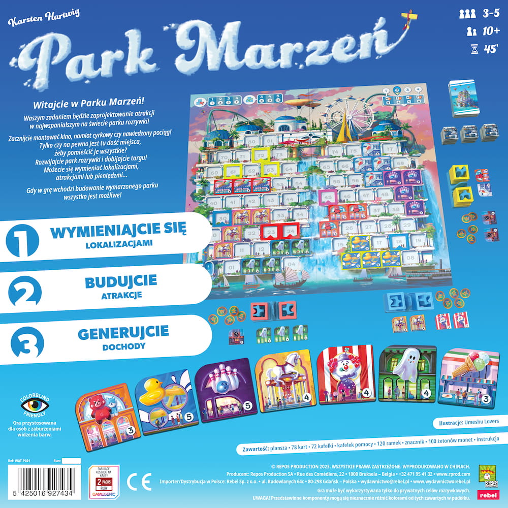 Witajcie w Parku Marzeń! W tej strategicznej grze negocjacyjnej będziecie starali się zaprojektować atrakcje w najwspanialszym na świecie parku rozrywki. Każde z Was ma głowę pełną pomysłów: karuzele, namioty cyrkowe, sklepy z pamiątkami… Jednak przestrzeń jest ograniczona i może nie pomieścić wszystkich atrakcji! Wymieniajcie się z innymi pomysłami, zarezerwowanym miejscem i pieniędzmi, rozwijajcie park, a przy tym spróbujcie zarobić jak najwięcej. W krainie marzeń wszystko jest możliwe!