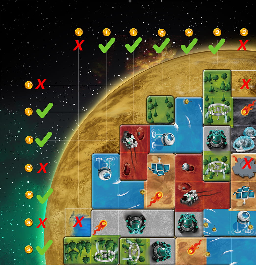 Planet Unknown is a competitive game for 1-6 players in which players attempt to develop the best planet. Each round, each player places one polyomino-shaped, dual-resource tile on their planet. Each resource represents the infrastructure needed to support life on the planet. Every tile placement is important to cover your planet efficiently and also to build up your planet's engine. After placing the tile, players do two actions associated with the two infrastructure types on the tile. Some tile placements trigger "meteors" that make all planets harder to develop and prevent them from scoring points in the meteor's row and column.