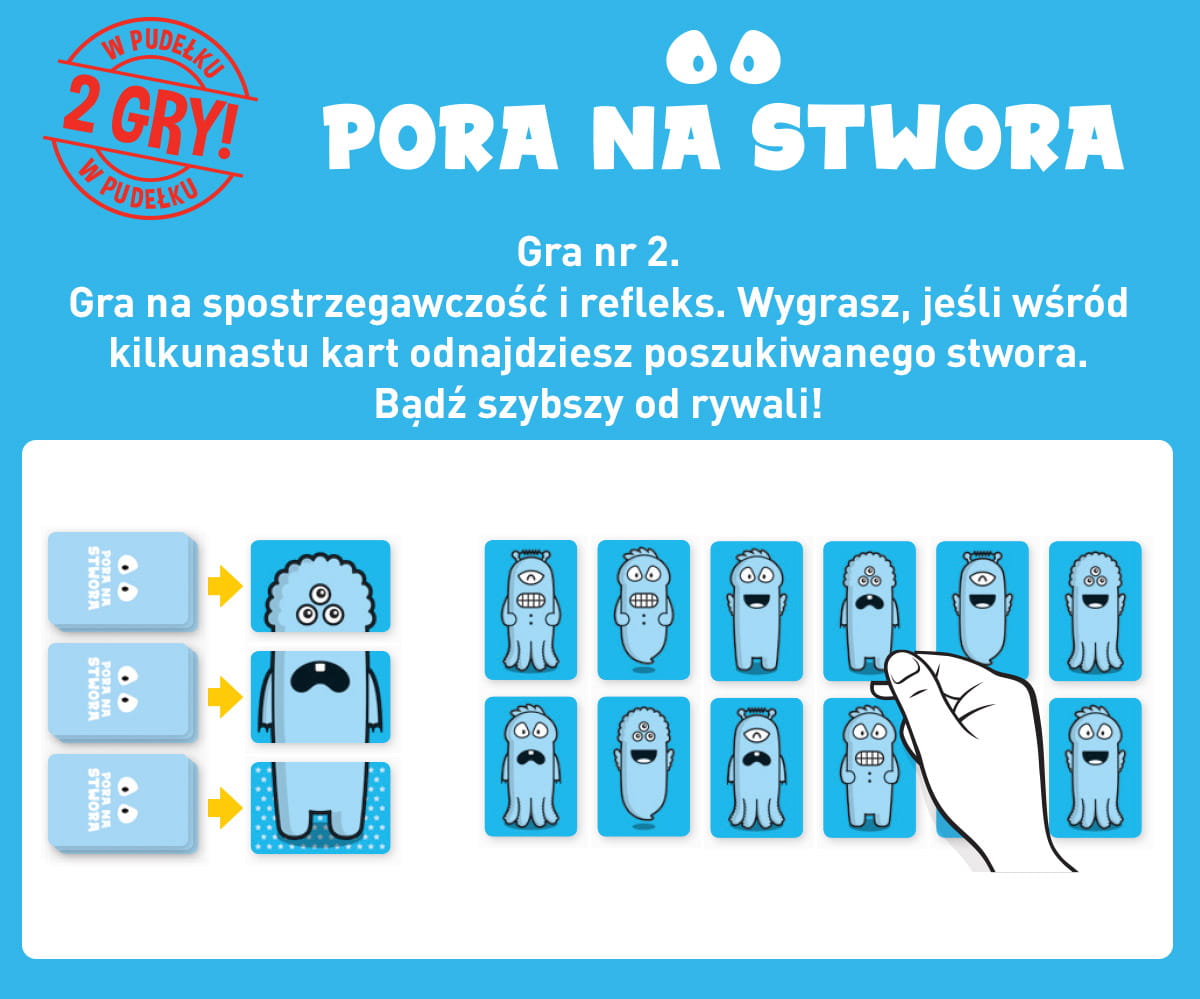 Pora na stwora to sympatyczna gra rodzinna, która odczaruje wszelkie strachy spod łóżka, pomoże ćwiczyć spostrzegawczość i sprytne planowanie.