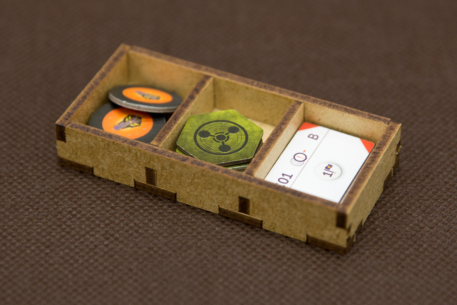 - 1 pojemnik segregujący karty: Początkowych Dóbr, Podstawowych Celów Trybu Solo, Modułów oraz nowa karty Warunku Końcowego,