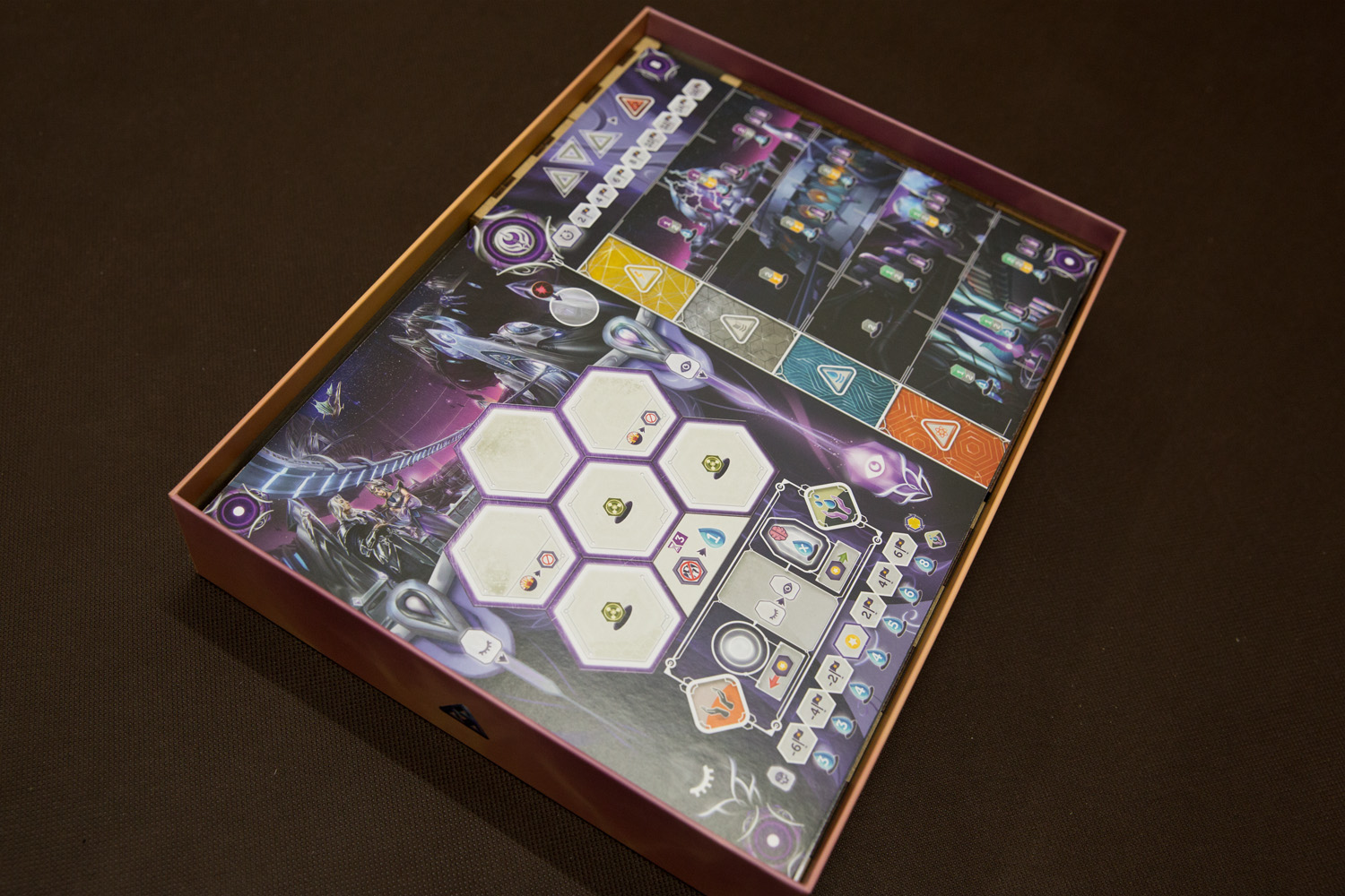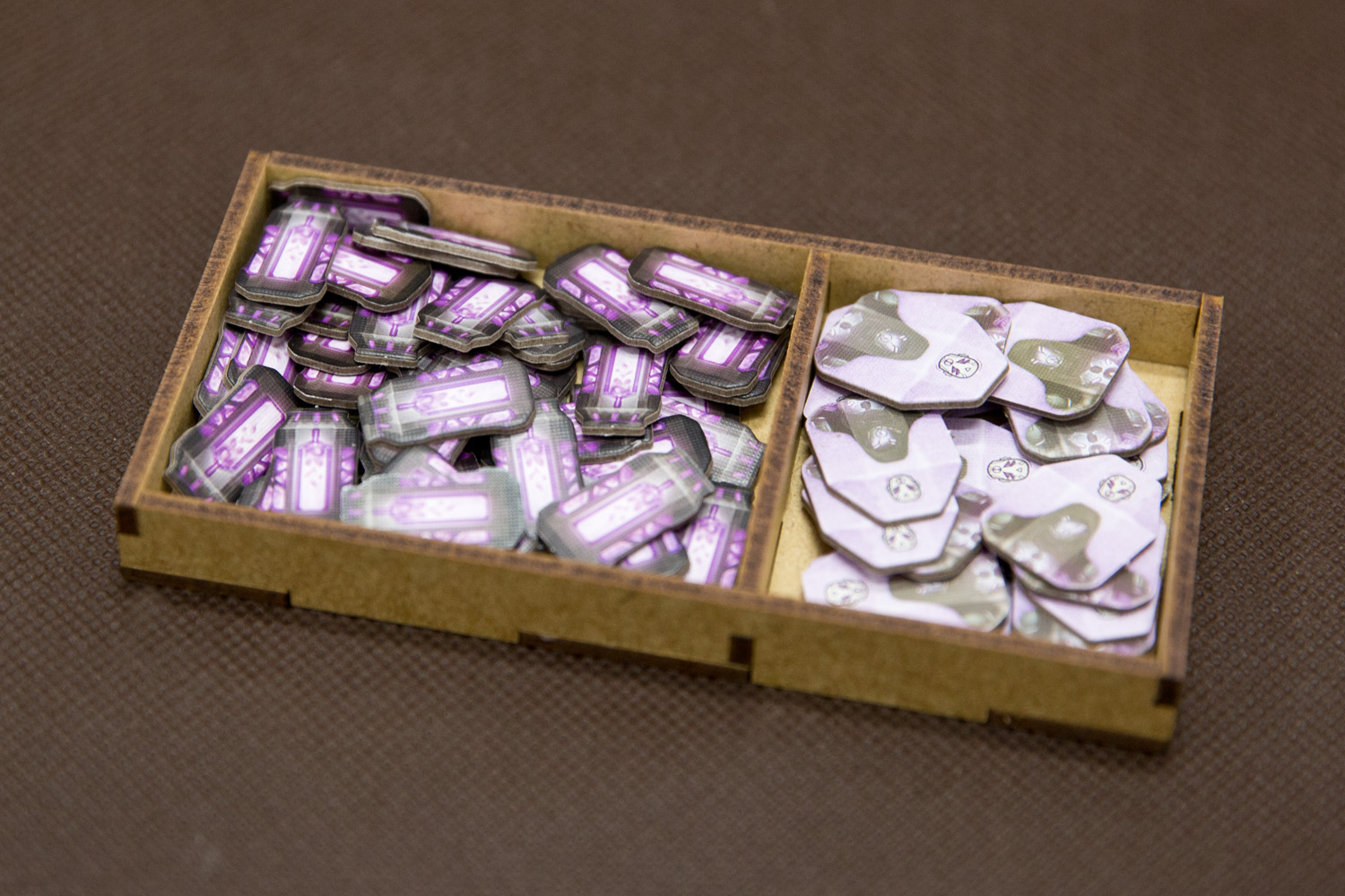 - 1 pojemnik dla Frakcji mieszczący: znaczniki Egzoszkieletów w kształcie Heksów, kafle Warpu oraz znaczniki Zakłócenia,