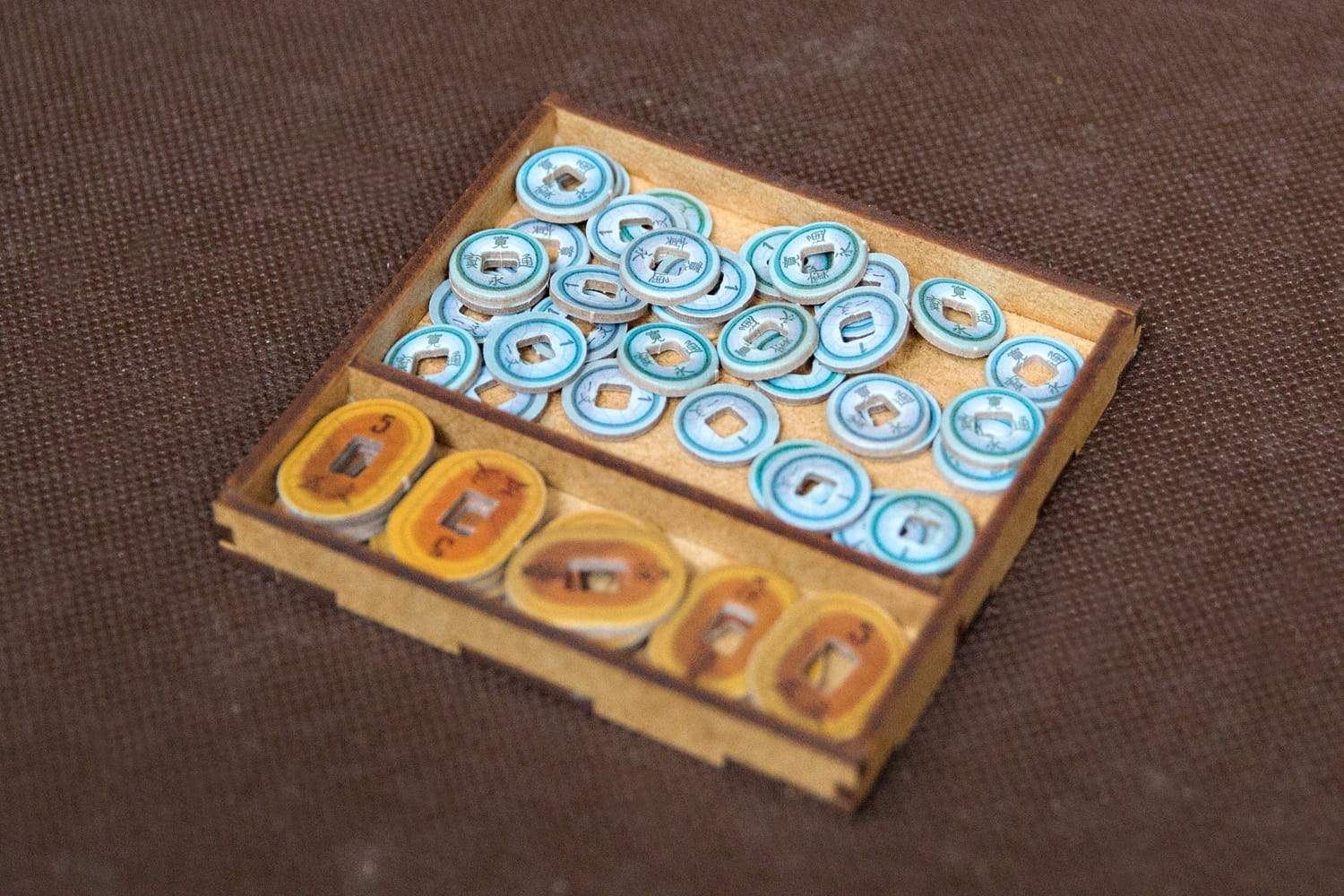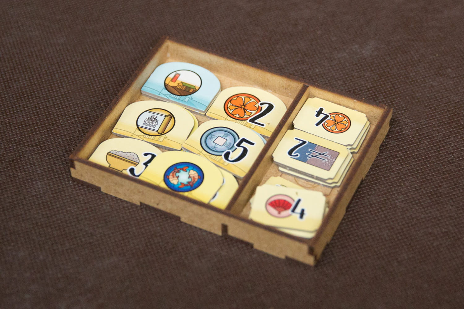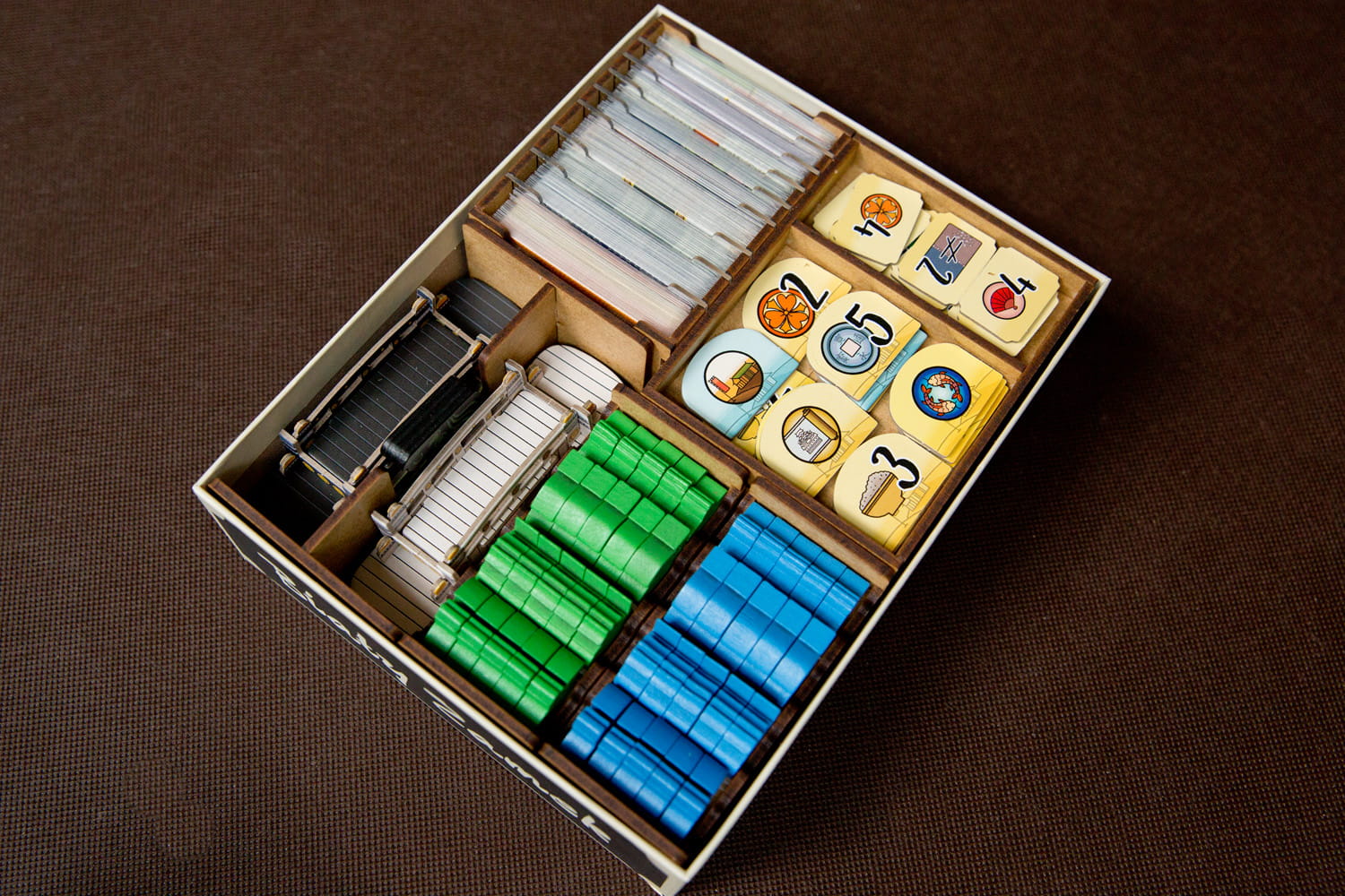 Insert posiada pojemniki na żetony do wyłożenia na stół pozwalające utrzymać porządek podczas rozgrywki.