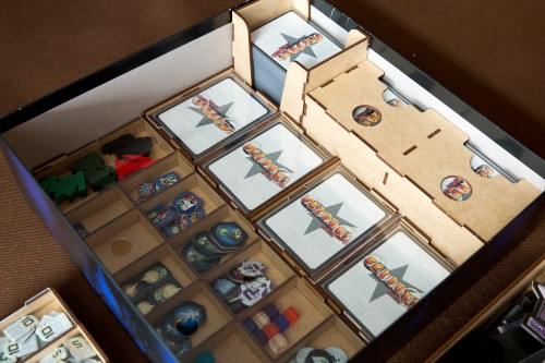 Pudełko wraz z zawartością domyka się bez podniesienia wieka. Insert posiada osobne przegrody na talie kart z dodatków - pozwala to na odseparowanie ich od gry podstawowej. Karty rezerw podzielone są rodzajami. Talia podstawowa (przygód) przechowywana jest w pojemniku, który może pełnić funkcję wydajnego podajnika w trakcie gry. Pojemniki na żetony, kredyty oraz kosteczki z taliami startowymi posiadają zasuwki z pleksi. Takie rozwiązanie umożliwia przechowywanie pudełka w pionie i zawartość pojemników nigdy się Wam nie wysypie.