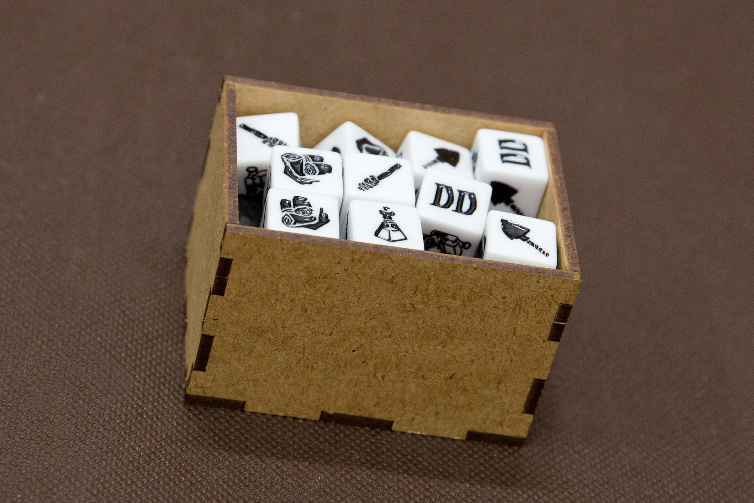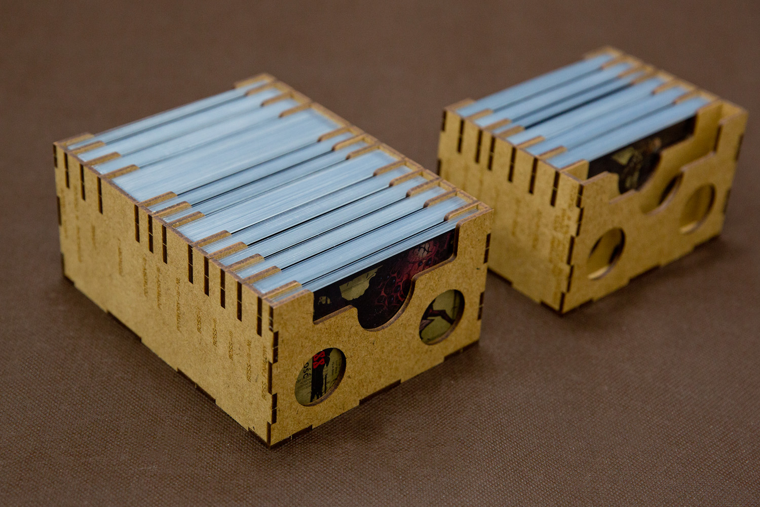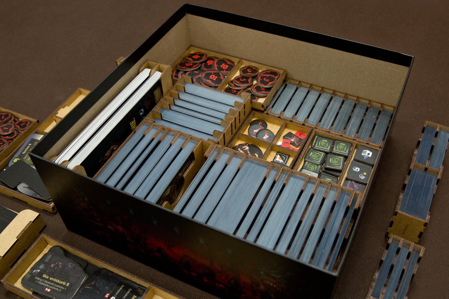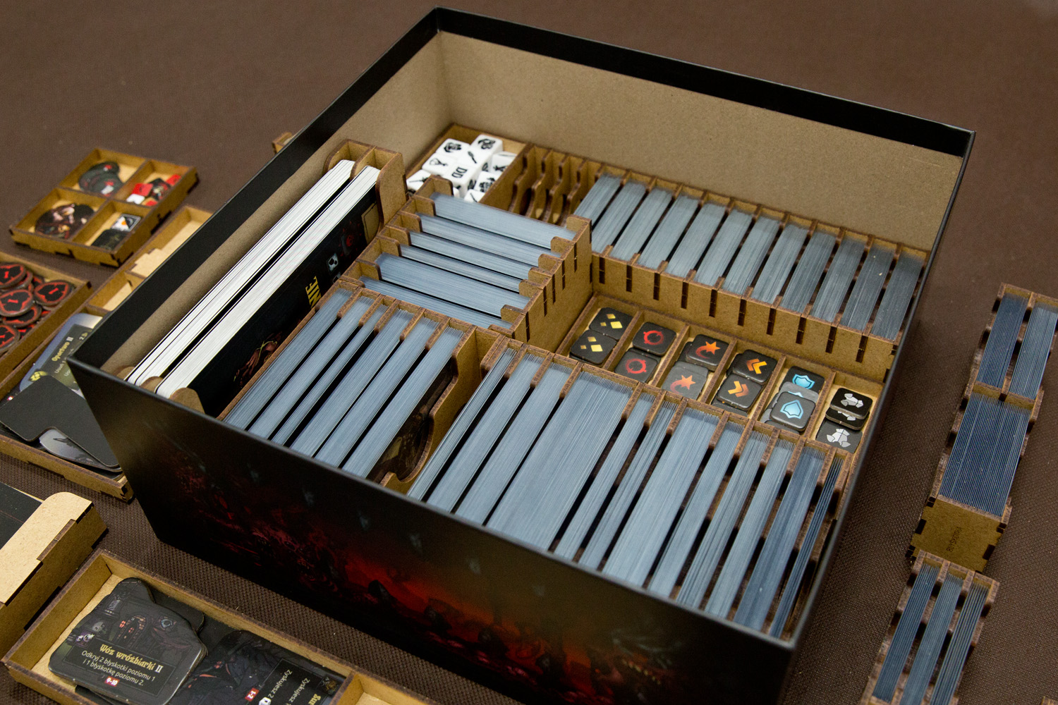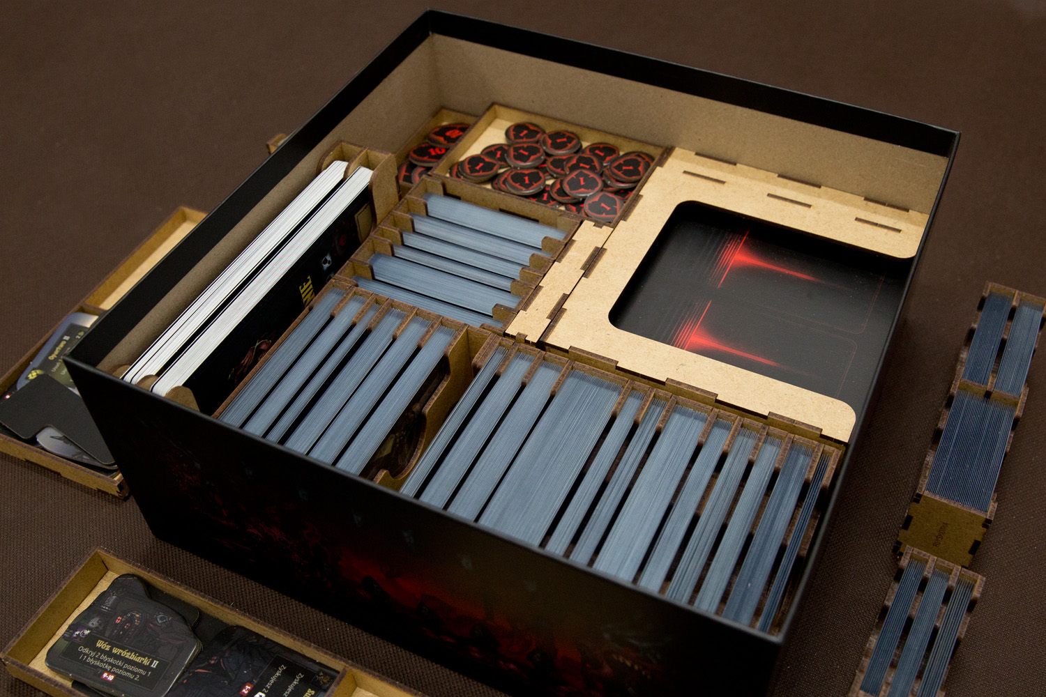 - 2 pojemniki segregujący karty Pomocy, Potworów / Bossów / Wydarzeń w Osadzie, Zadań w rozmiarze Tarot, zapisu kampanii,