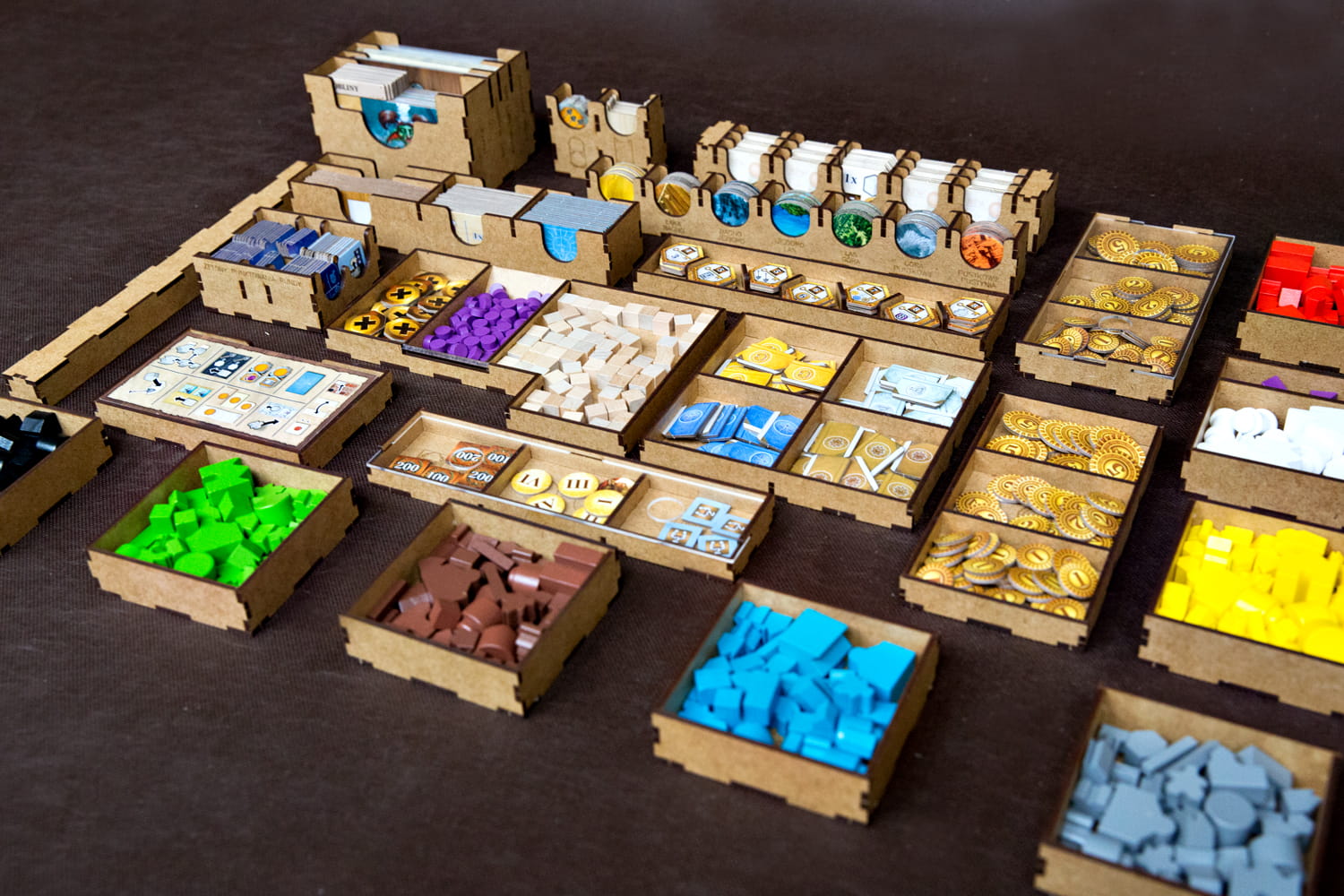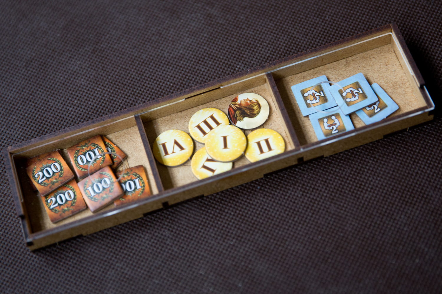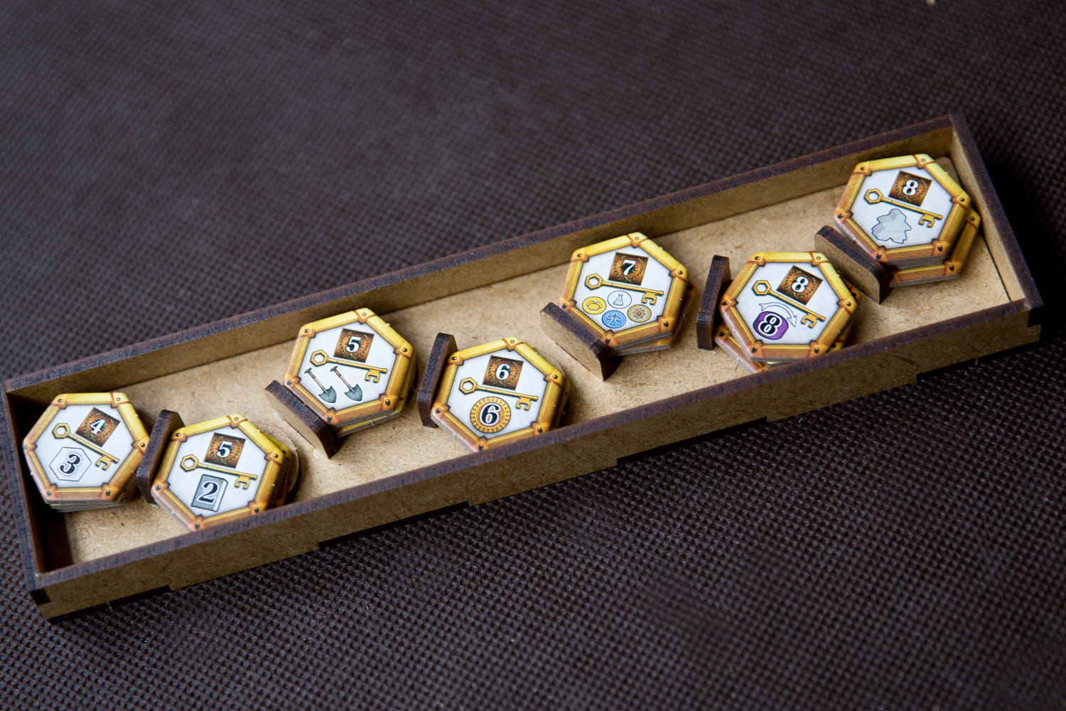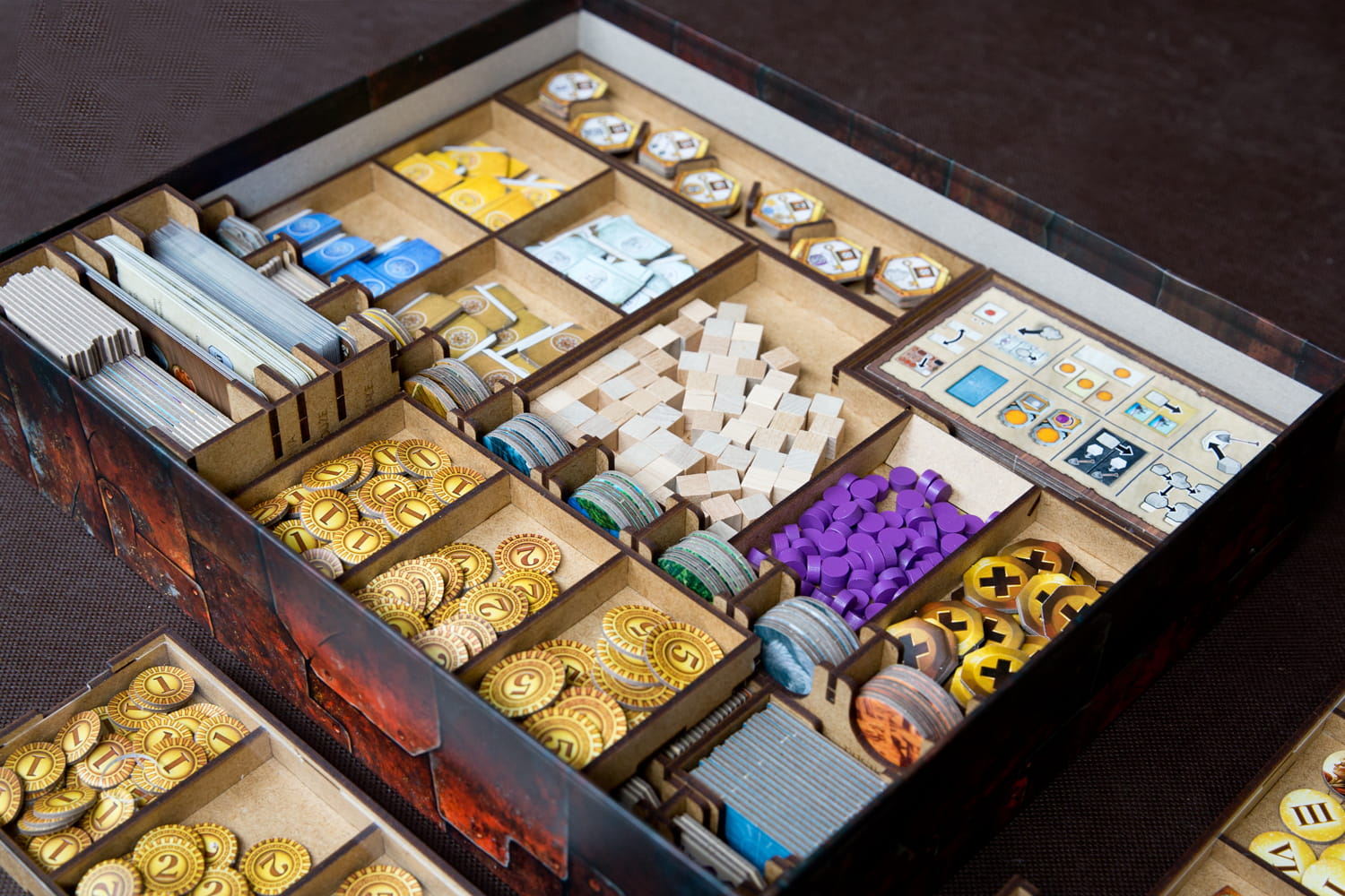 Pojemniki w insercie posiadają grawery ułatwiające posegregowanie elementów. Pojemniki z drobnymi żetonami są zasuwane co pozwala na pionowe przechowywanie pudełka. Insert zawiera szereg pojemników oraz podajników na żetony do wyłożenia na stół w celu organizacji przestrzeni i utrzymania porządku w trakcie rozgrywki.