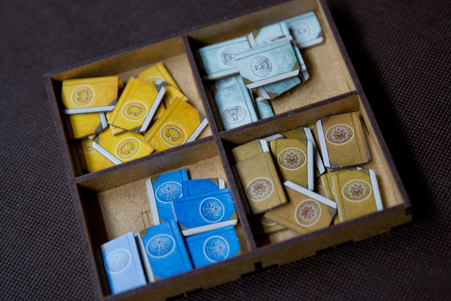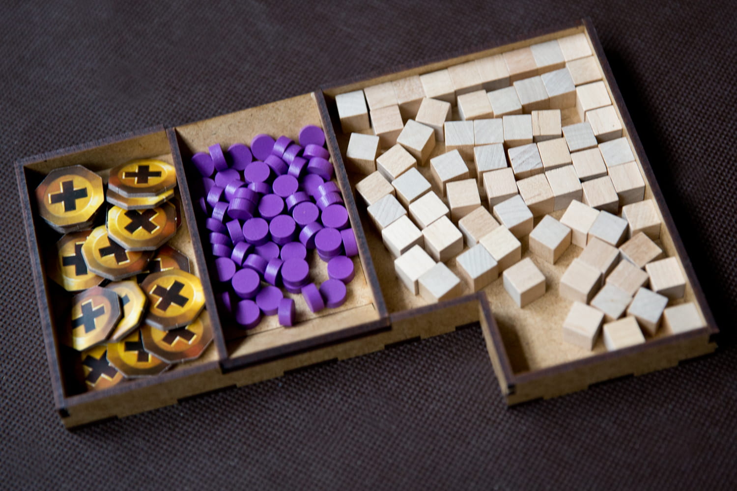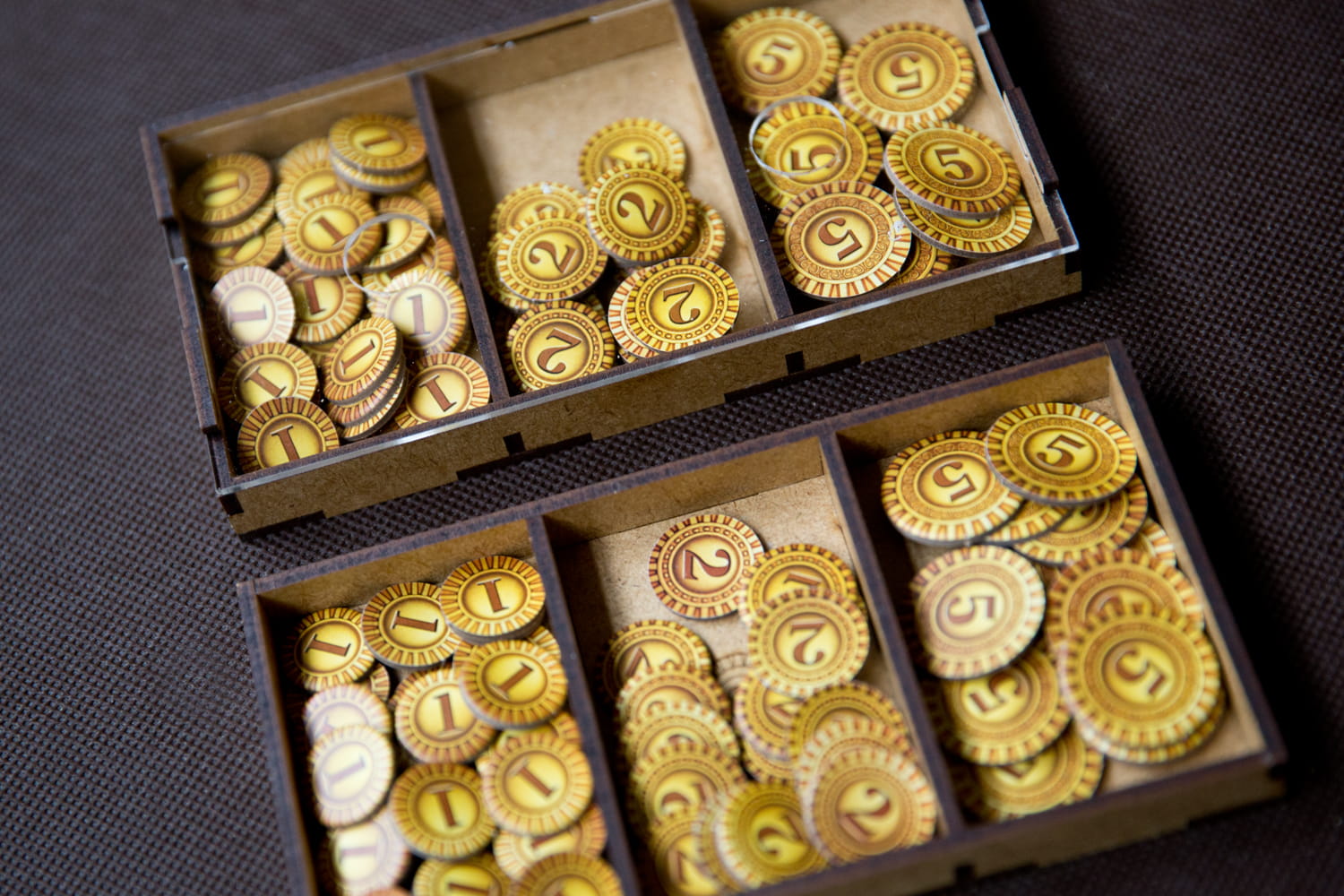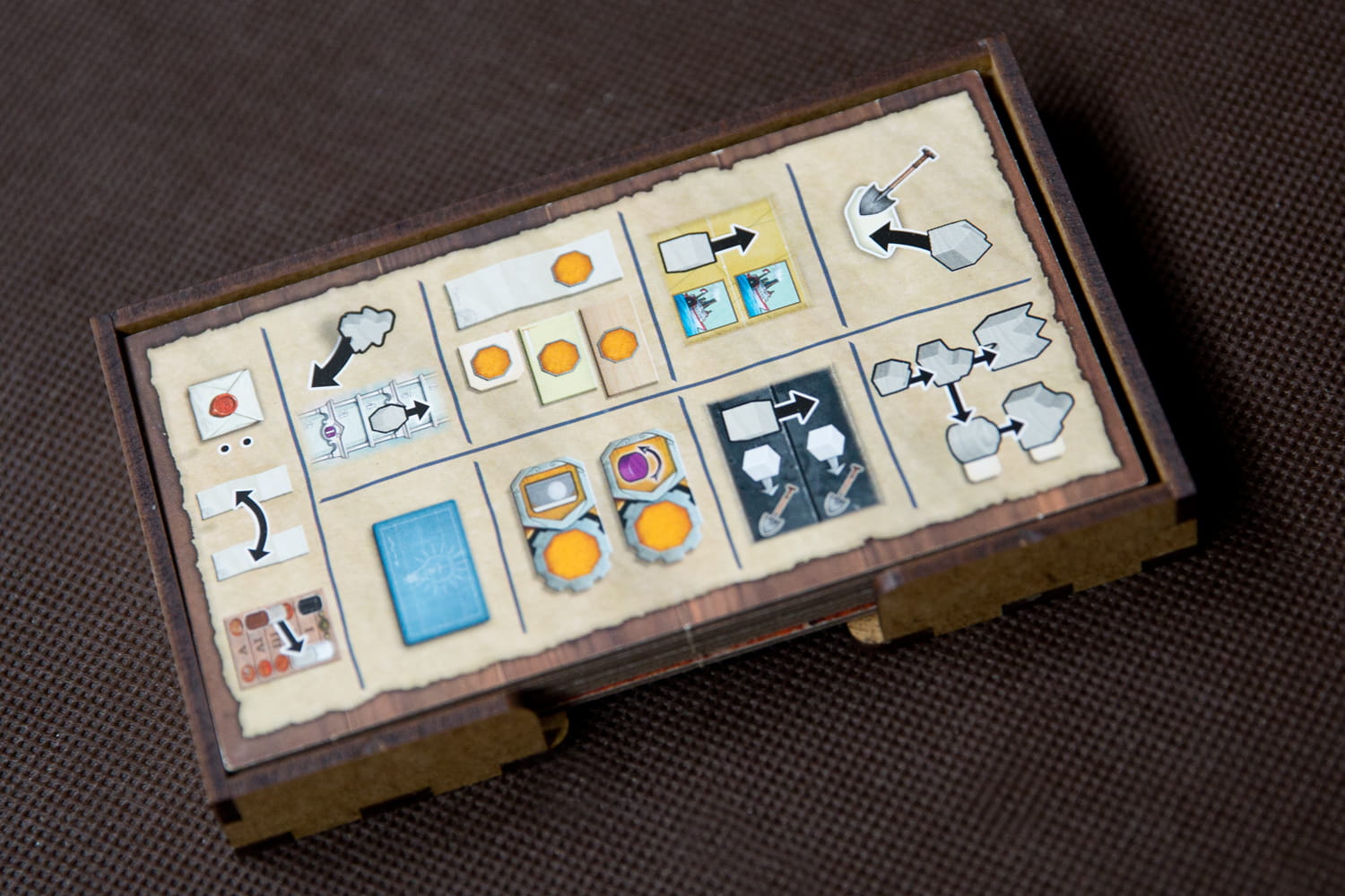 Pojemniki w insercie posiadają grawery ułatwiające posegregowanie elementów. Pojemniki z drobnymi żetonami są zasuwane co pozwala na pionowe przechowywanie pudełka. Insert zawiera szereg pojemników oraz podajników na żetony do wyłożenia na stół w celu organizacji przestrzeni i utrzymania porządku w trakcie rozgrywki.