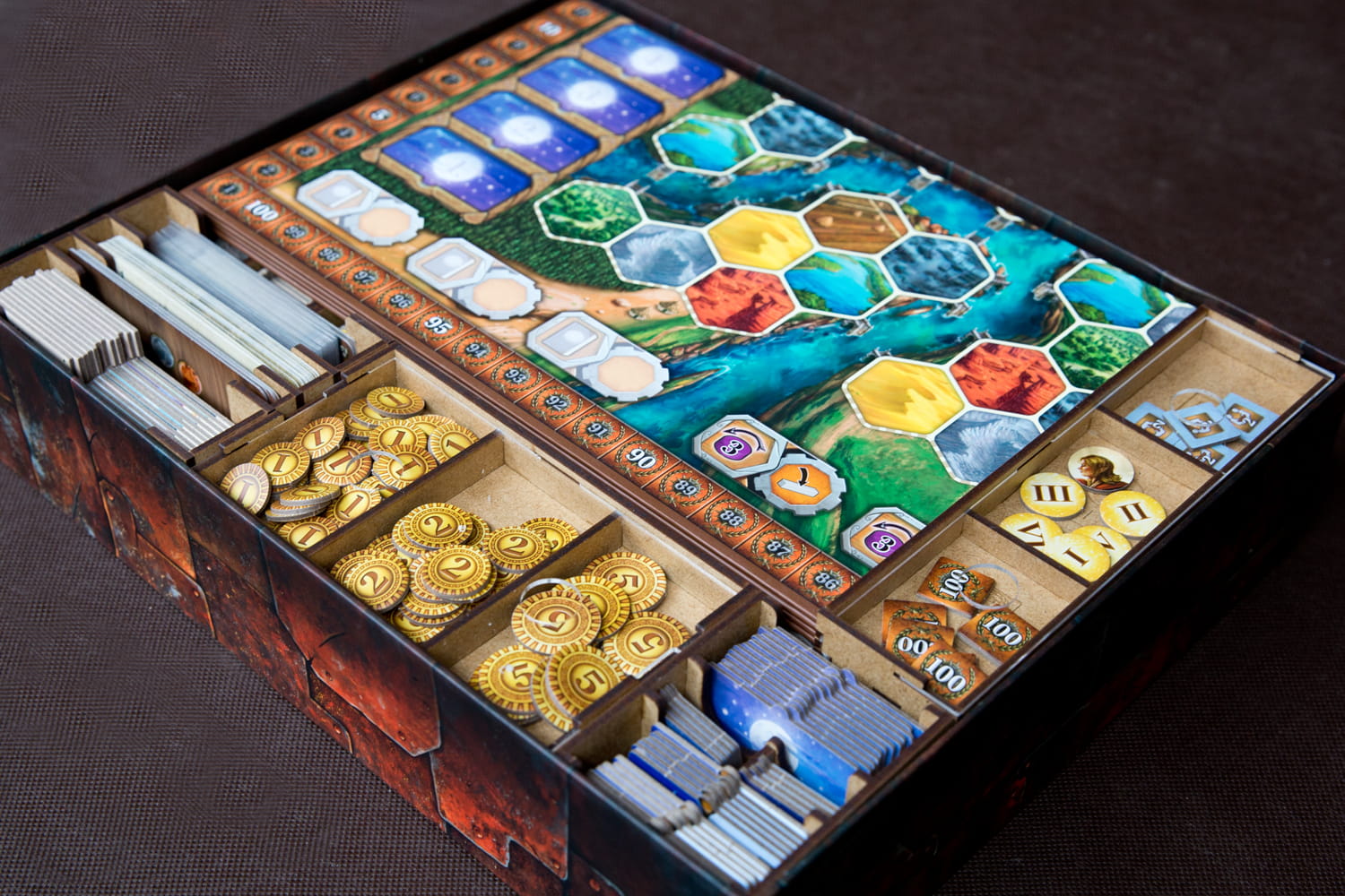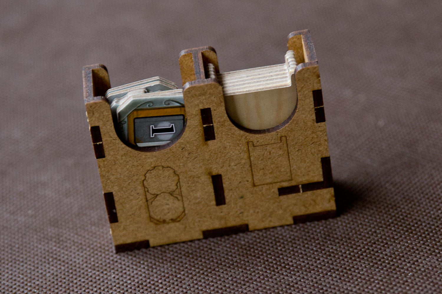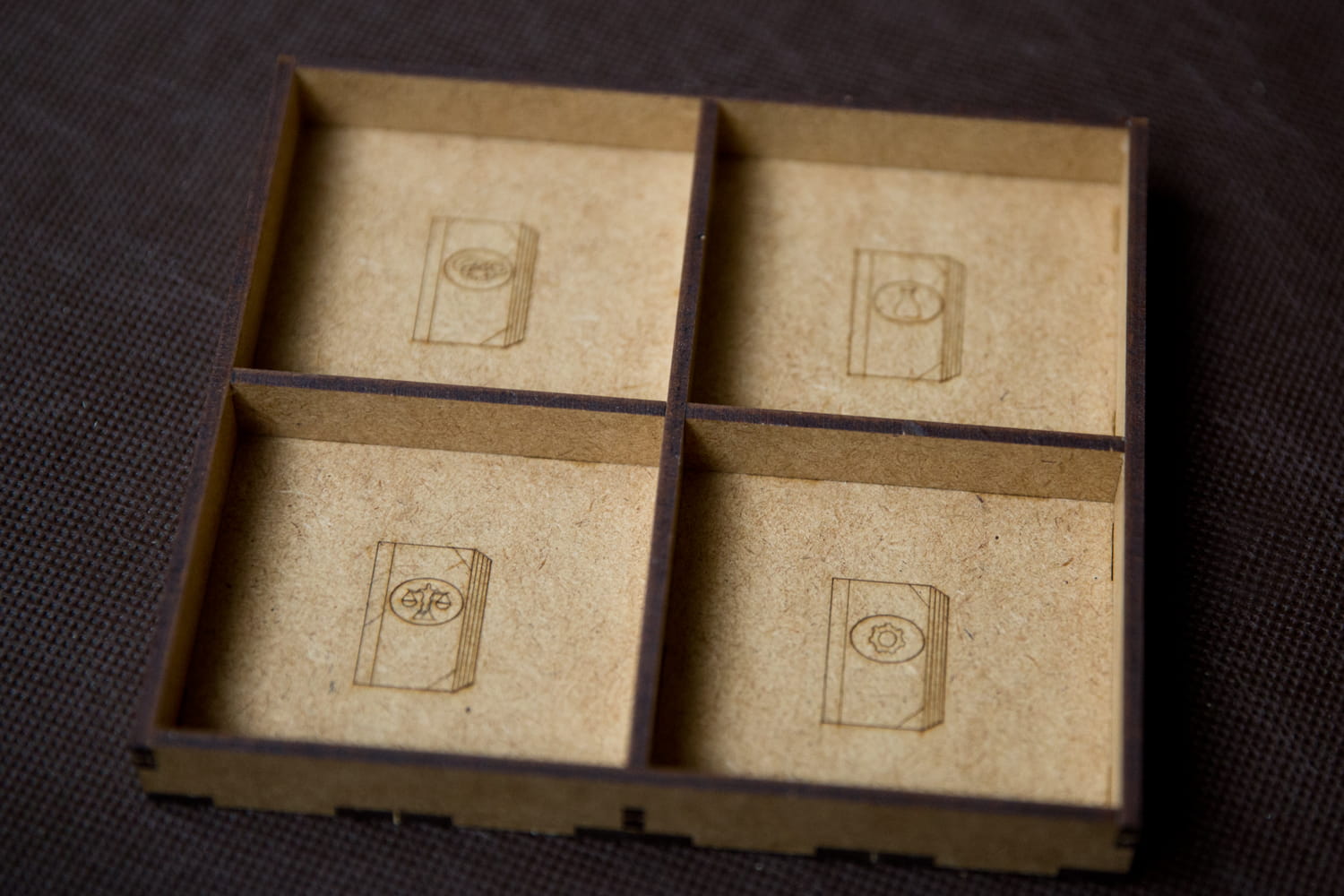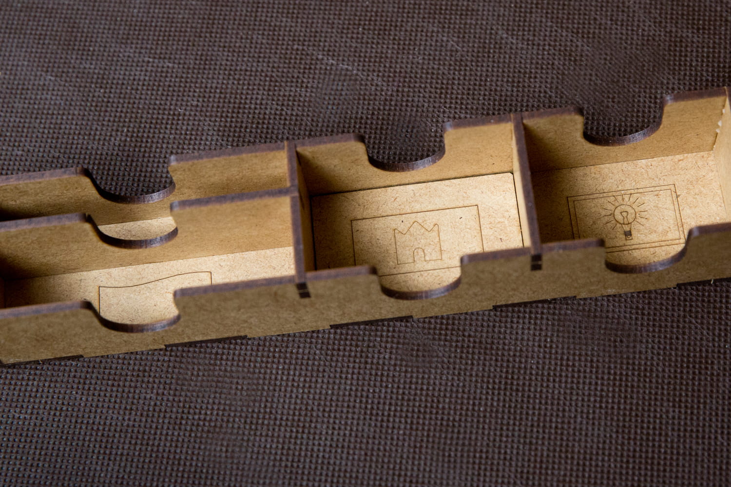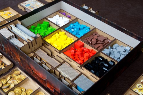 Pojemniki w insercie posiadają grawery ułatwiające posegregowanie elementów. Pojemniki z drobnymi żetonami są zasuwane co pozwala na pionowe przechowywanie pudełka. Insert zawiera szereg pojemników oraz podajników na żetony do wyłożenia na stół w celu organizacji przestrzeni i utrzymania porządku w trakcie rozgrywki.