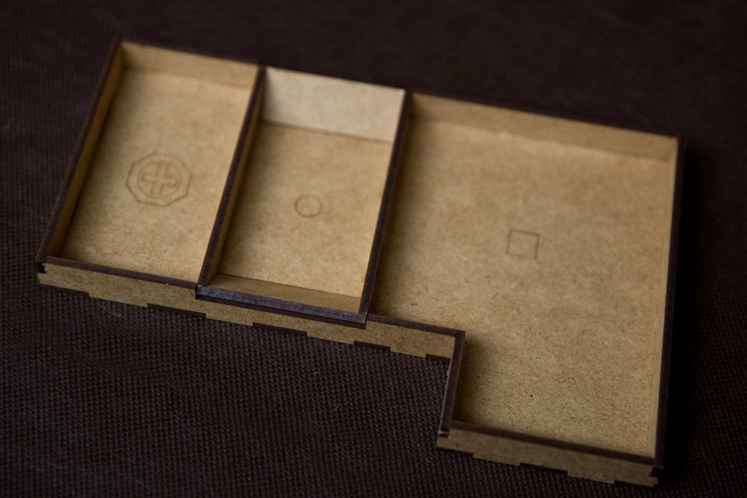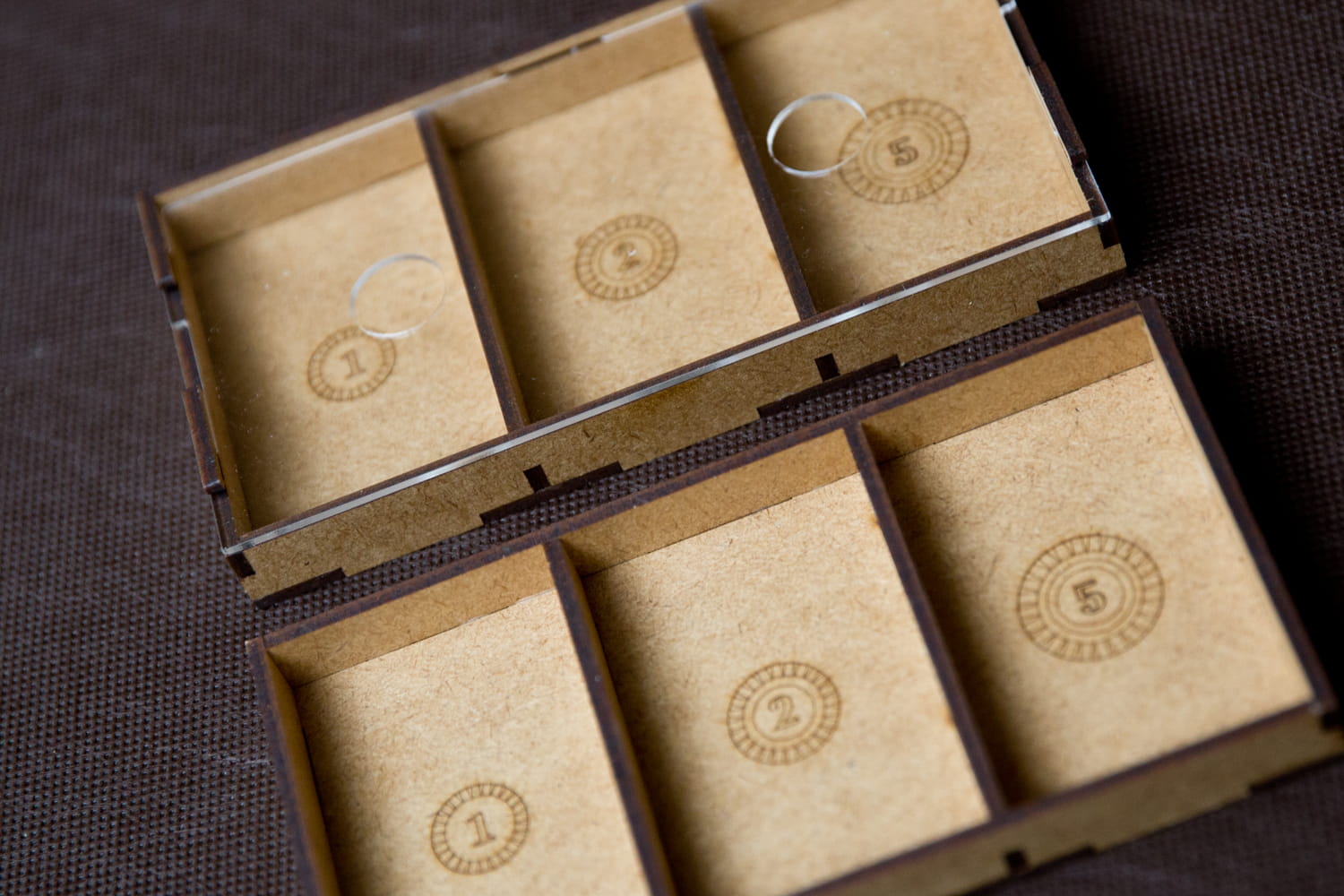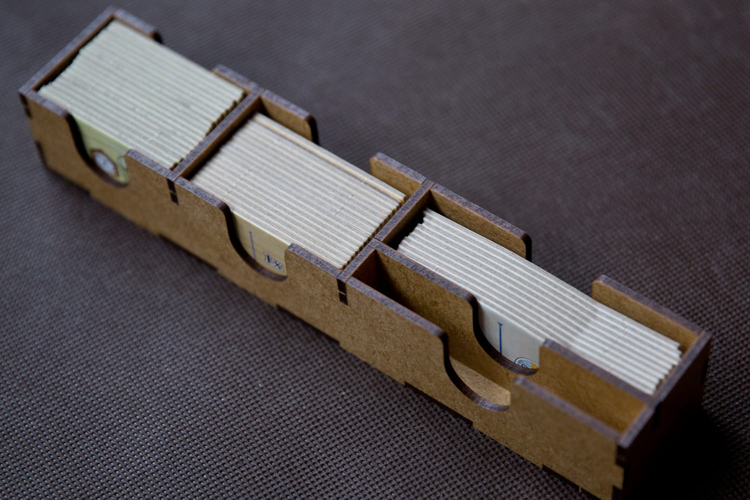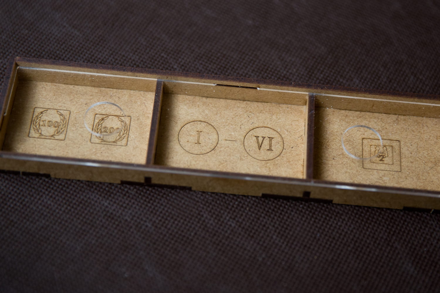 Pojemniki w insercie posiadają grawery ułatwiające posegregowanie elementów. Pojemniki z drobnymi żetonami są zasuwane co pozwala na pionowe przechowywanie pudełka. Insert zawiera szereg pojemników oraz podajników na żetony do wyłożenia na stół w celu organizacji przestrzeni i utrzymania porządku w trakcie rozgrywki.