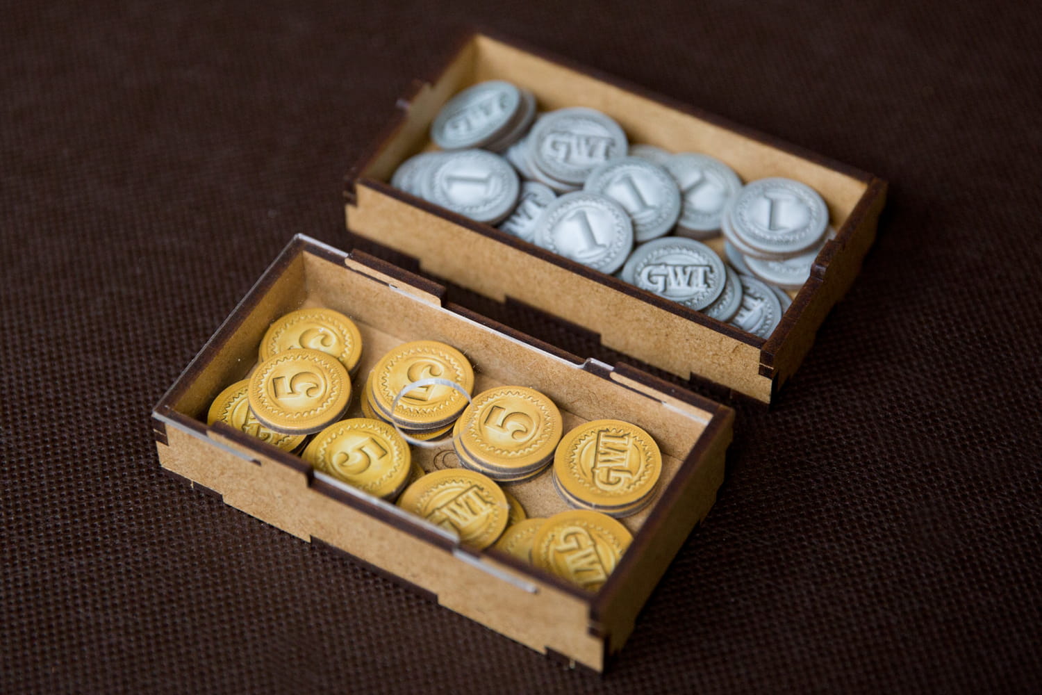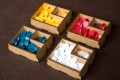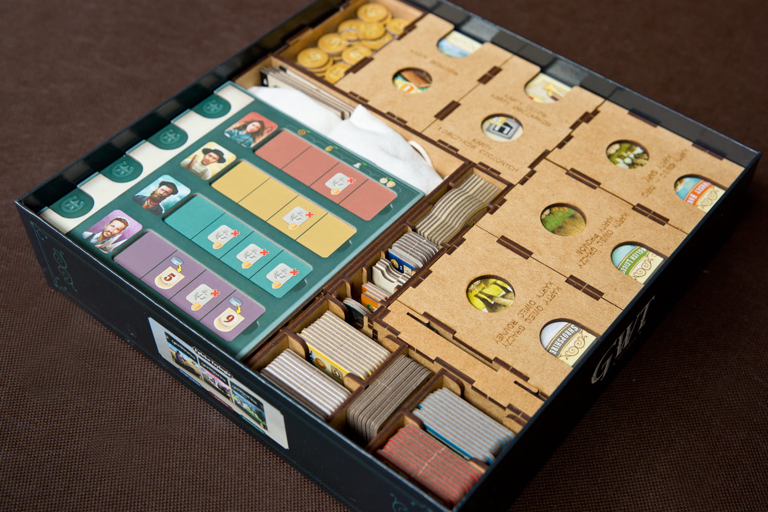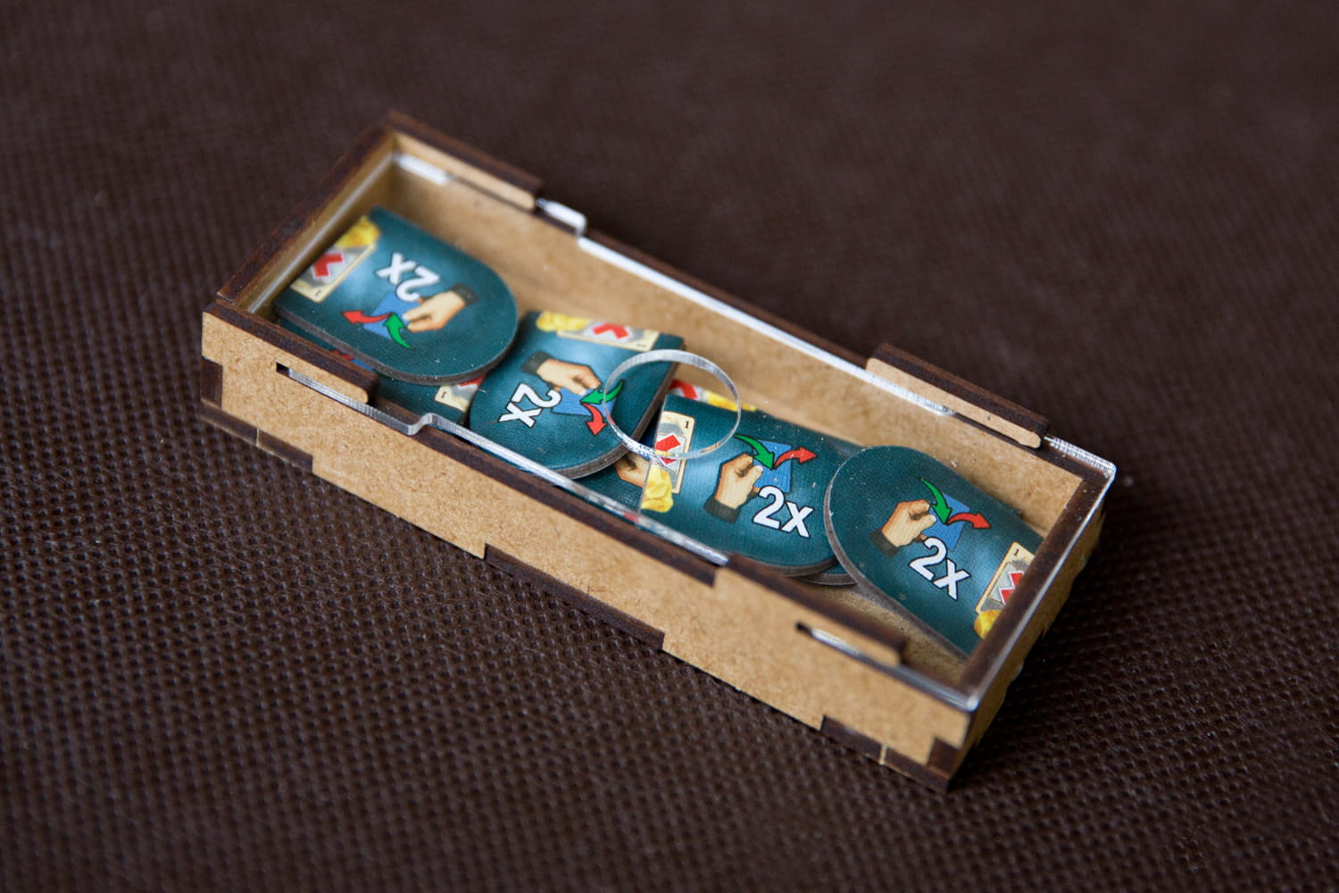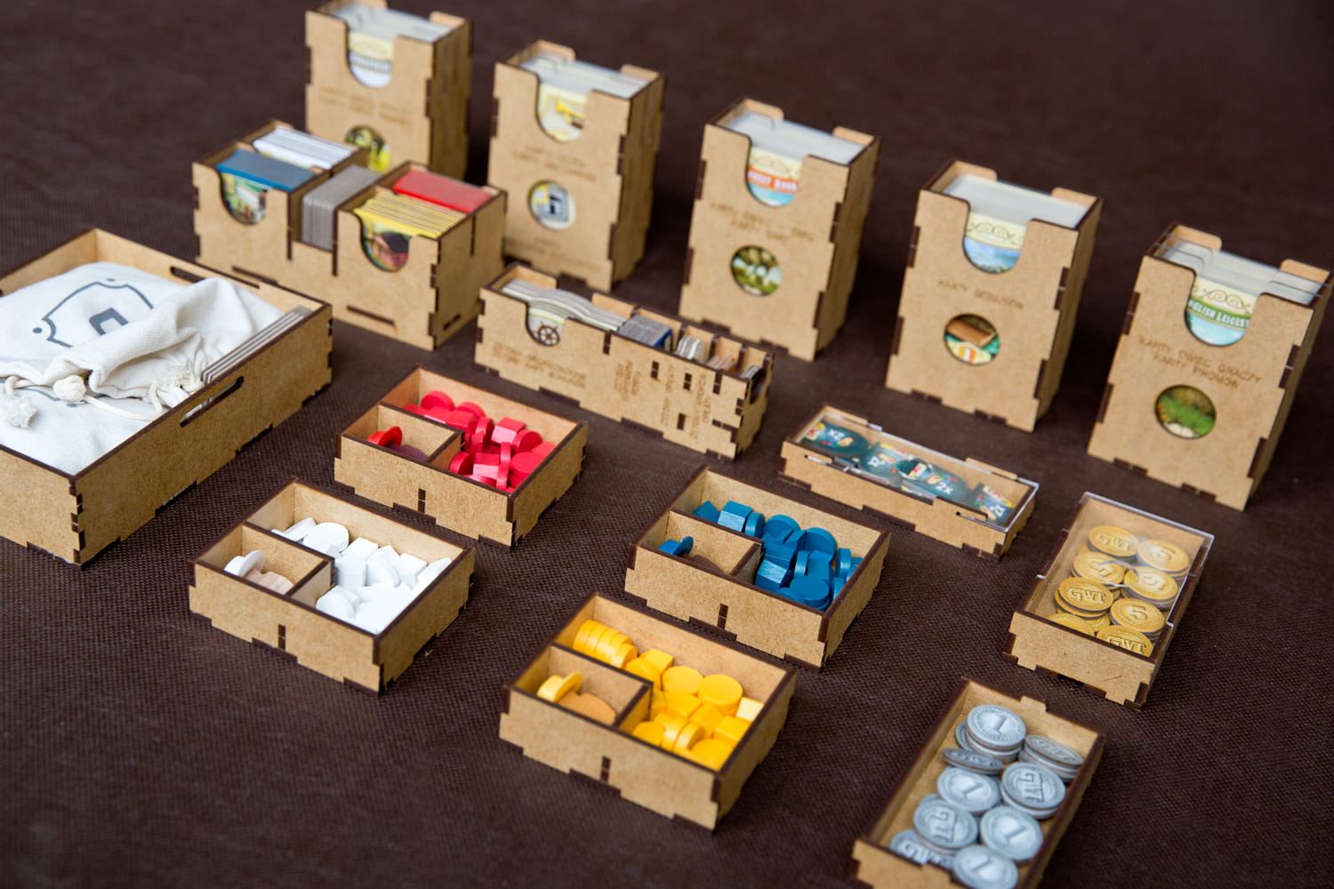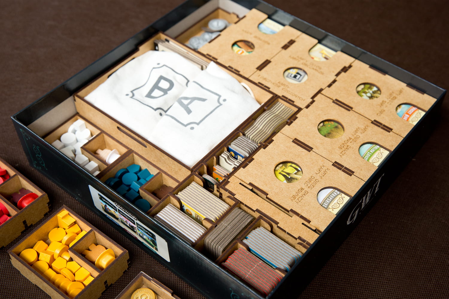 Pojemniki w insercie posiadają grawery ułatwiające posegregowanie elementów. Woreczki przechowywane są razem z żetonami w środku, nie trzeba ich wysypywać. Pojemniki w drobnymi żetonami są zasuwane co pozwala na pionowe przechowywanie pudełka.