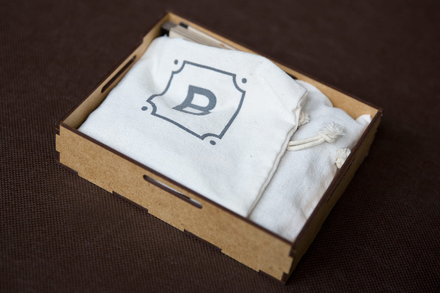 - 1 pojemnik na notes punktacji, żeton pomocniczy budynków neutralnych, żeton rynku Sary, woreczki z żetonami pracowników, niebezpieczeństwa oraz bonusów, żetony liczby graczy,
