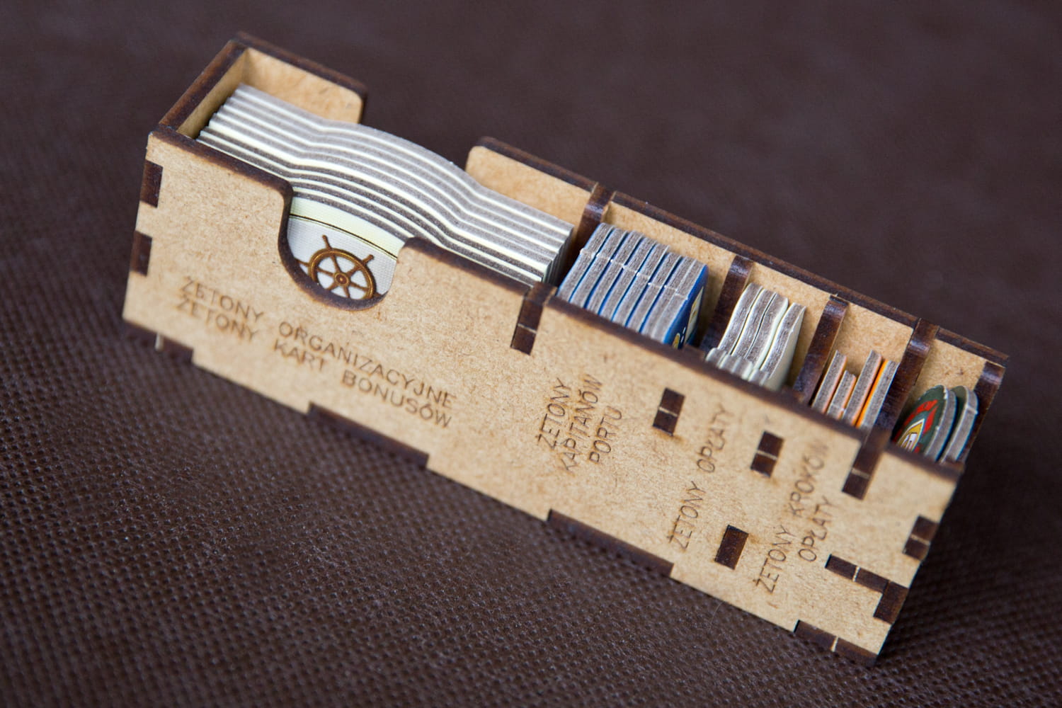 - 1 pojemnik segregujący żetony: organizacyjne / karty bonusów, kapitanów portu, kroków, opłaty, rynku bonusów, specjalizacji,