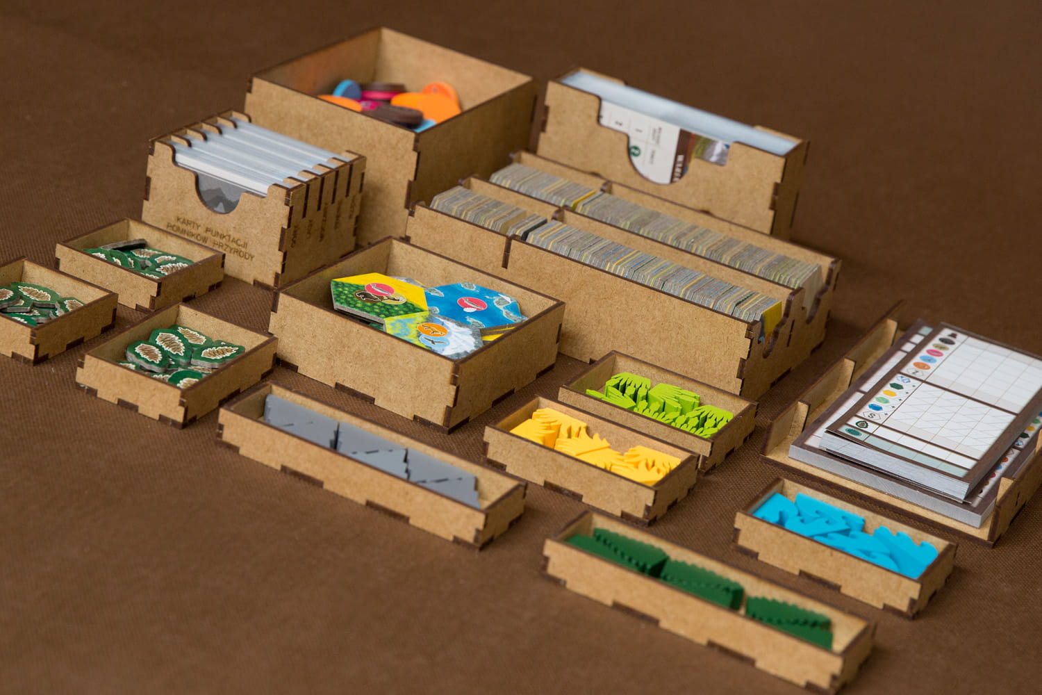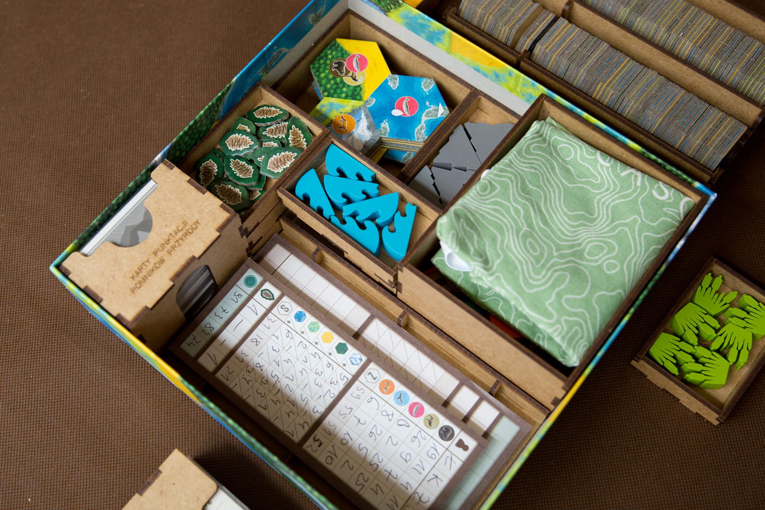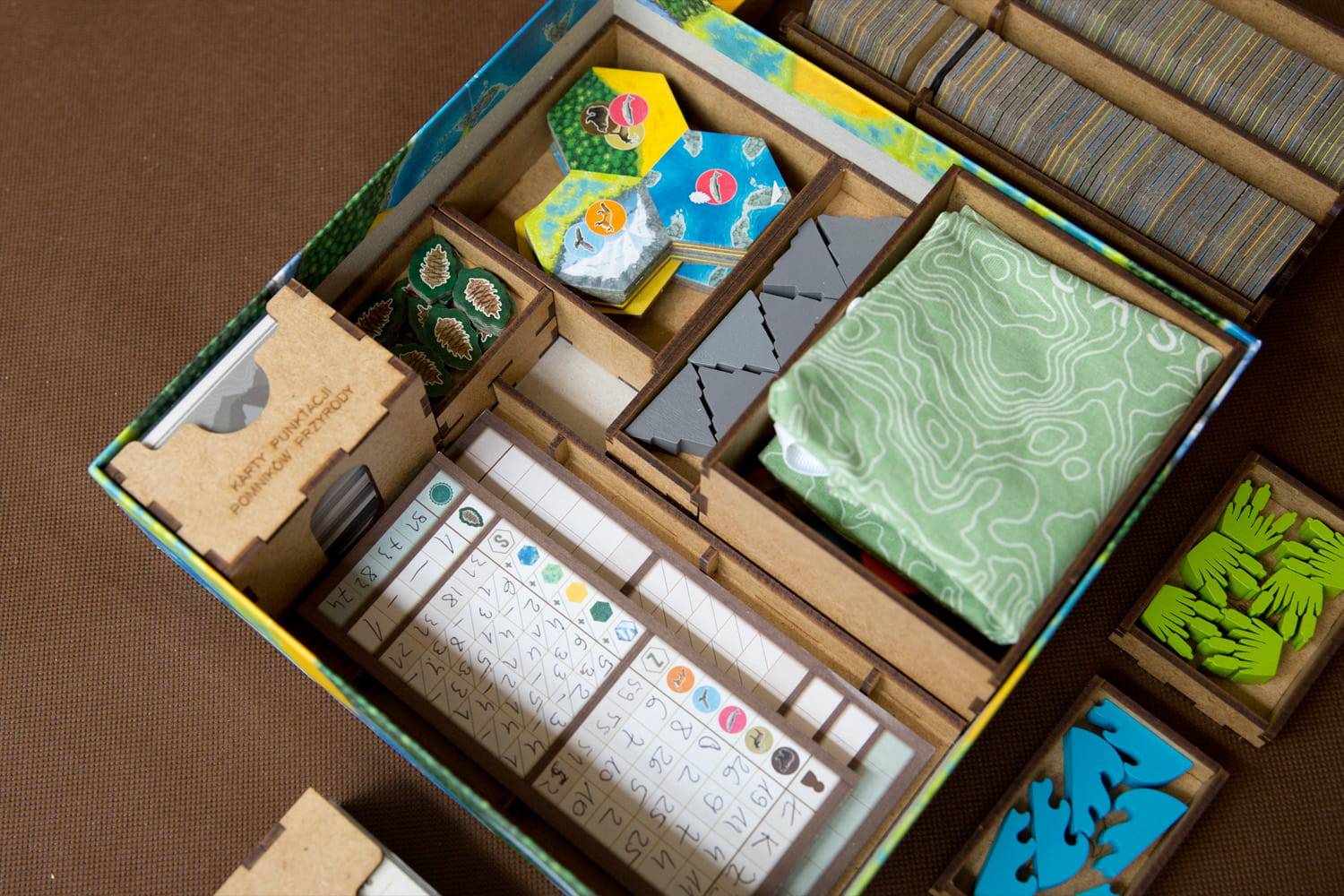 Insert pasujący do gry familijnej Kaskadia. Insert mieści również dodatek Pomniki Przyrody. Insert mieści karty w koszulkach klasy Premium do 110 mikronów. Na zdjęciach karty w koszulkach Gamegenic (100 mikronów). Pudełko zamyka się bez uniesienia wieka. Insert jest niezależny od dodatku - jeżeli go nie masz też możesz użyć insertu do samej gry podstawowej. Notesy na punkty są umieszczone w pojemniku - to zapewnia stałą funkcjonalność insertu, niezależnie od grubości notesów lub ich braku. Insert zawiera 3 pojemniki na żetony natury do rozłożenia na stole.
