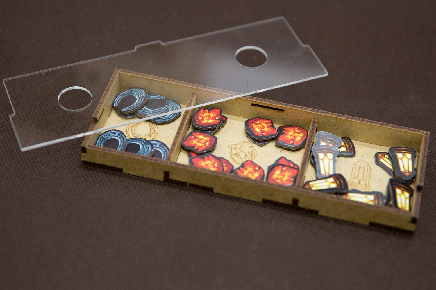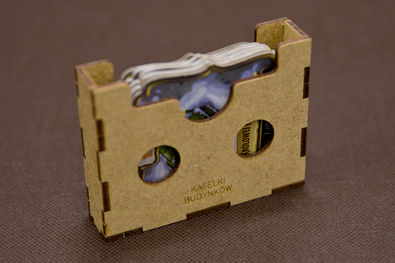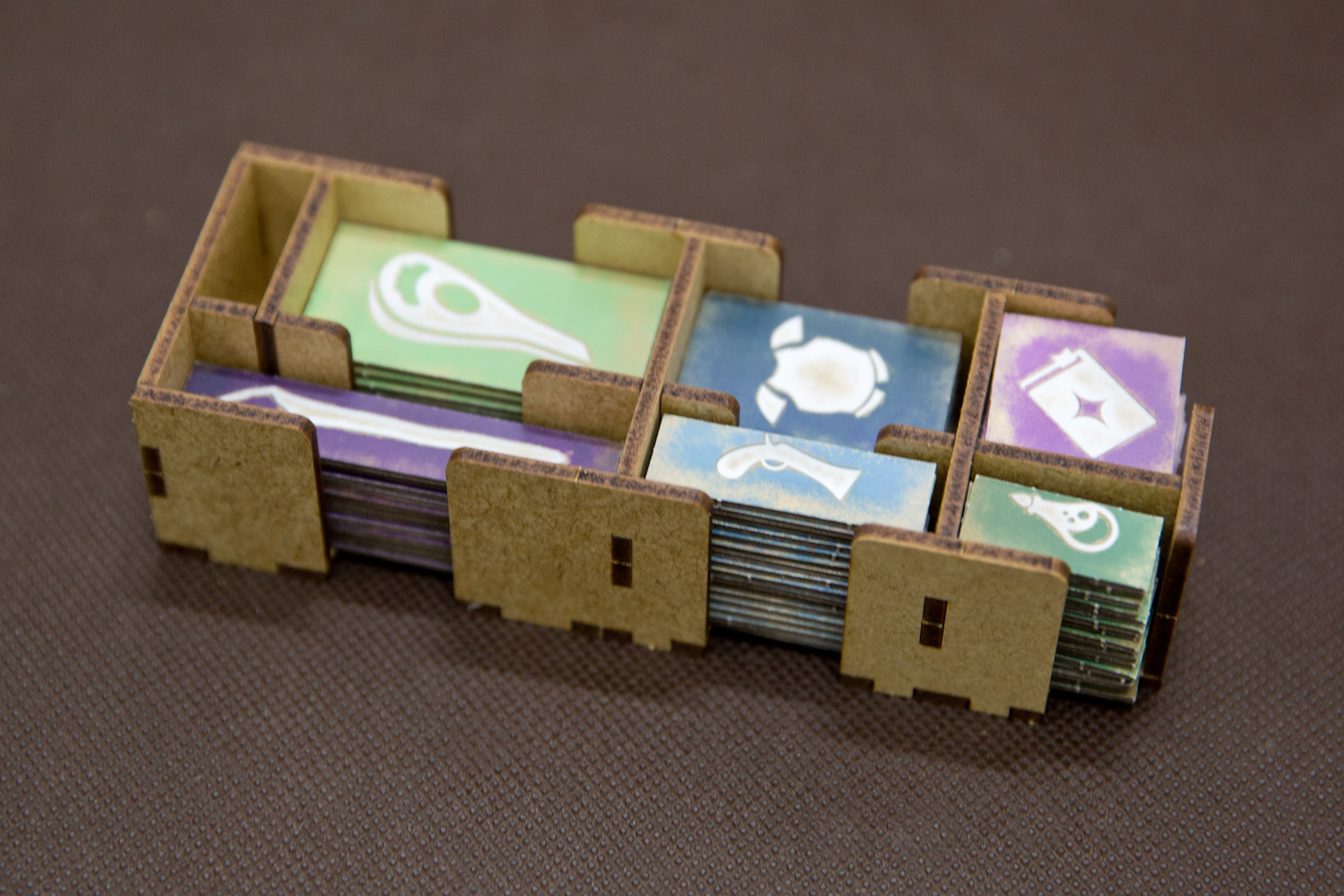 - pojemniki na karty, kafelki, kafelki wykładane na planszę i stół stanowią podajniki i zapobiegają rozpadaniu się stosów podczas rozgrywki,