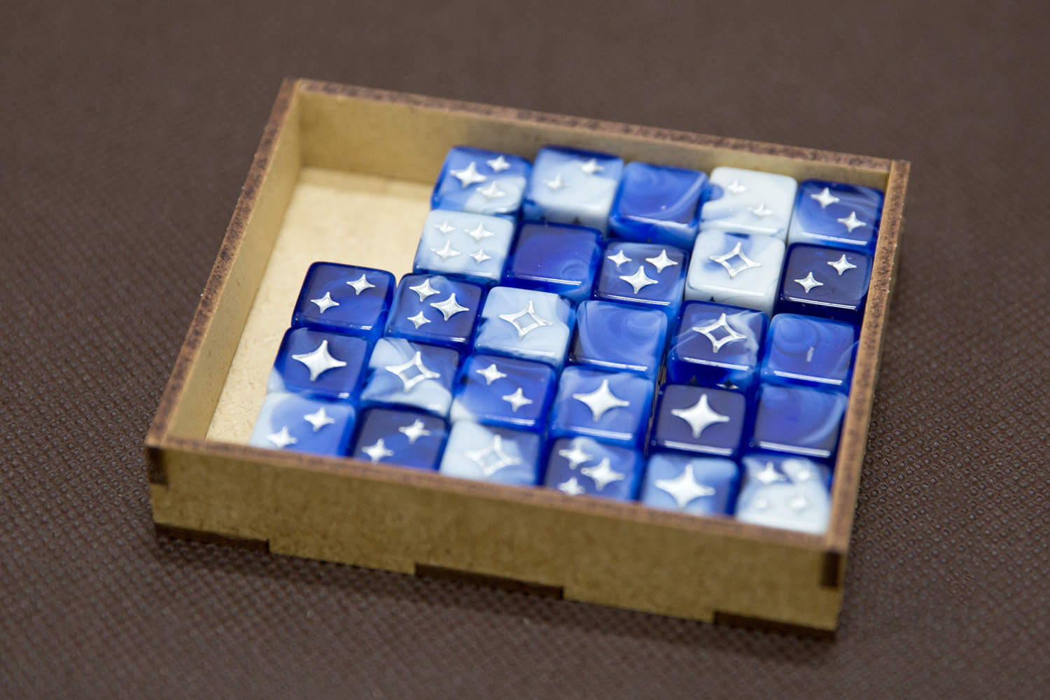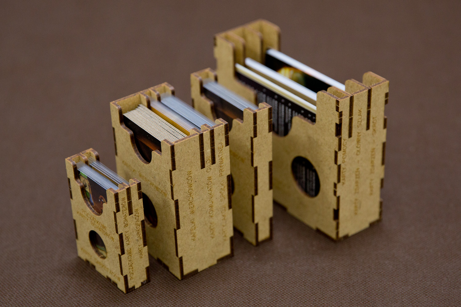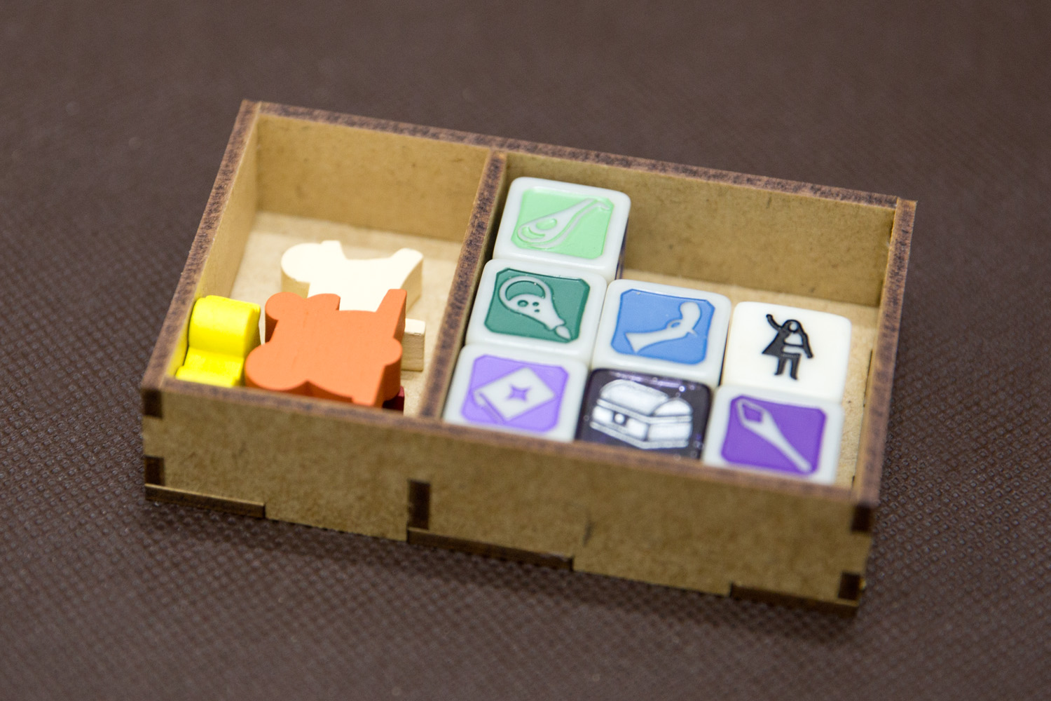 - pojemniki na karty, kafelki, kafelki wykładane na planszę i stół stanowią podajniki i zapobiegają rozpadaniu się stosów podczas rozgrywki,