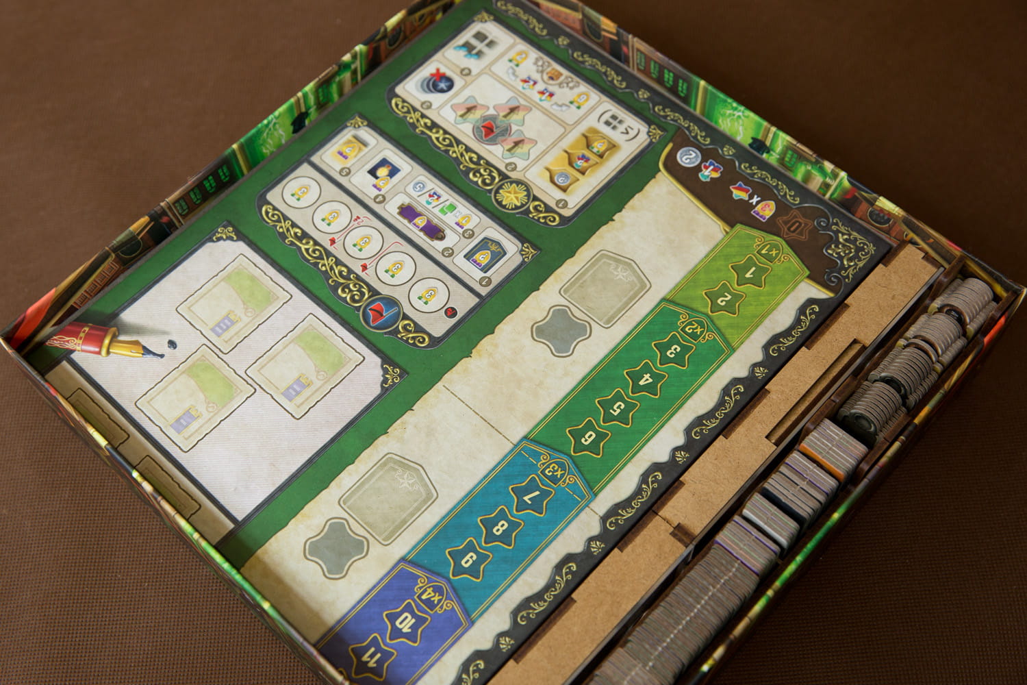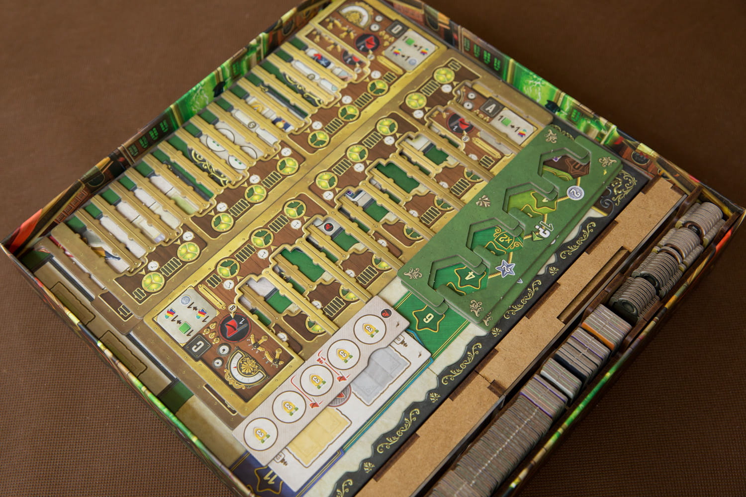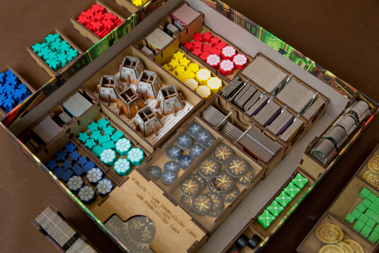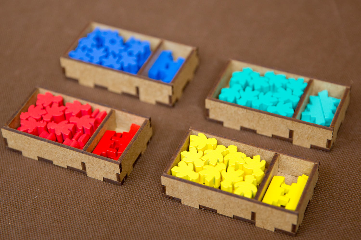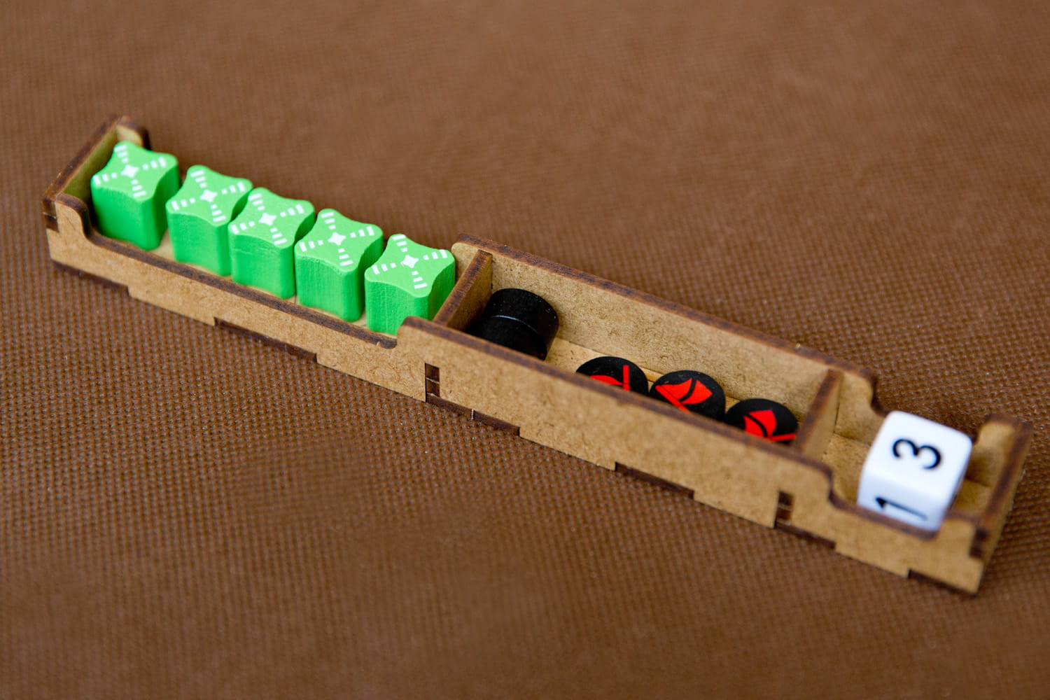 - pojemniki na karty i kafelki wykładane na planszę stanowią podajniki i zapobiegają rozpadaniu się stosów podczas rozgrywki,