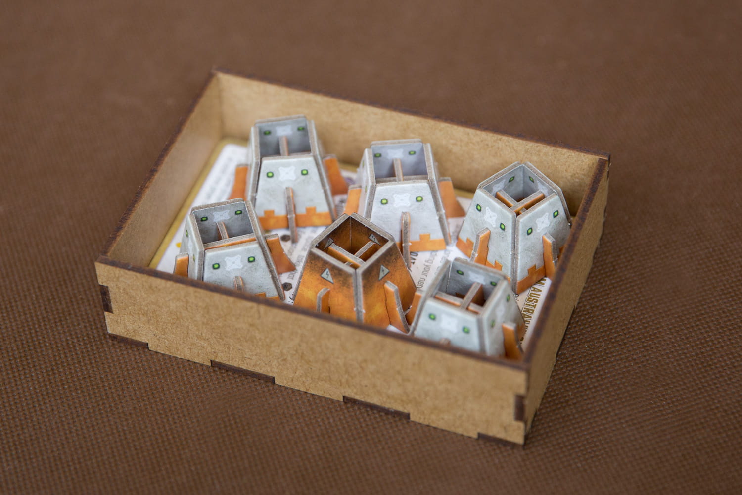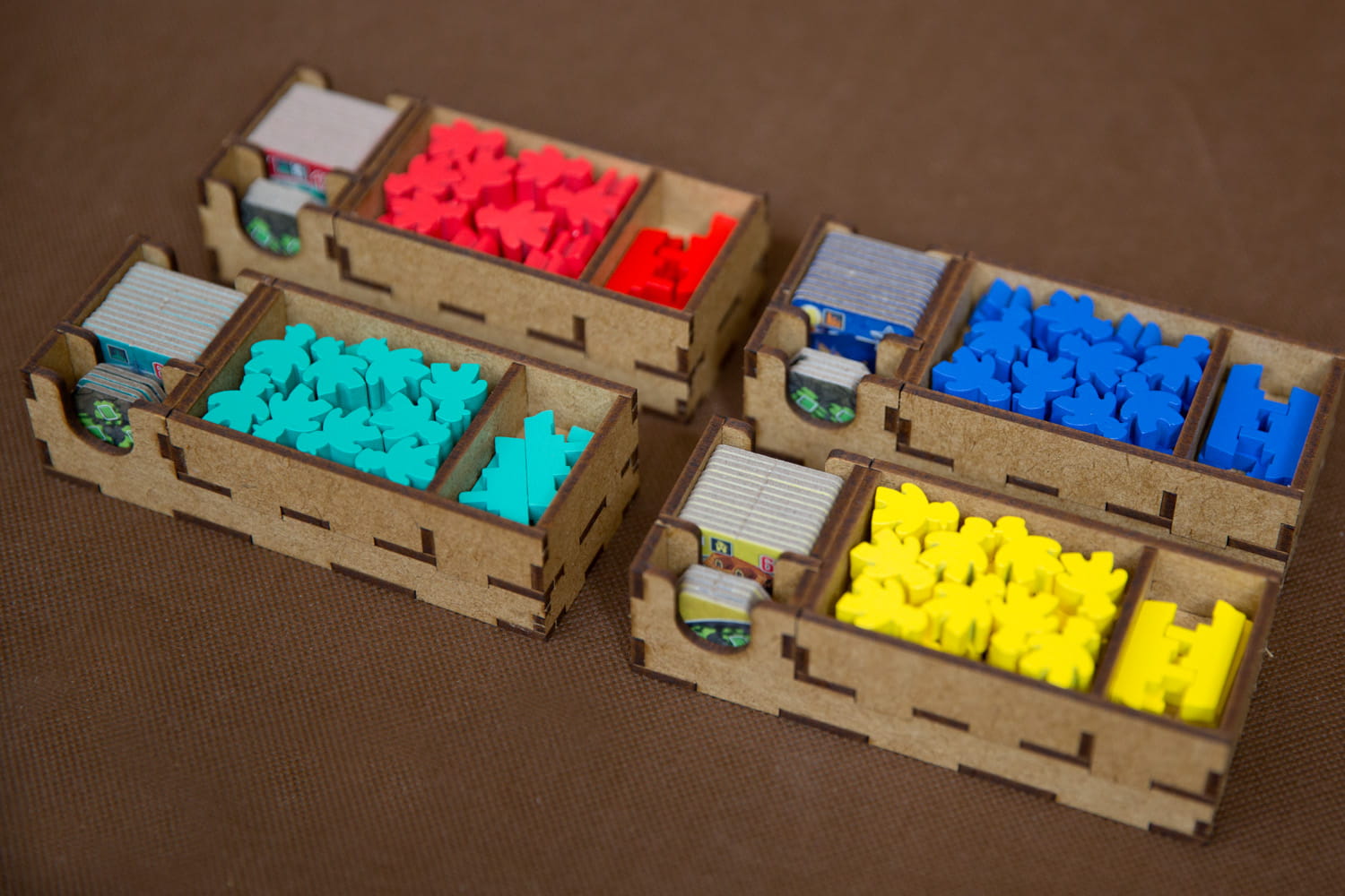 - 4 pojemniki dla każdego z Graczy z elementami do przygotowania rozgrywki: żetony Budynków Miejskich, Kopalni, Turbin oraz znaczniki Sukcesu, Punktacji, Dochodu,