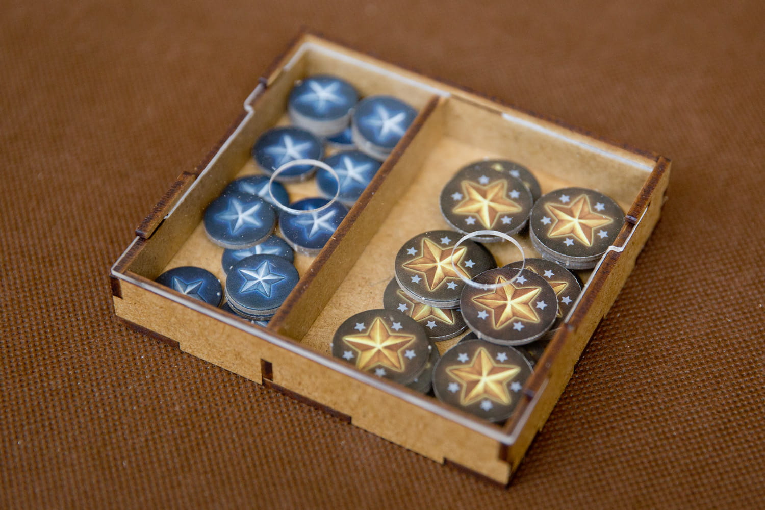 - 1 pojemnik zasuwany pleksą na żetony Talarów o wartości "5" oraz kostki Uranu,