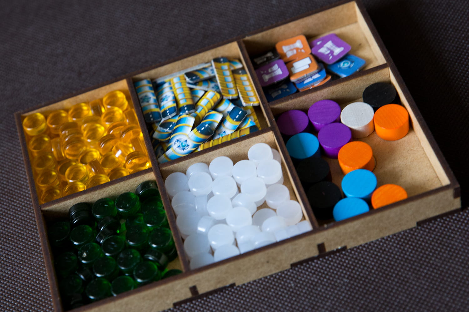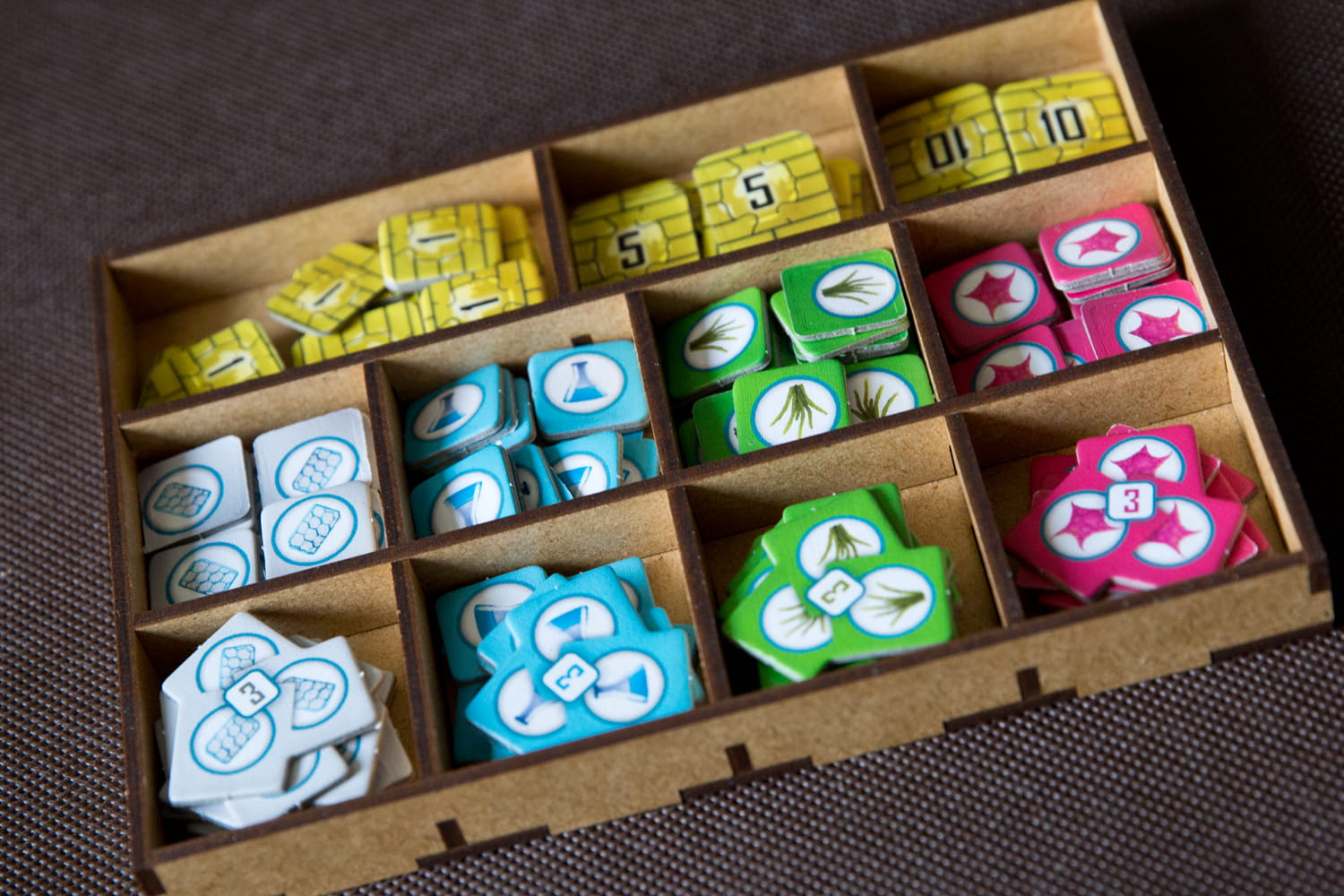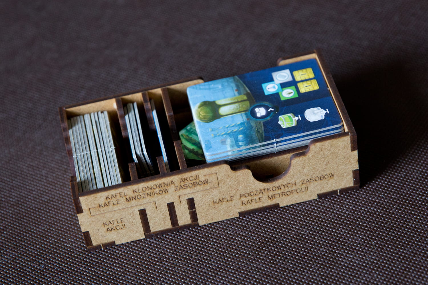 - 1 pojemnik na żetony odkryć, kafle tuneli, drewniane znaczniki oraz znaczniki farm, odsalarni, laboratoriów,