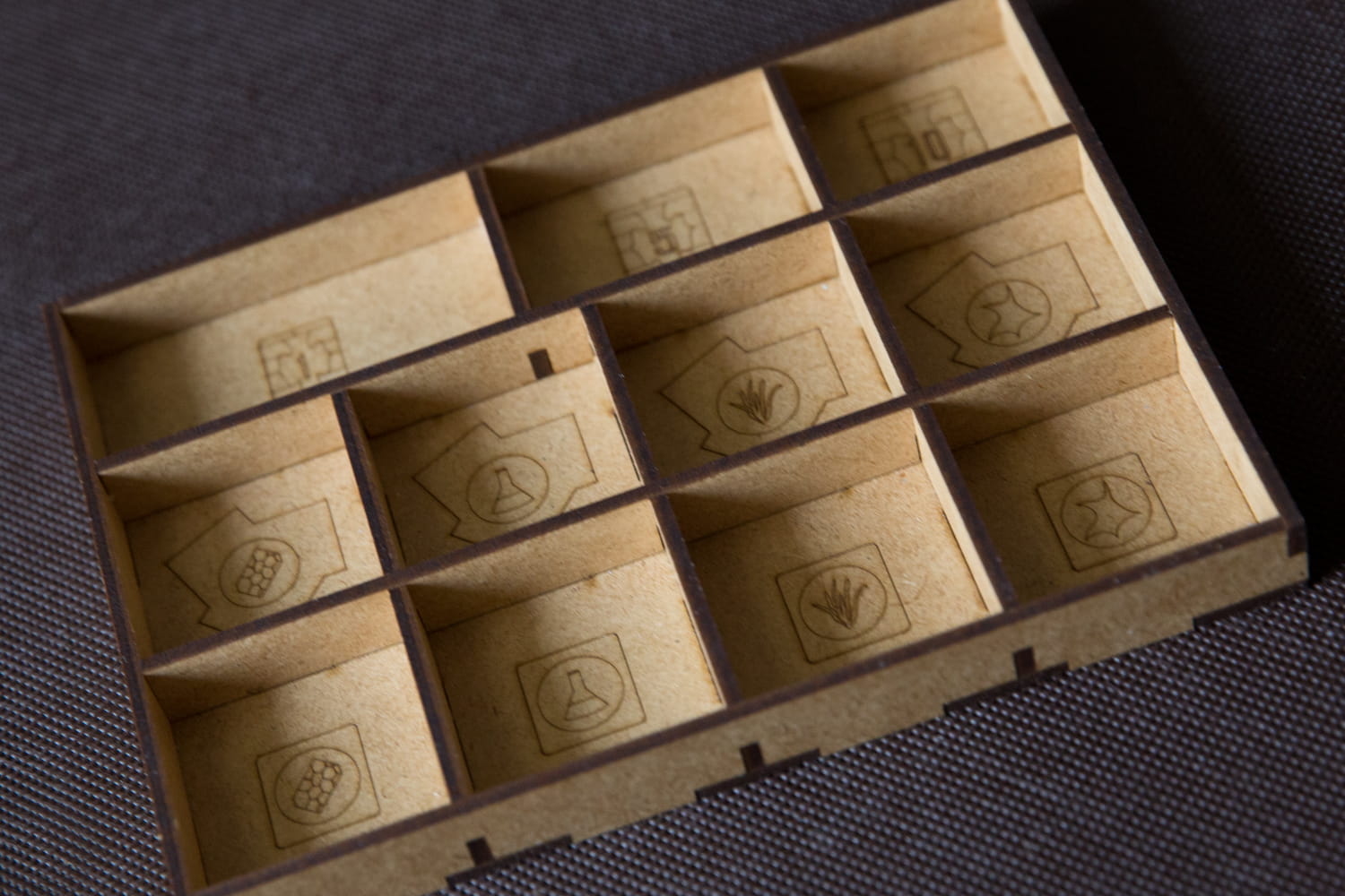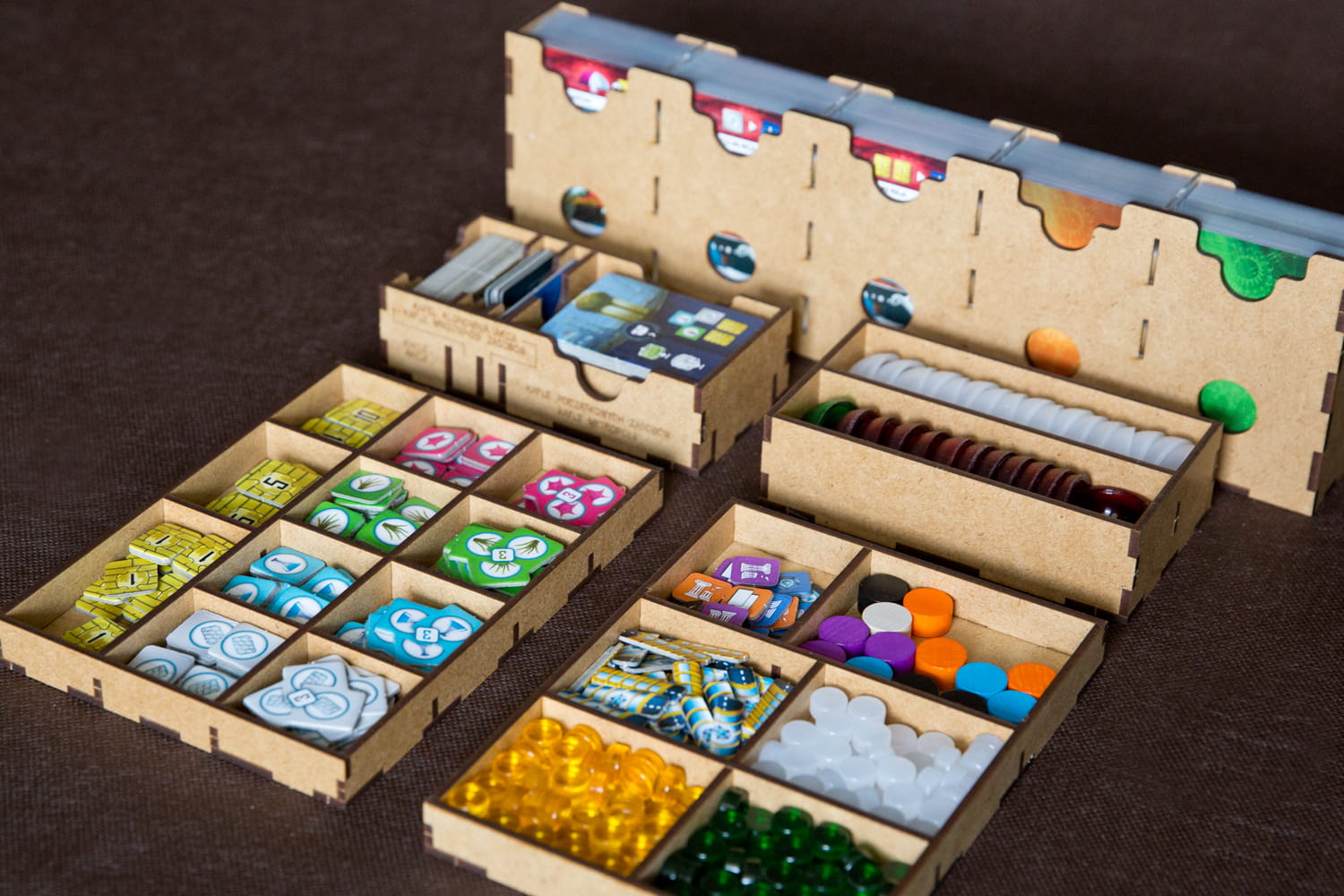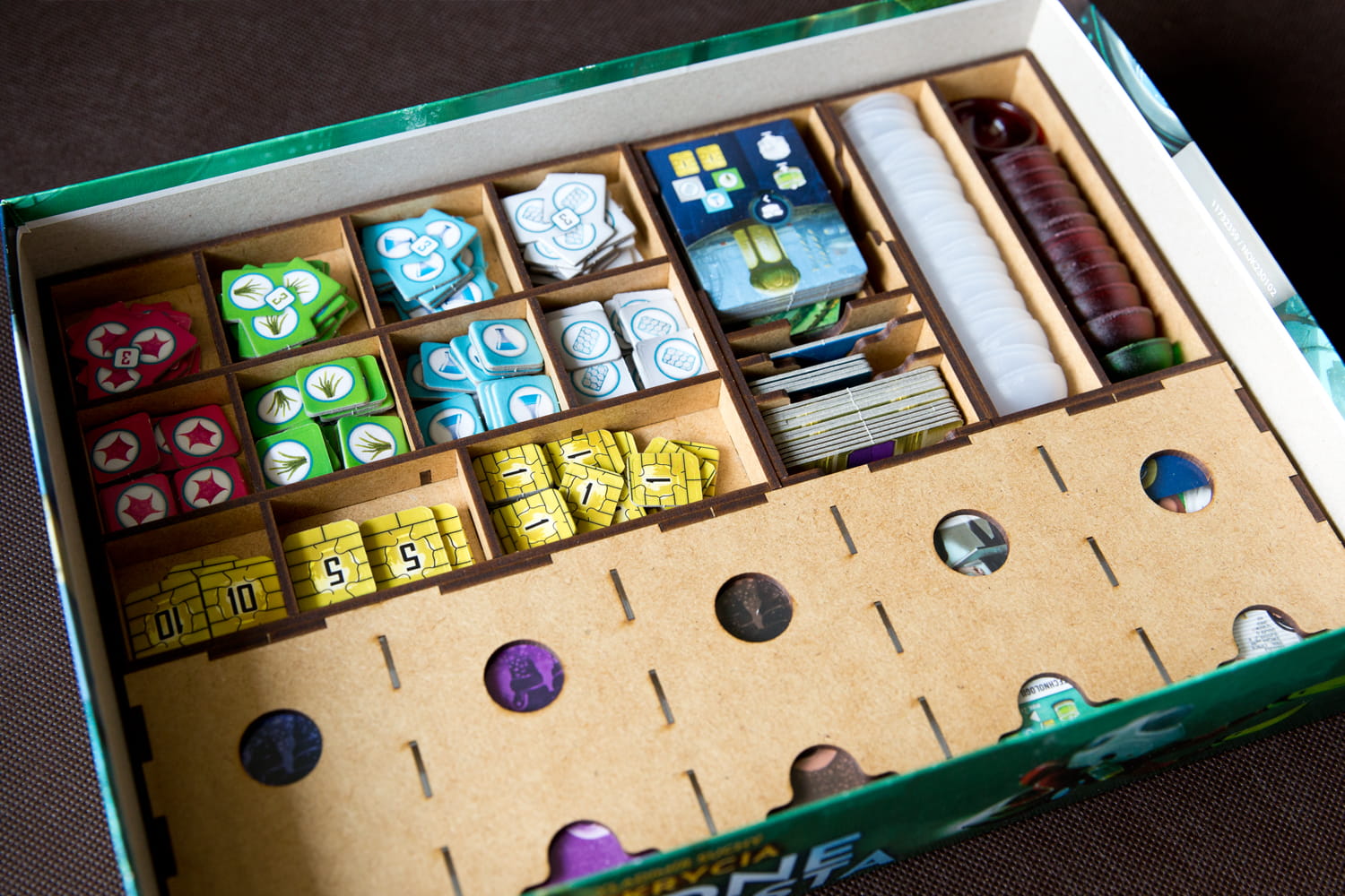 - 1 pojemnik na żetony odkryć, kafle tuneli, drewniane znaczniki oraz znaczniki farm, odsalarni, laboratoriów,