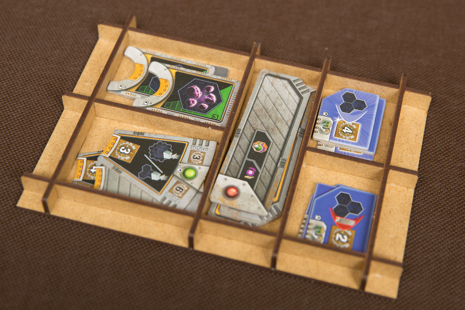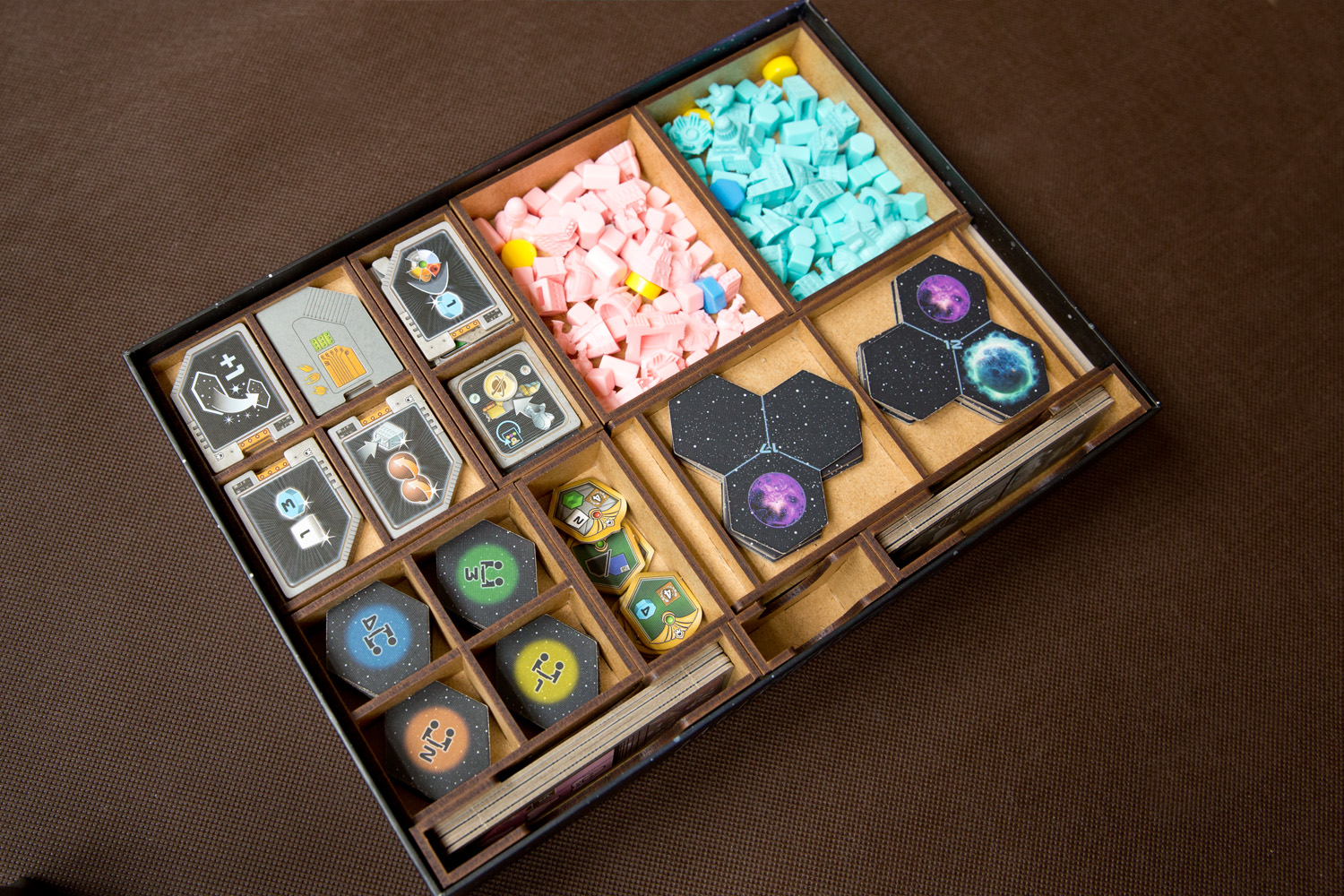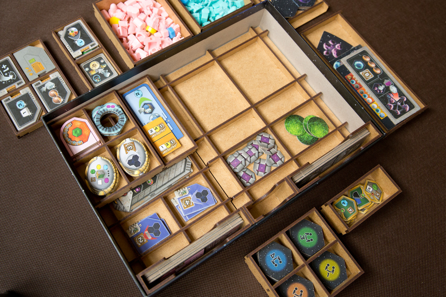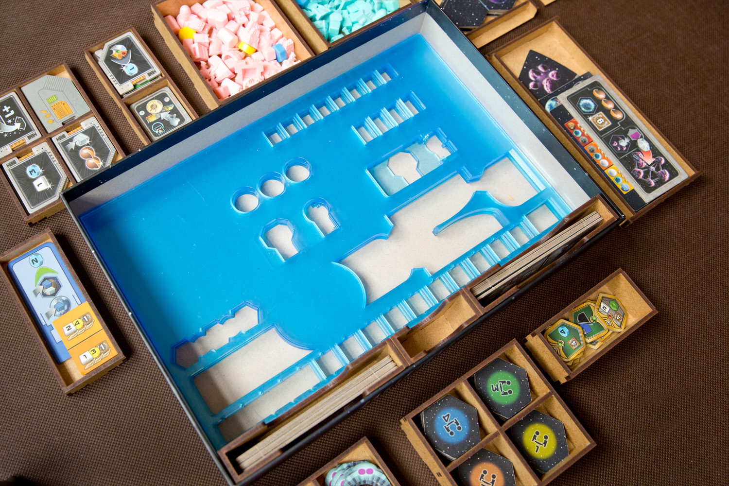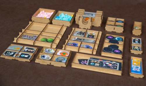 - 2 pojemniki dla każdej z Frakcji mieszczące: 8 Kopalń, 4 Placówki Handlowe, 3 Laboratoria, 2 Akademie, 1 Instytut Planetarny, 3 Gajaformery, 7 znaczników Gracza, 25 Satelitów, 2 znaczniki Kredytów, 1 znacznik Rundy, 1 znacznik Wiedzy,