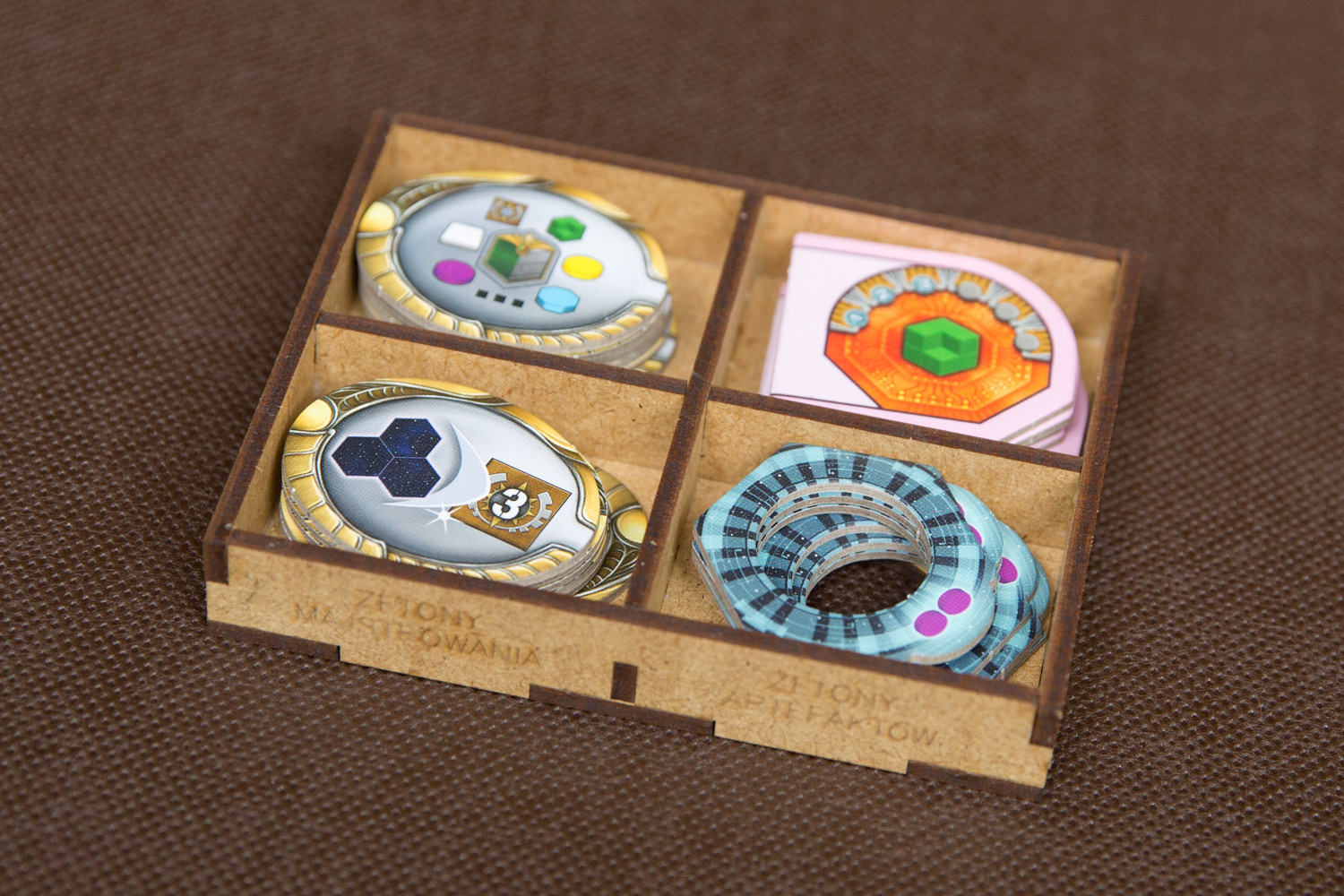 Insert zawiera pojemniki do wyłożenia na stół, które ułatwiają rozgrywkę i pomagają utrzymać porządek: