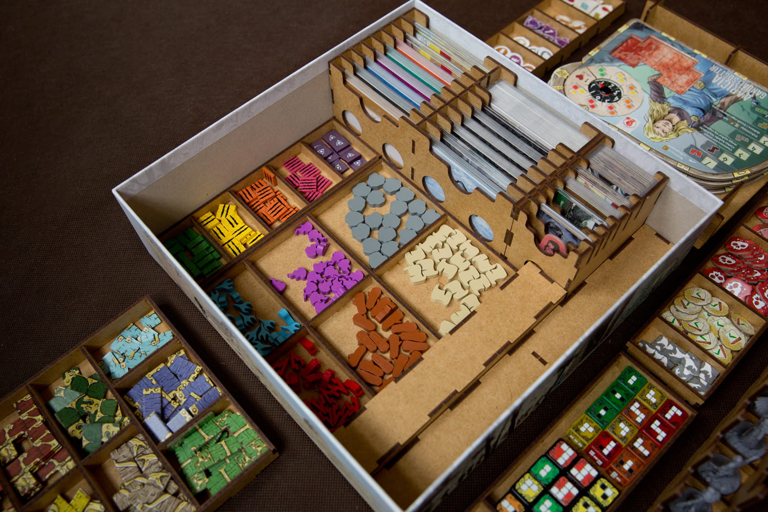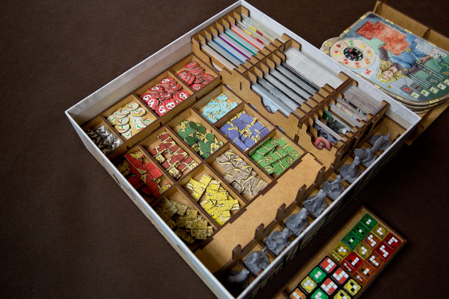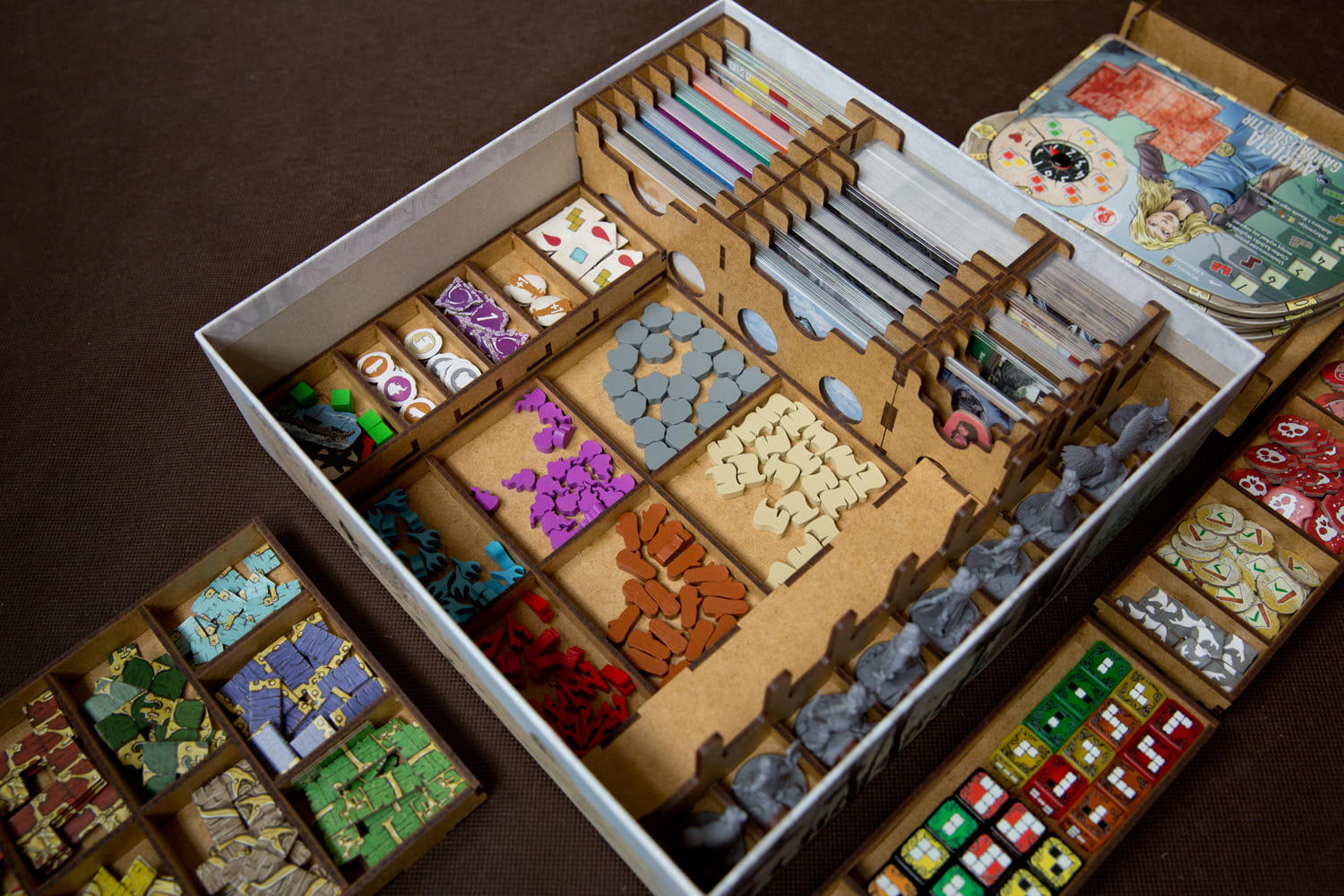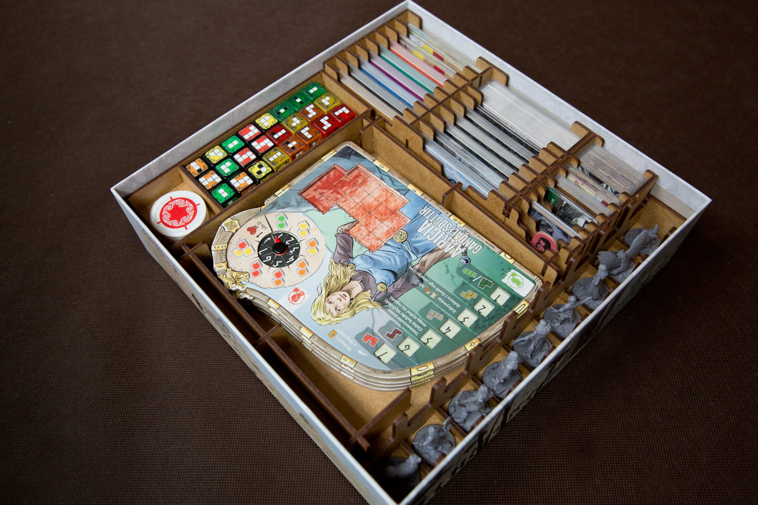 Insert pasujący do przygodowej gry Thorgal z dodatkami - wersja retail (sklepowa). Insert nie pasuje do wersji ufundowanej na platformie Gamefound. Insert mieści karty w koszulkach klasy Premium (do 110 mikronów). Na zdjęciach karty w koszulkach Portal Games (100 mikronów). Pojemniki na żetony i znaczniki pełnią również funkcję tacek do wyłożenia na stół. Insert nie przewiduje miejsca na matę. Pudełko zamyka się całkowicie.
