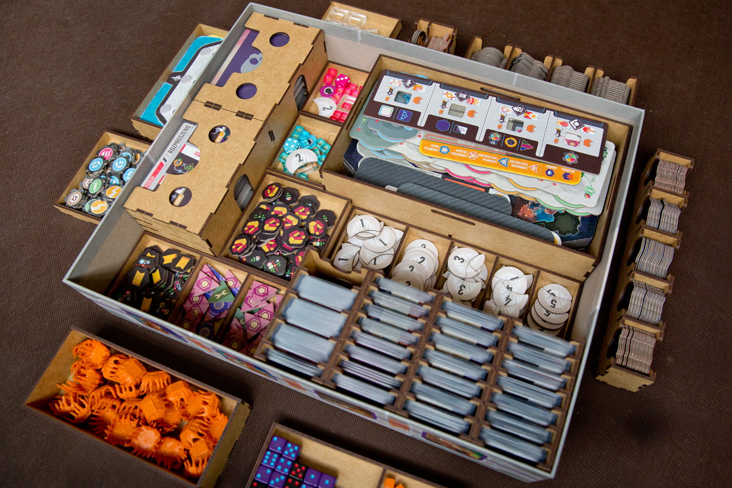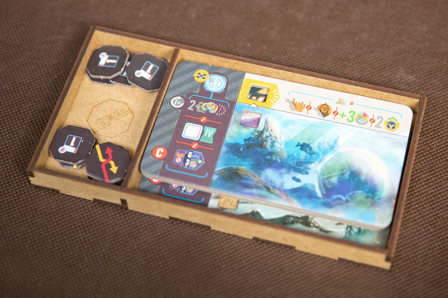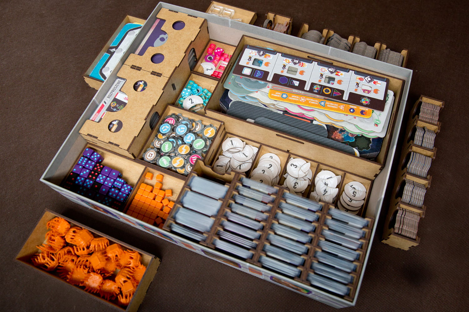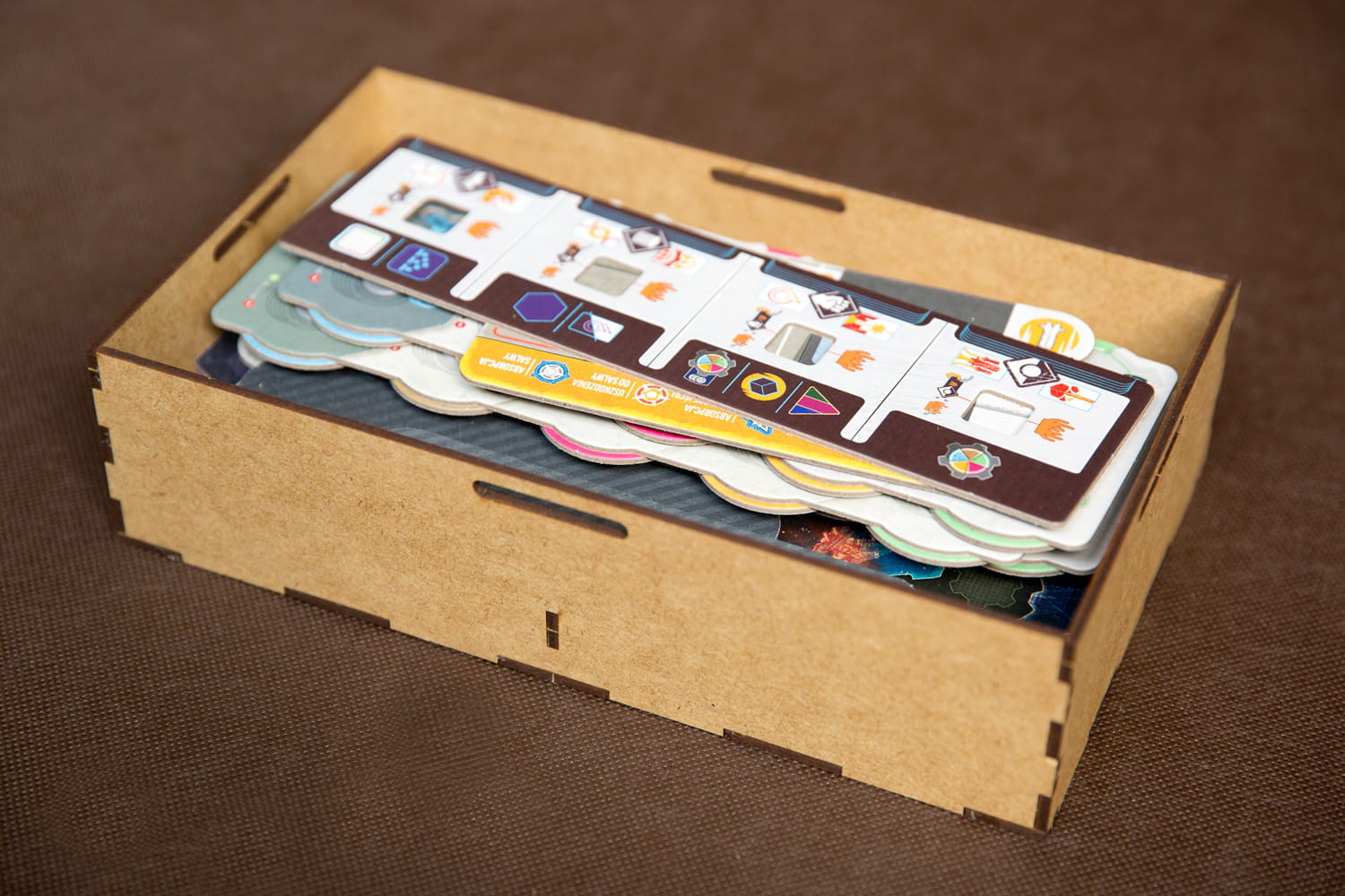 - pojemniki na karty dzielą je wg rodzajów, dodatkowo 2 małe pojemniki na karty pozwalają na podzielenie kart Upadłych Rodów Pochodzenia, Technologii wg Rodów, co znacząco pozwala skrócić przygotowanie rozgrywki,