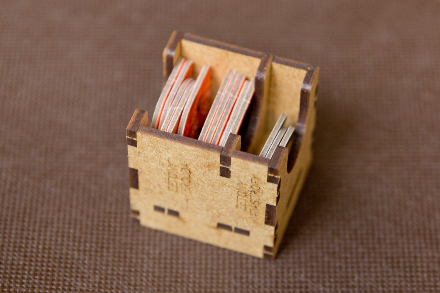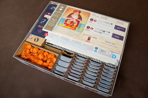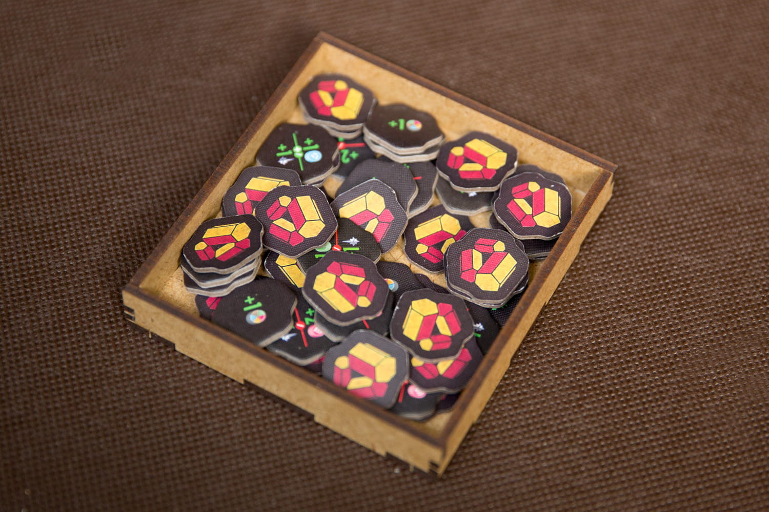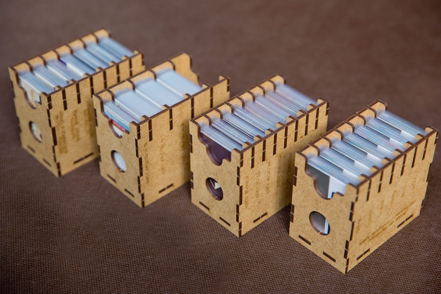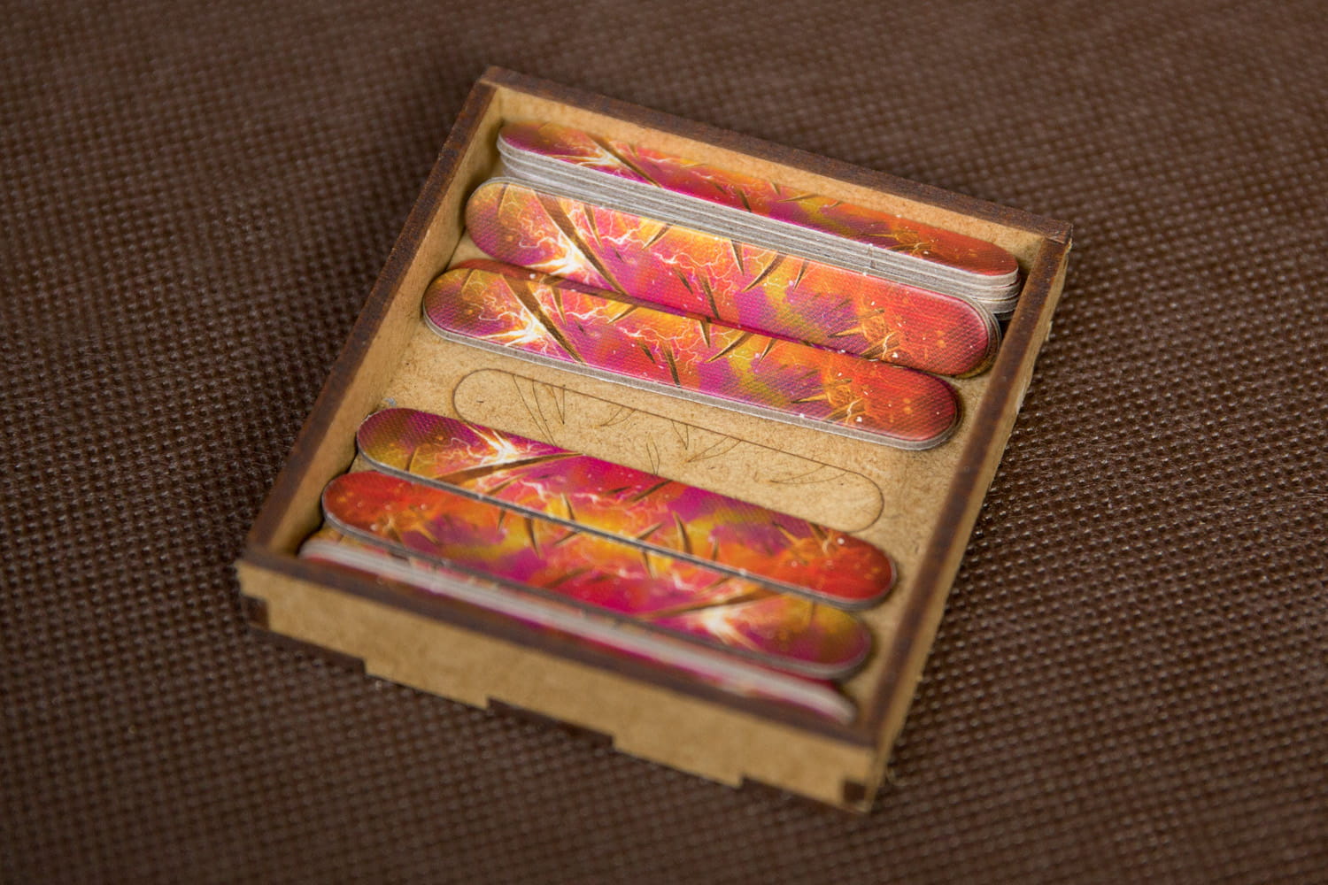 - pojemniki na karty dzielą je wg rodzajów, dodatkowo 2 małe pojemniki na karty pozwalają na podzielenie kart Upadłych Rodów Pochodzenia, Technologii wg Rodów, co znacząco pozwala skrócić przygotowanie rozgrywki,