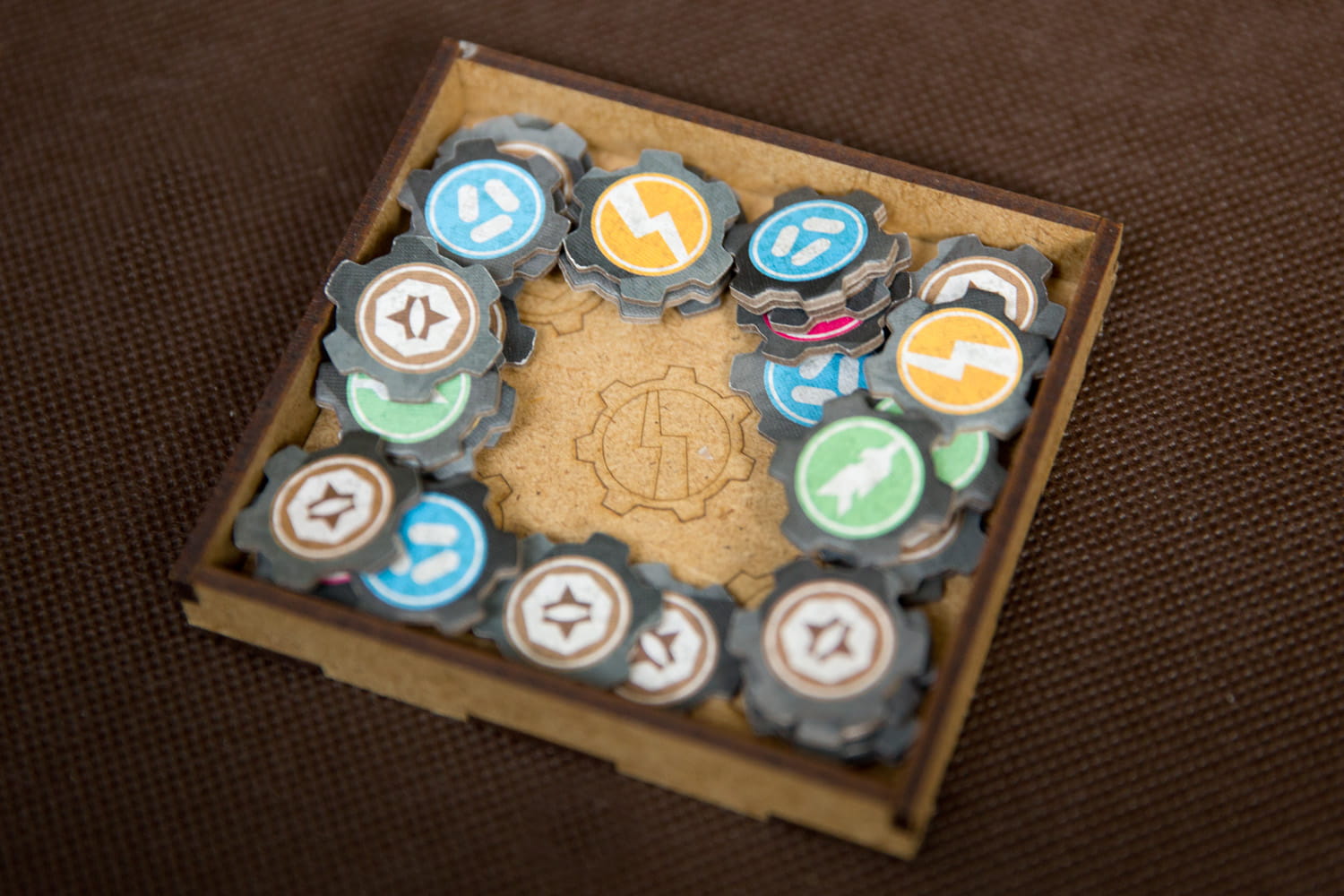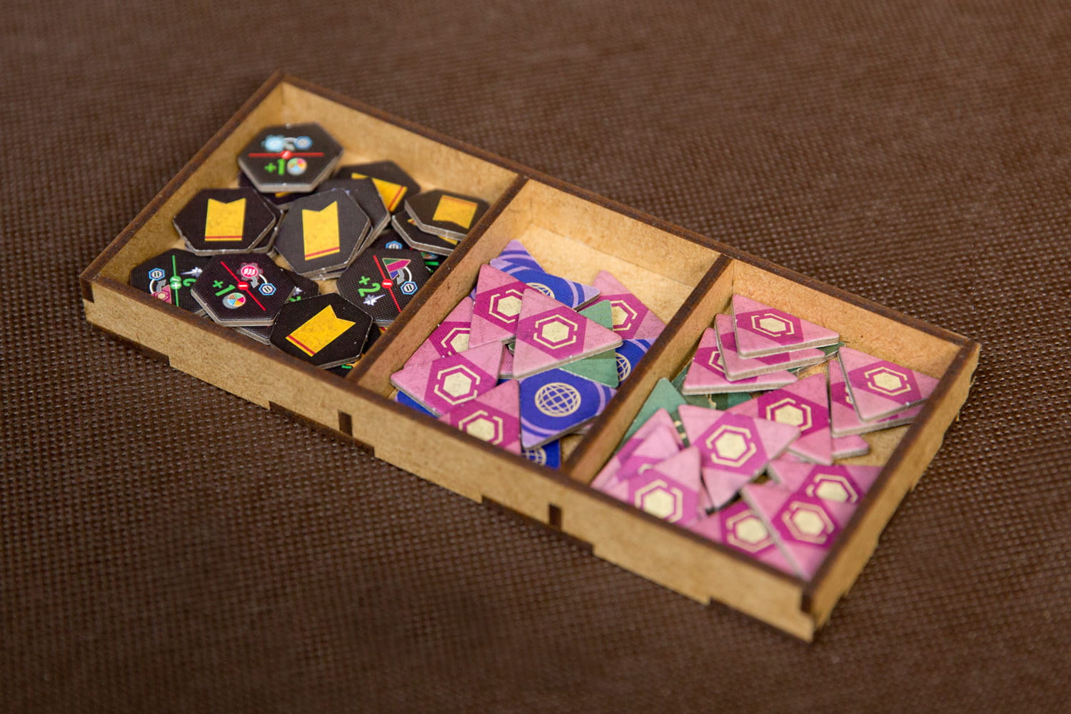- 1 pojemnik na kafle Sektorów, plansze Zasobów, kafle Starcia, kafel Blokady Ulepszenia, planszę Agendy,
