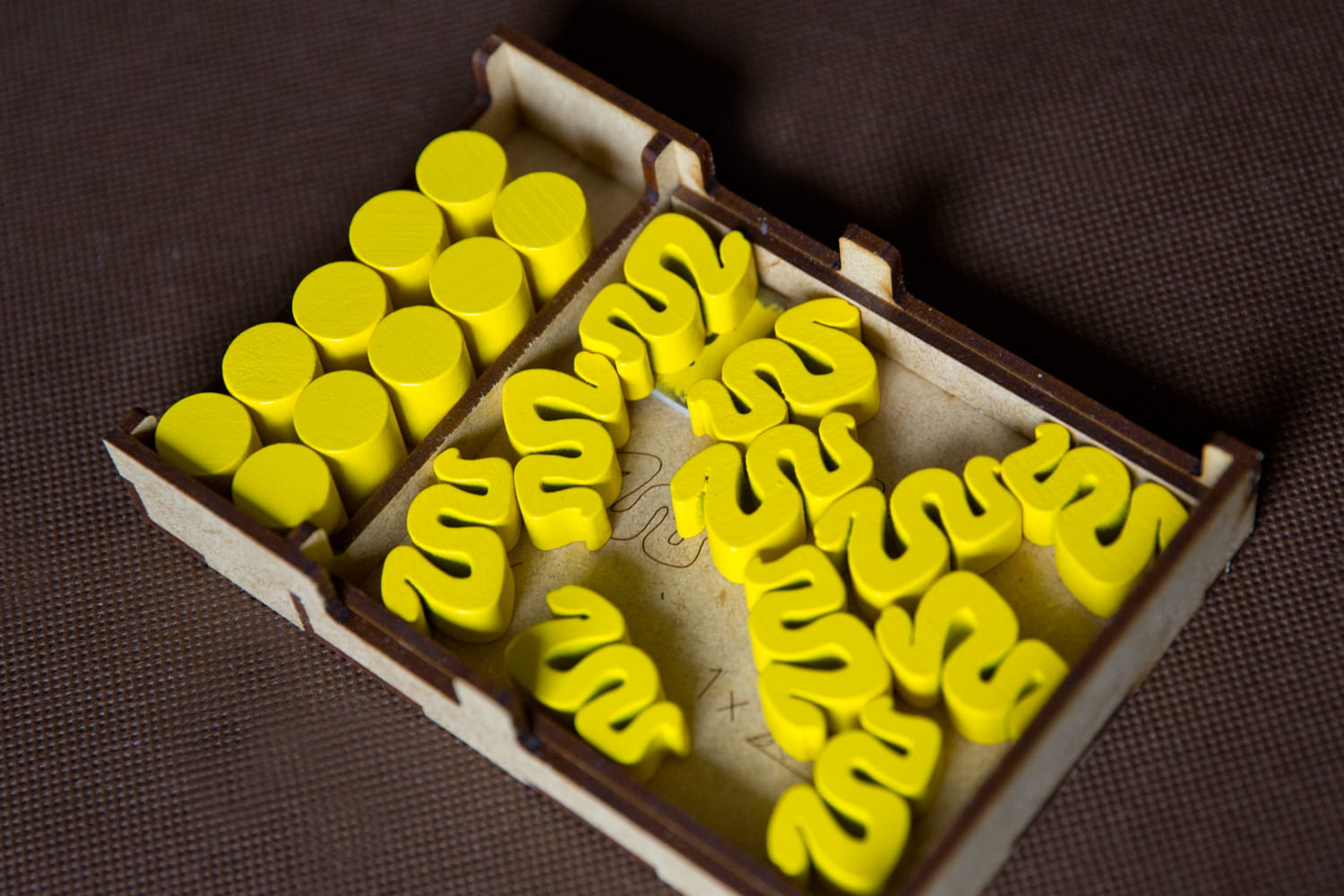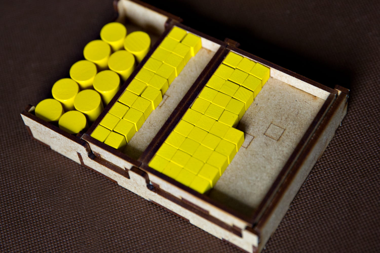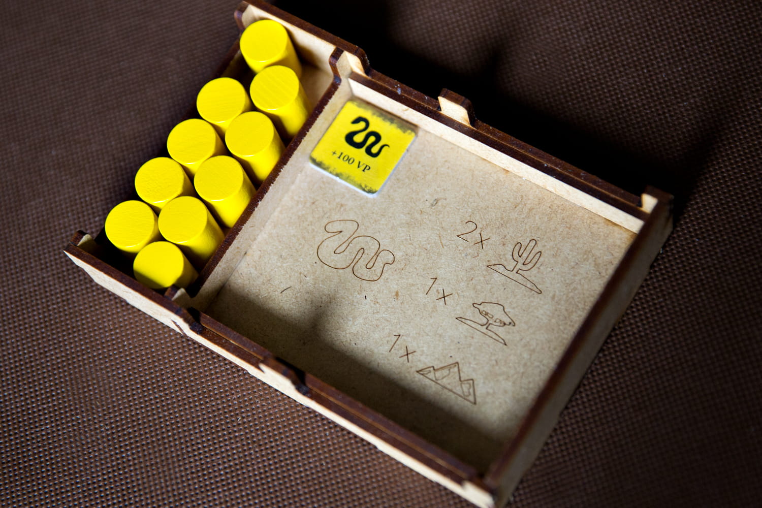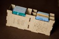 - pojemnik na duże kafle posiada grawery informujące o ilości pionów akcji i wielkości puli genów w zależności od ilości graczy oraz grawer obrazujący rozłożenie kafli startowych wraz żetonami zasobów (grafiki są zakrywane na planszy kaflami i ich nie widać) co ułatwia przygotowanie rozgrywki bez zaglądania do instrukcji,