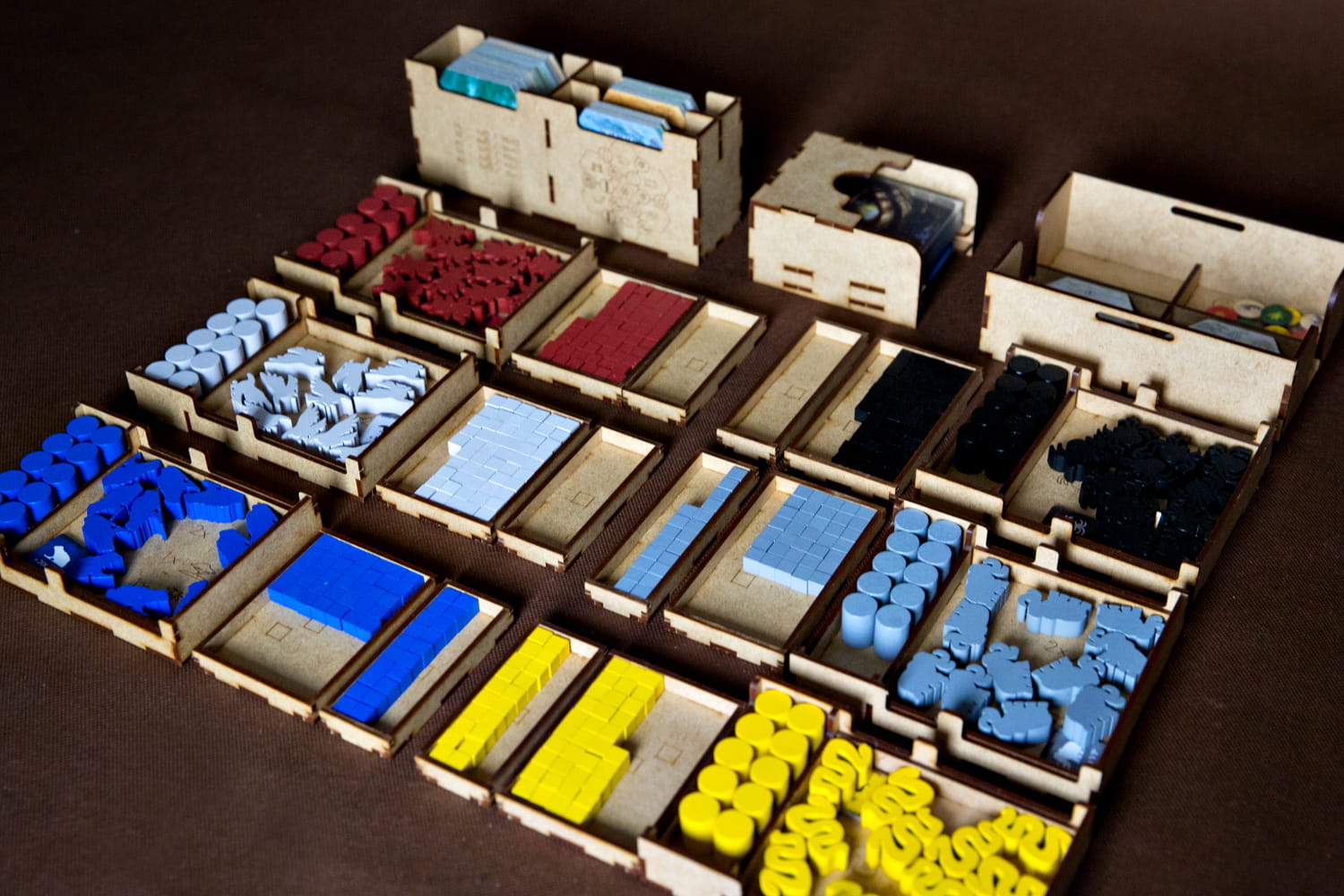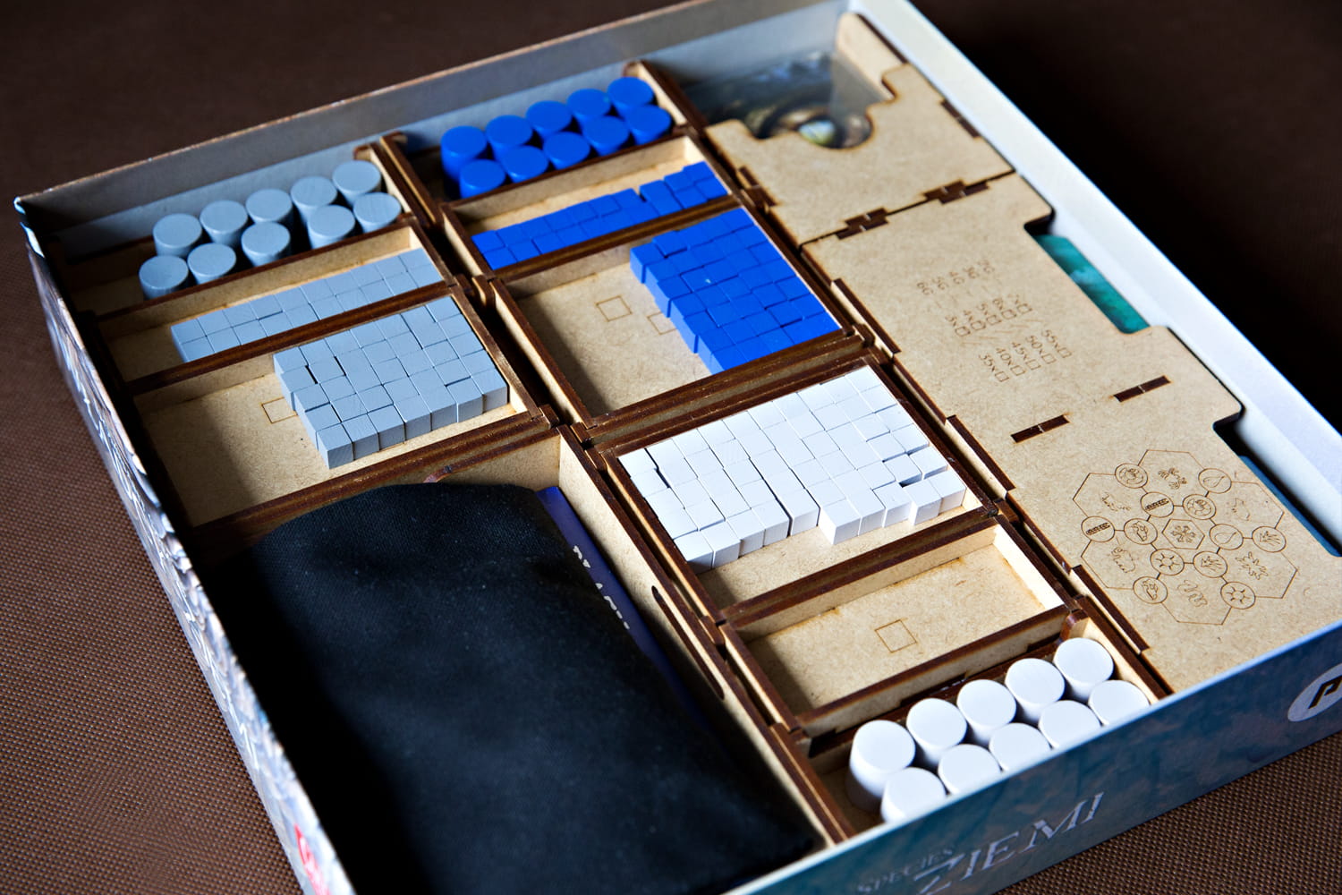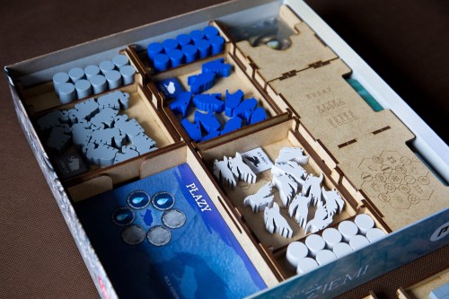 - pojemnik na kafle tundry, planszetki gromad oraz worek z żetonami zawiera przedział pozwalający odłożyć 12 żetonów zasobów Ziemi używanych na etapie przygotowania do rozgrywki,