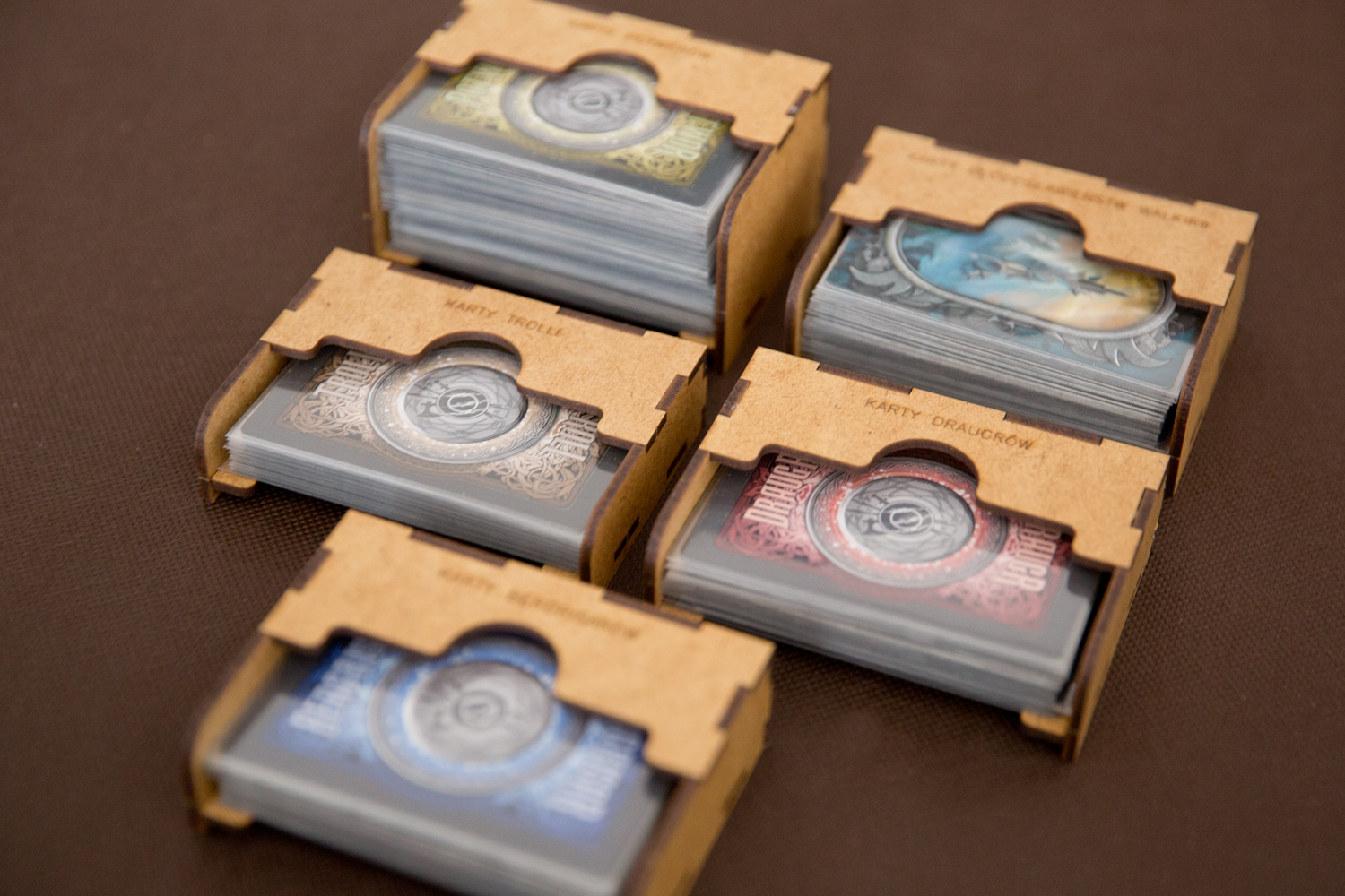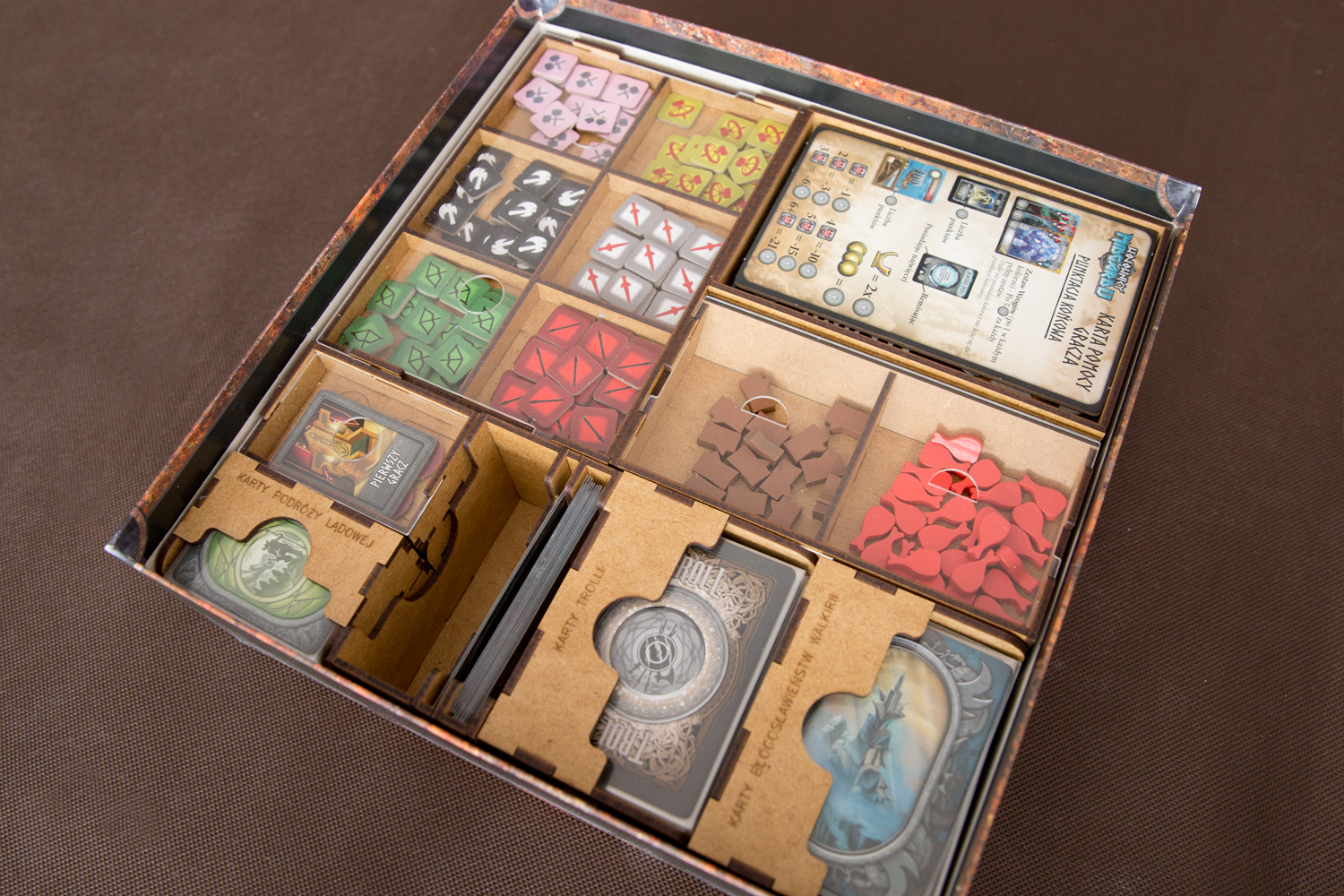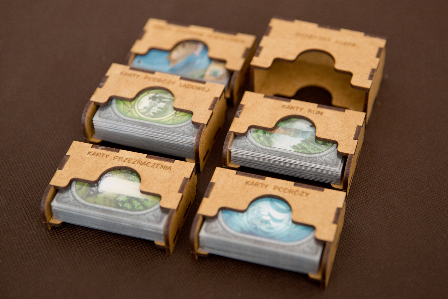 - pojemniki na poszczególne talie pełnią funkcję podajników i są gotowe do wyłożenia na planszę. Dna w podajnikach na karty ułożone są pod kątem - pozwala to na wygodne pobieranie wierzchniej karty bez wysuwania całego stosu, a same podajniki zabezpieczają przed rozsypywaniem się stosu kart.