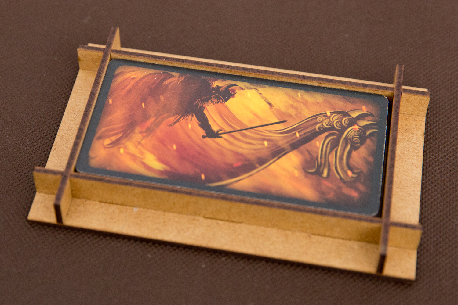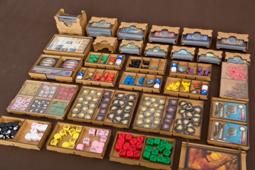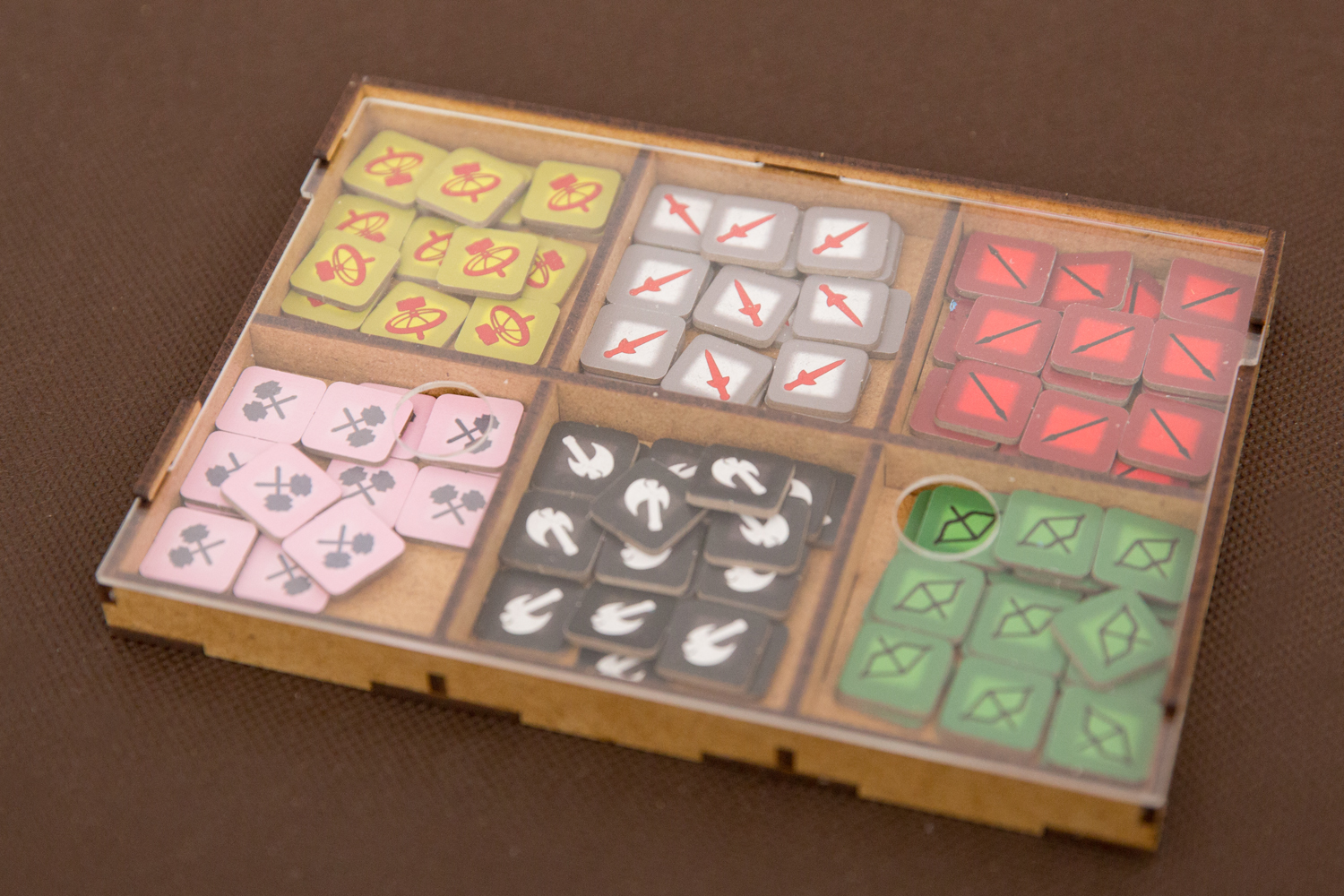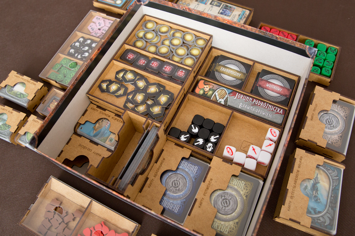 - pojemniki na poszczególne talie pełnią funkcję podajników i są gotowe do wyłożenia na planszę. Dna w podajnikach na karty ułożone są pod kątem - pozwala to na wygodne pobieranie wierzchniej karty bez wysuwania całego stosu, a same podajniki zabezpieczają przed rozsypywaniem się stosu kart.
