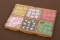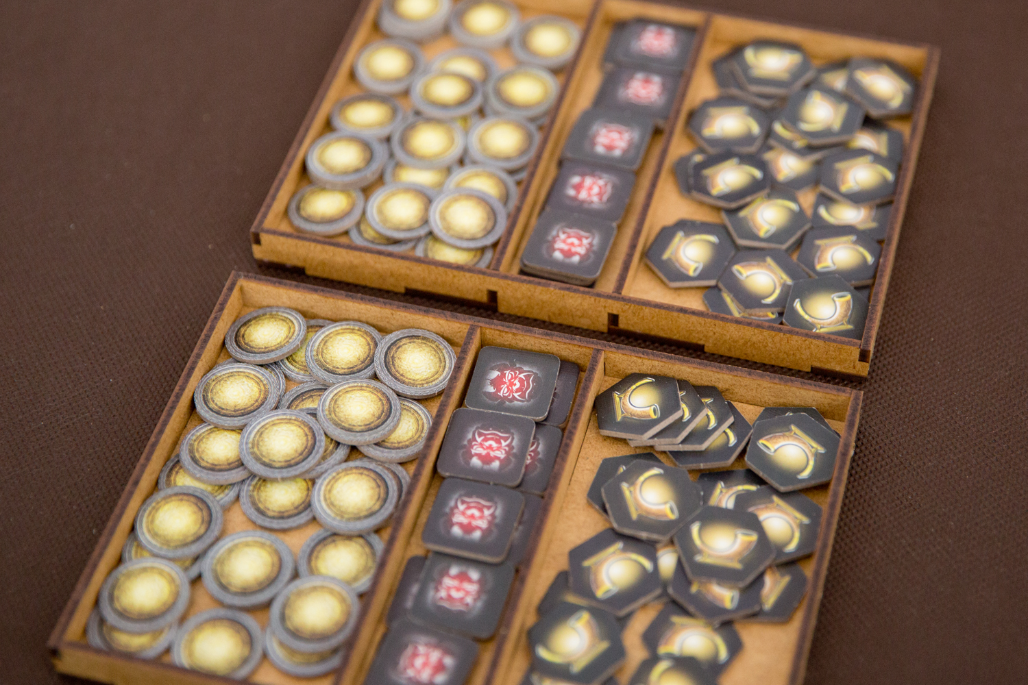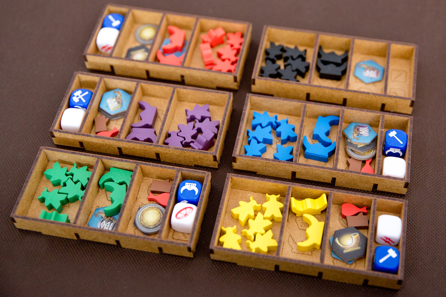 - pojemniki na kości, żetony, znaczniki pełnią również funkcję tacek do wyłożenia na stół,