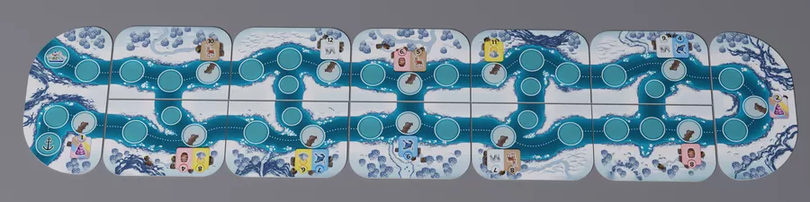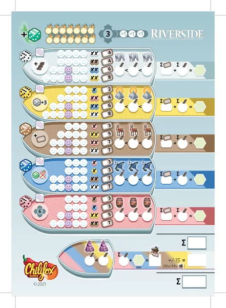 Riverside is a different kind of roll-and-write game: The game comes with a modular game board, which composes the route for the game. On a river cruise boat, everyone follows the same route, but you can take your tourists on different tours. You may plan ahead, but beware, the dice may force you to change your plans.
