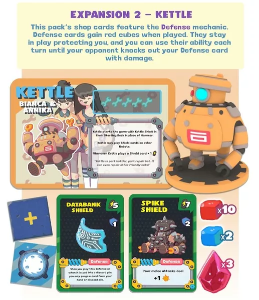 This pack's shop cards feature the Defense mechanic. Defense cards act as extra HP, staying in play to protect you AND grant you extra abilities! Until your opponents smash them that is...