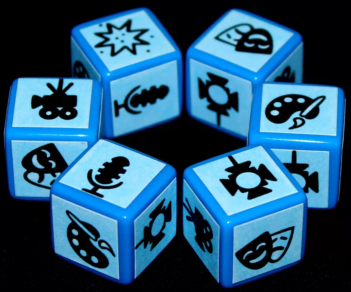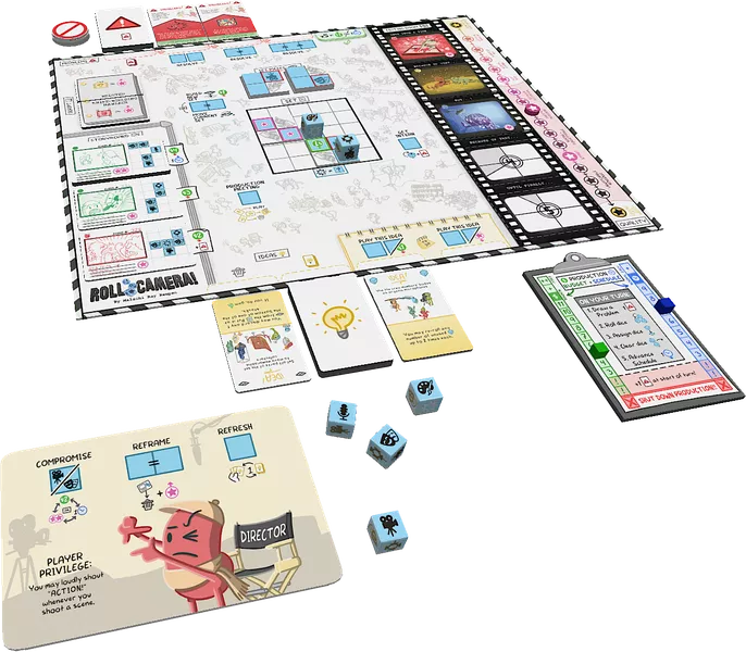 Roll Camera! is a cooperative or solo dice worker placement game of resource management and a central geometric puzzle representing your shooting arrangement. You throw the custom D6 Crew dice, each face representing a different production department (camera, light, sound, actor, production design, visual effects) and assign them to actions, either on the main board or on your individual player boards. Your player board features a specific head of department (Director, Producer, Cinematographer, Editor, Production Designer or The Star) and contains unique action spaces that can be used on your turn.