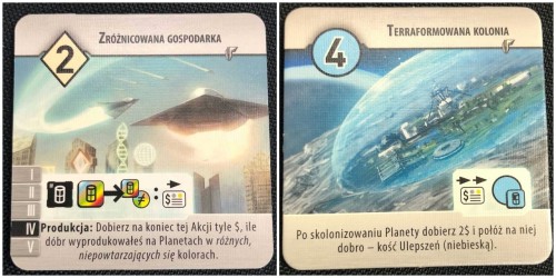 Dwustronny kafelek promocyjny Terraformowana Kolonia/Zróżnicowana gospodarka do gry Roll for the Galaxy.