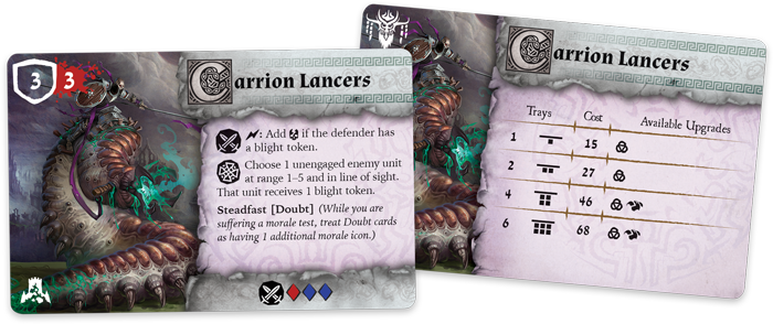 The Carrion Lancers Unit Expansion features two Carrion Lancer Plastic Figures, one new and one identical to the core set, to expand your legions of the undead. The expansion also features eight new upgrade cards to improve your armies and crush your enemies underfoot.