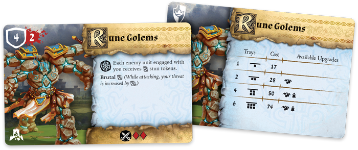 The Rune Golems Unit expansion features two Rune Golem Plastic Figures, one sculpt new to this expansion and one identical to the Rune Golem sculpt found in the Core set, as well as eight upgrade cards to help you build your army anyway you choose. Crush the enemies of Daqan beneath your feet with the Rune Golems Unit expansion.
