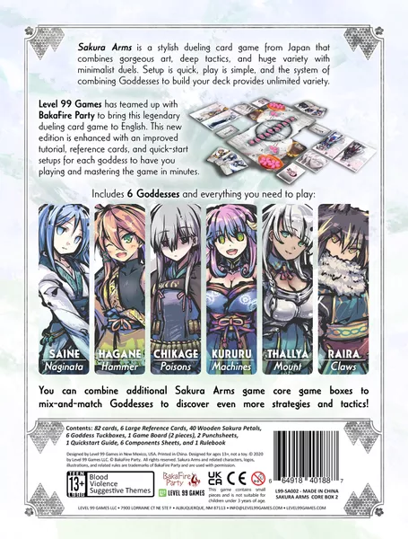 Level 99 Games has teamed up with Bakafire Party to bring an all new production of the legendary Sakura Arms to English. The new edition features an enhanced rulebook and tutorials, quick start setups for each goddess, and improved production quality.