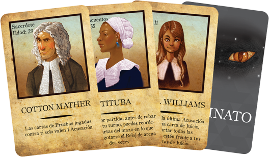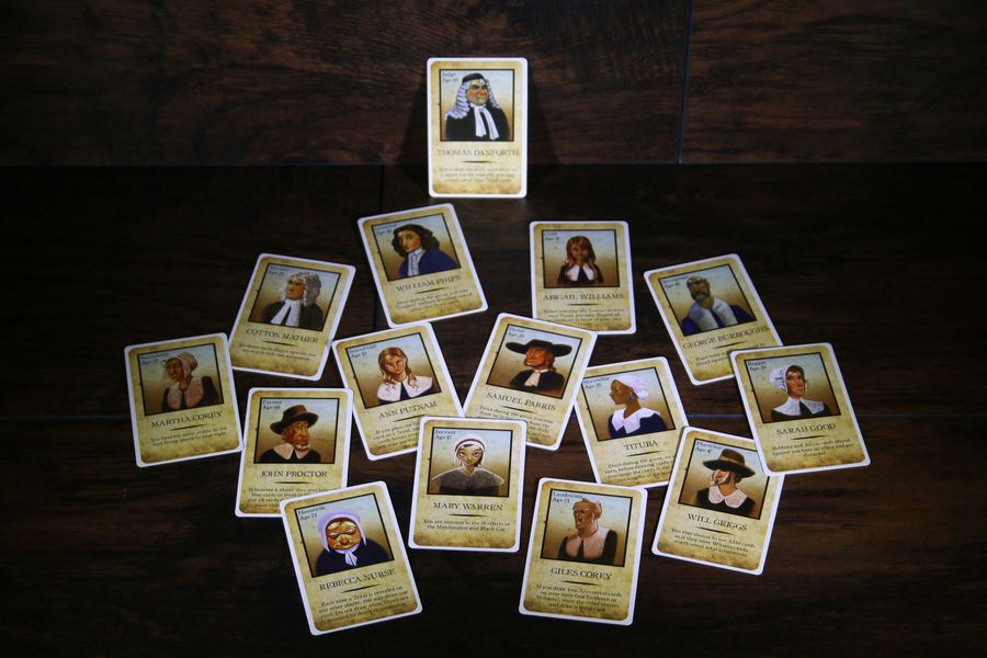 Players, each acting as one of these unique characters, are given 3-5 Tryal cards (depending on the number of players). These Tryal cards reveal the true identity of each player, "Witch" or "Not a Witch."