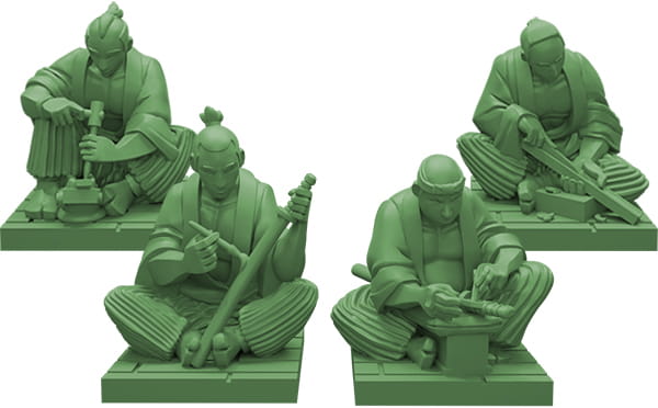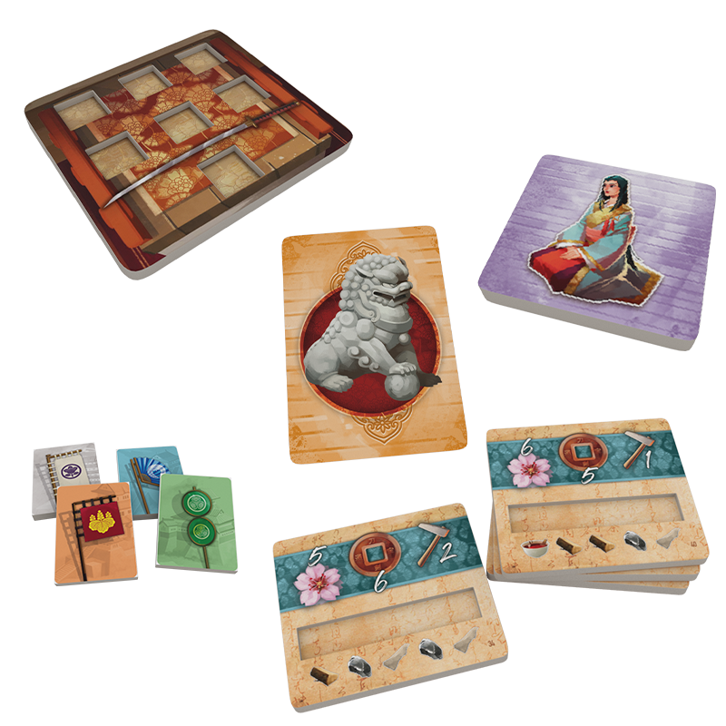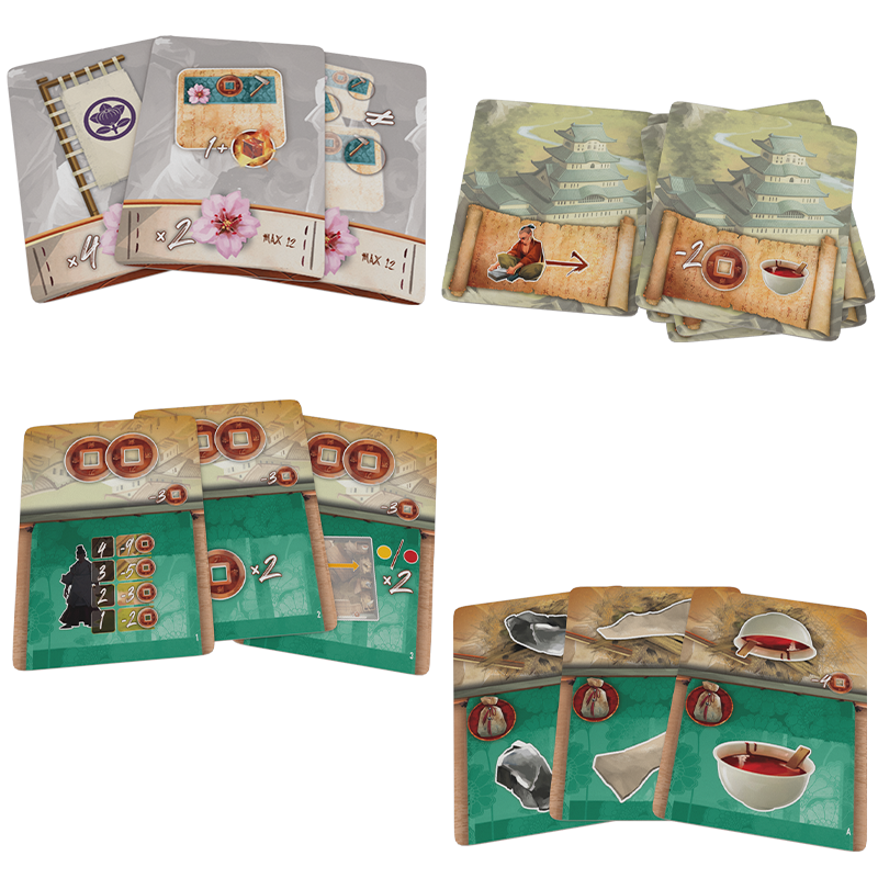 During the game you will obtain resources, either by visiting the market, the palace among other places. By activating a row or column you can add resources to all matching Katanas, moving them accordingly on the grid. But be careful! Having a lot of Katanas on the grid means that you can accomplish more with fewer actions, but it also increases the risk of them hindering each other. You will have to build your engine cleverly to maximize your turns.