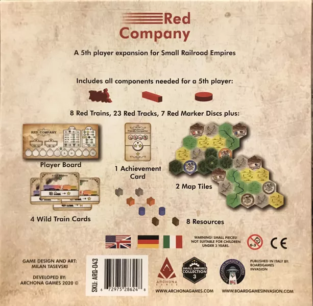 Expansion for Small Railroad Empires featuring 5th player pieces, and extra components such as: new achievement card, and 4x new train (wild) cards.