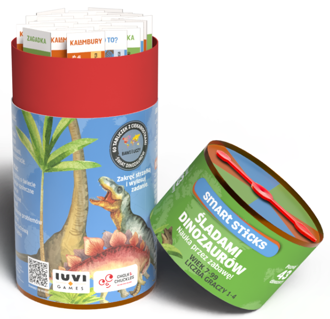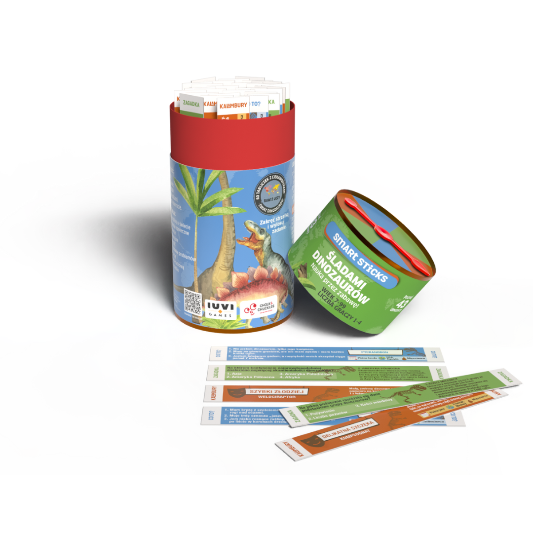 Smart Sticks: Śladami dinozaurów to edukacyjna gra, która łączy naukę z zabawą w atrakcyjnej i interaktywnej formie. W zestawie znajdują się trwałe, kolorowe tabliczki z ciekawostkami o różnych gatunkach dinozaurów. Każda z nich zawiera informacje o wyglądzie, zachowaniach i środowisku życia dinozaurów, co pozwala dziecku poszerzać wiedzę i rozbudzać pasję do nauki.Na odwrocie każdej tabliczki kryje się fragment mapy, która po ułożeniu pozwoli odkryć fascynujący świat dinozaurów.