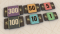 Wooden Money Upgrade - Includes 116 wooden double-sided silkscreened tokens in six denominations ($1s, $5s, $10s, $50s, $100s, and $300s) as upgrades to the punchboard currency in Speakeasy. Each band of bills is 4mm thick in the same size and shape as the punchboard currency in the game. The set comes in a thematic cloth bag with a drawstring closure.
